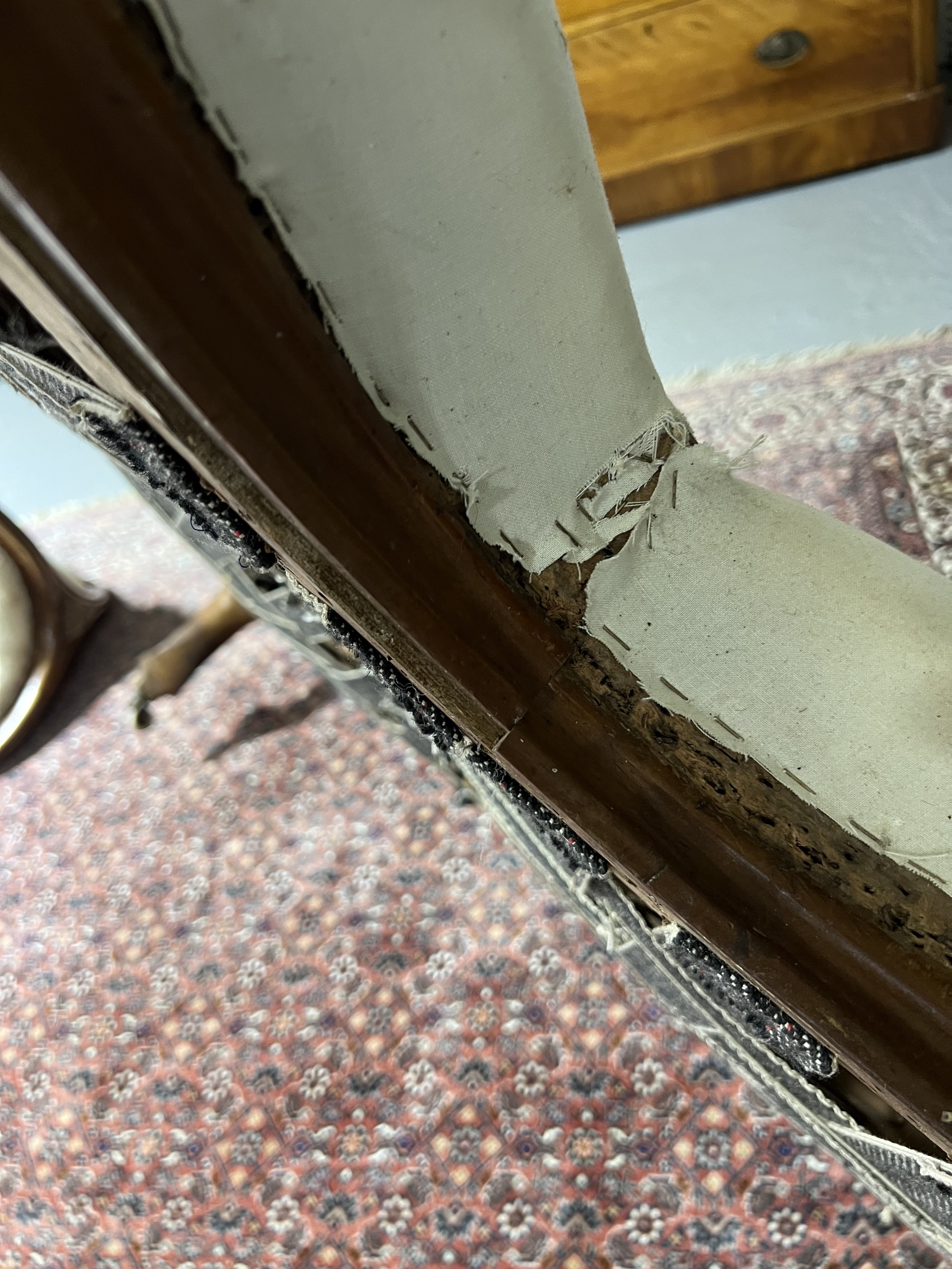 old marks and scratches around the frame, back rest centre piece not currently fixed in place, has a crack/split to one support, some losses around the bottom edge, all three castors present and fixed in place, see images.