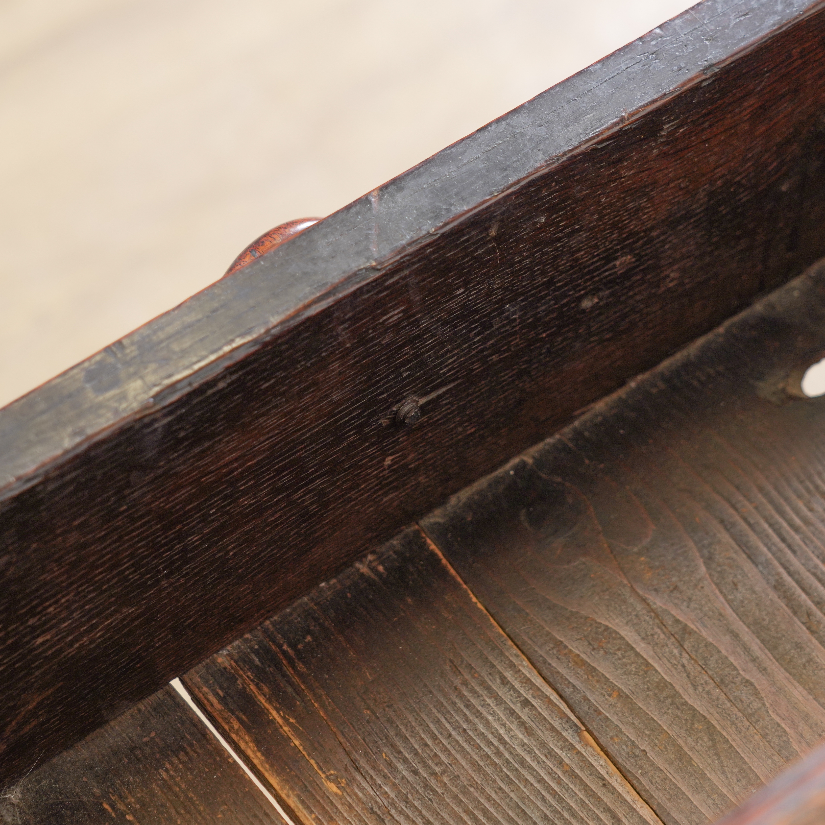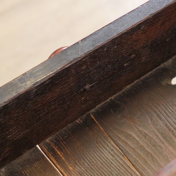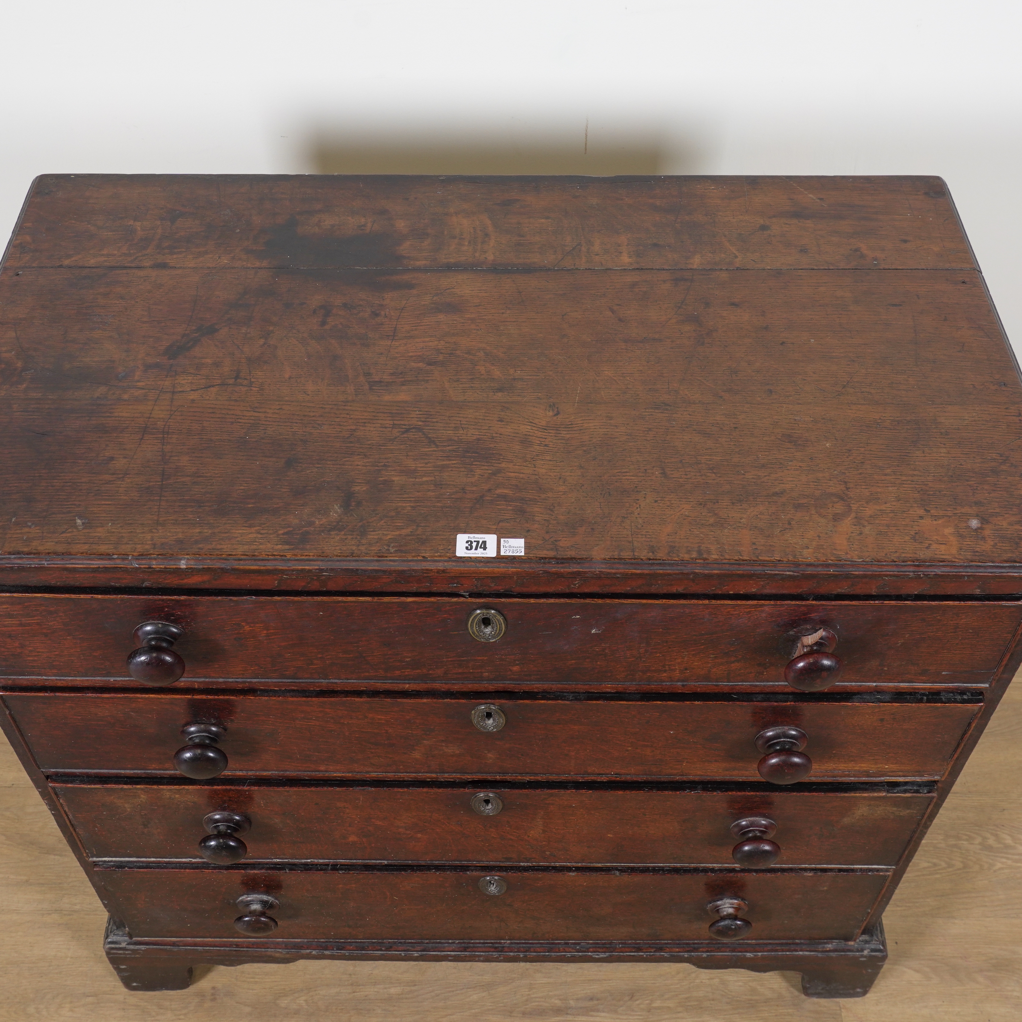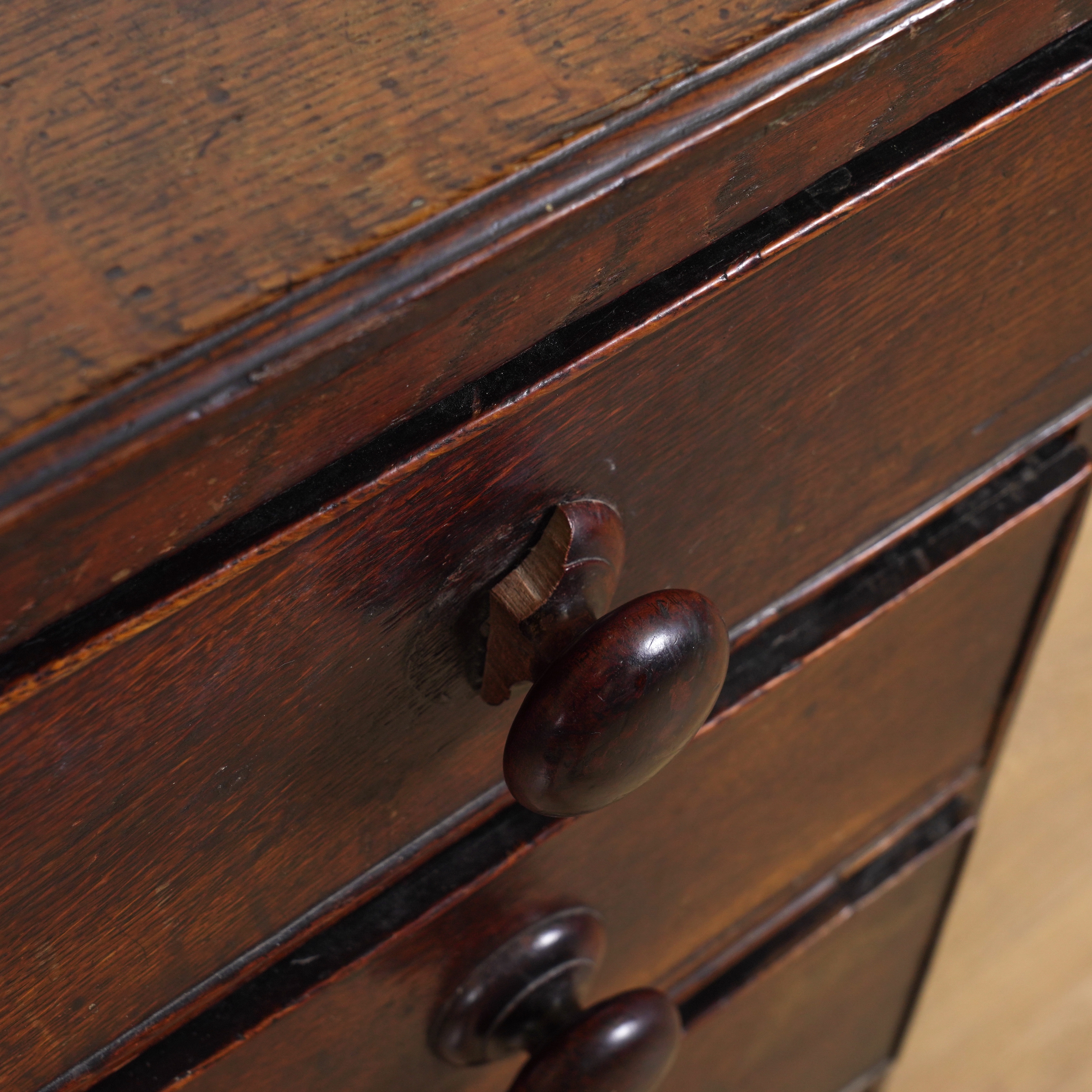 old marks and scratches present expected with the age, signs of old repairs around the drawer front mouldings, three handles suffer with damages/losses.