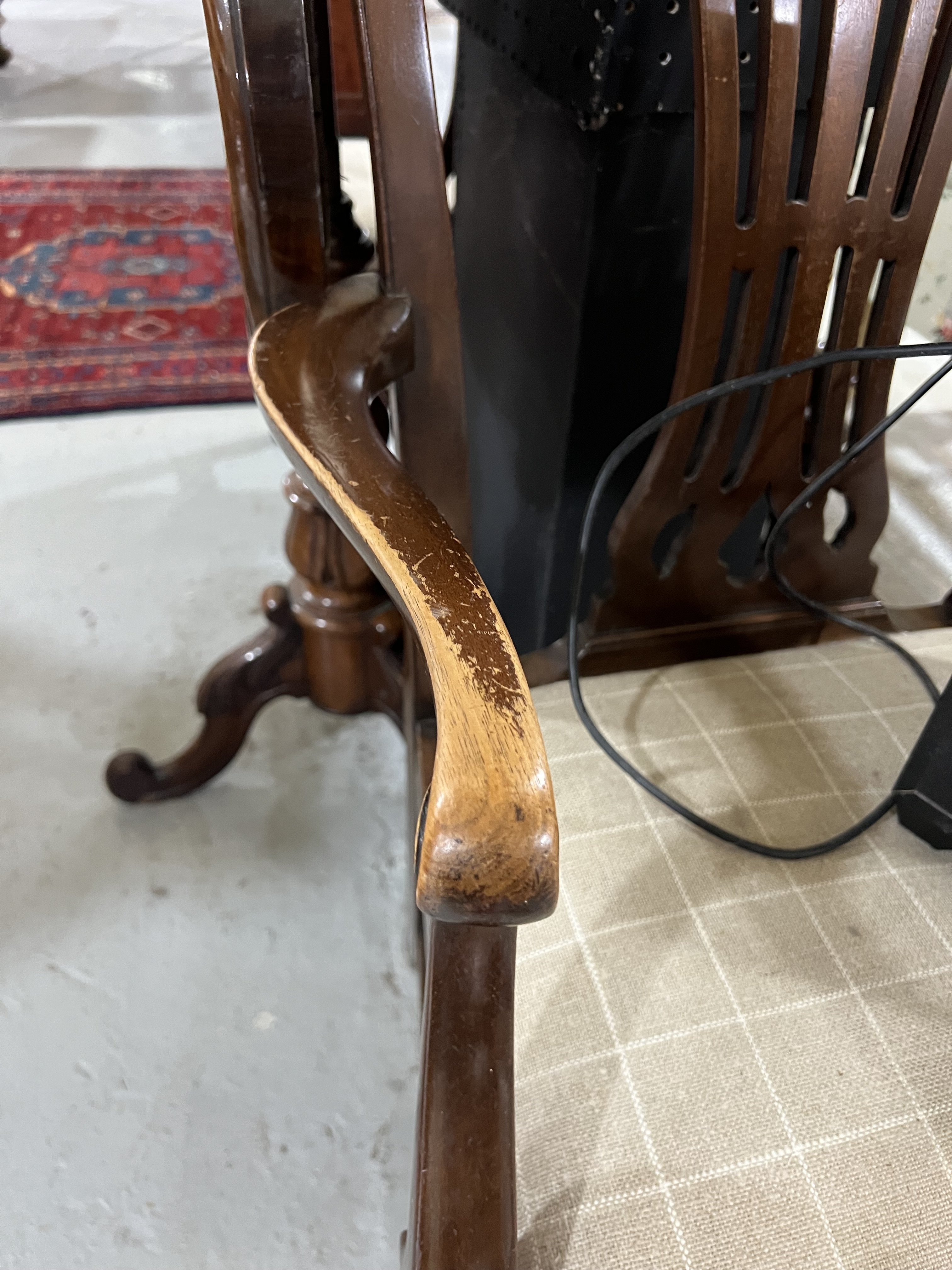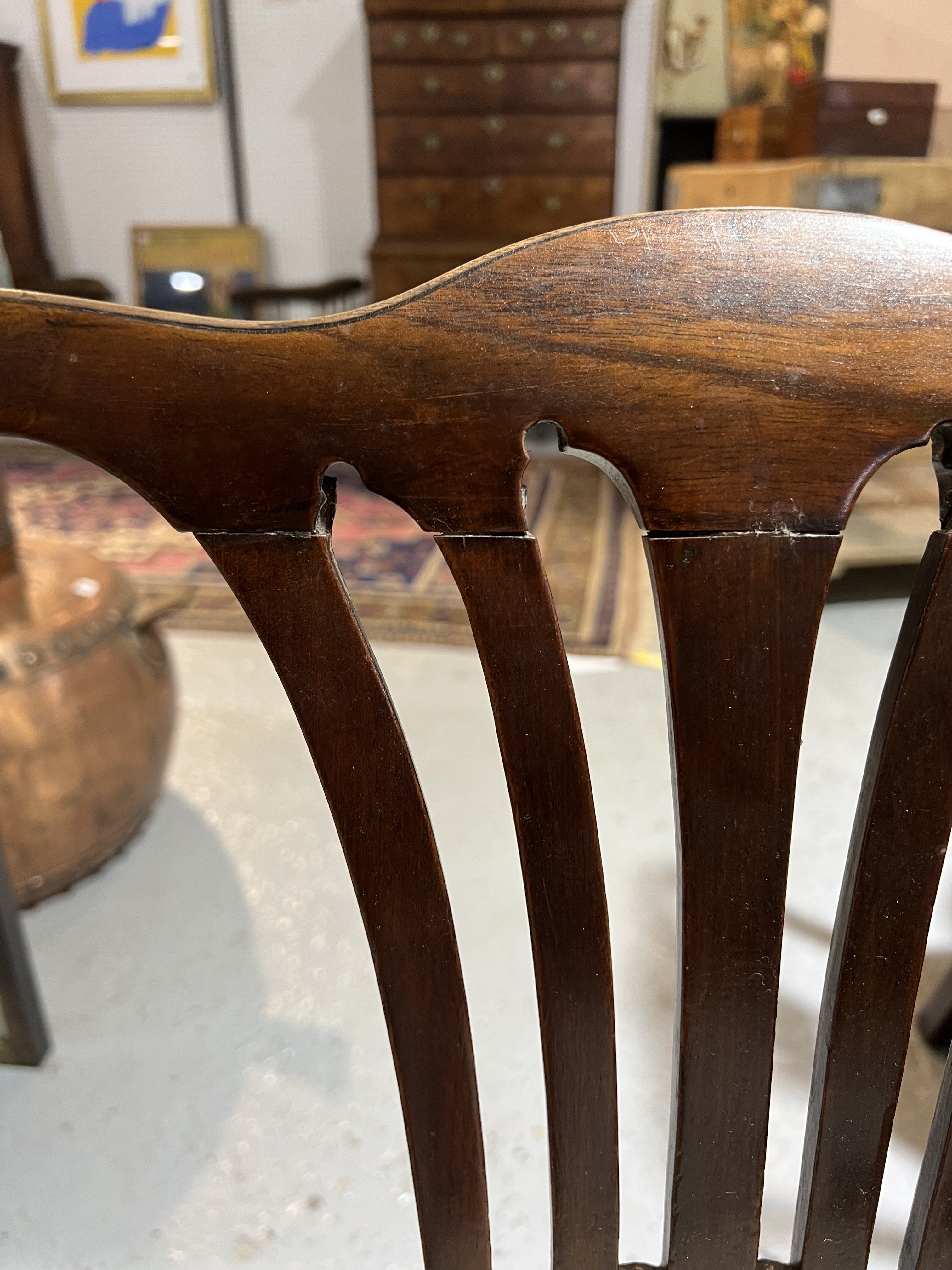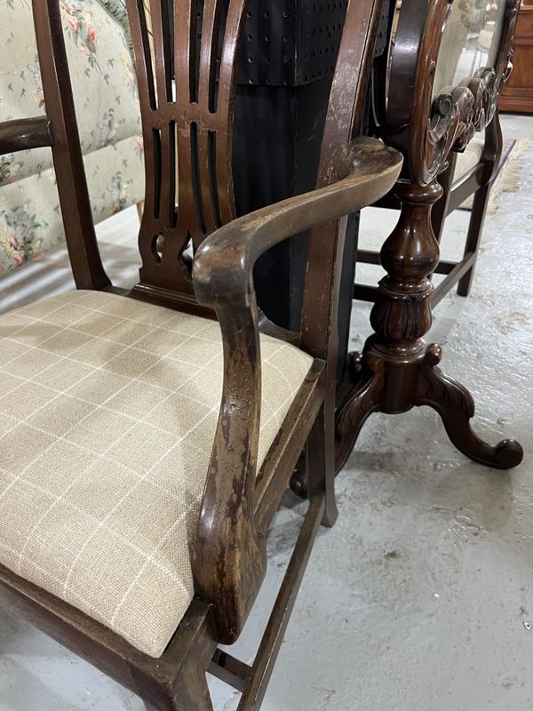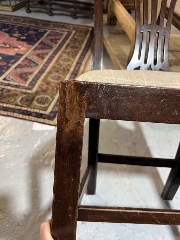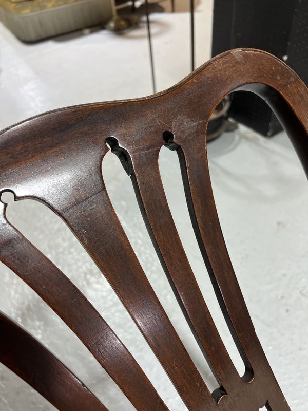 old marks and scratches present throughout the set, some with old repairs to the splat backs and front supports, both carved chairs are fairly worn with one suffering with water damage to the frame, in usable condition.