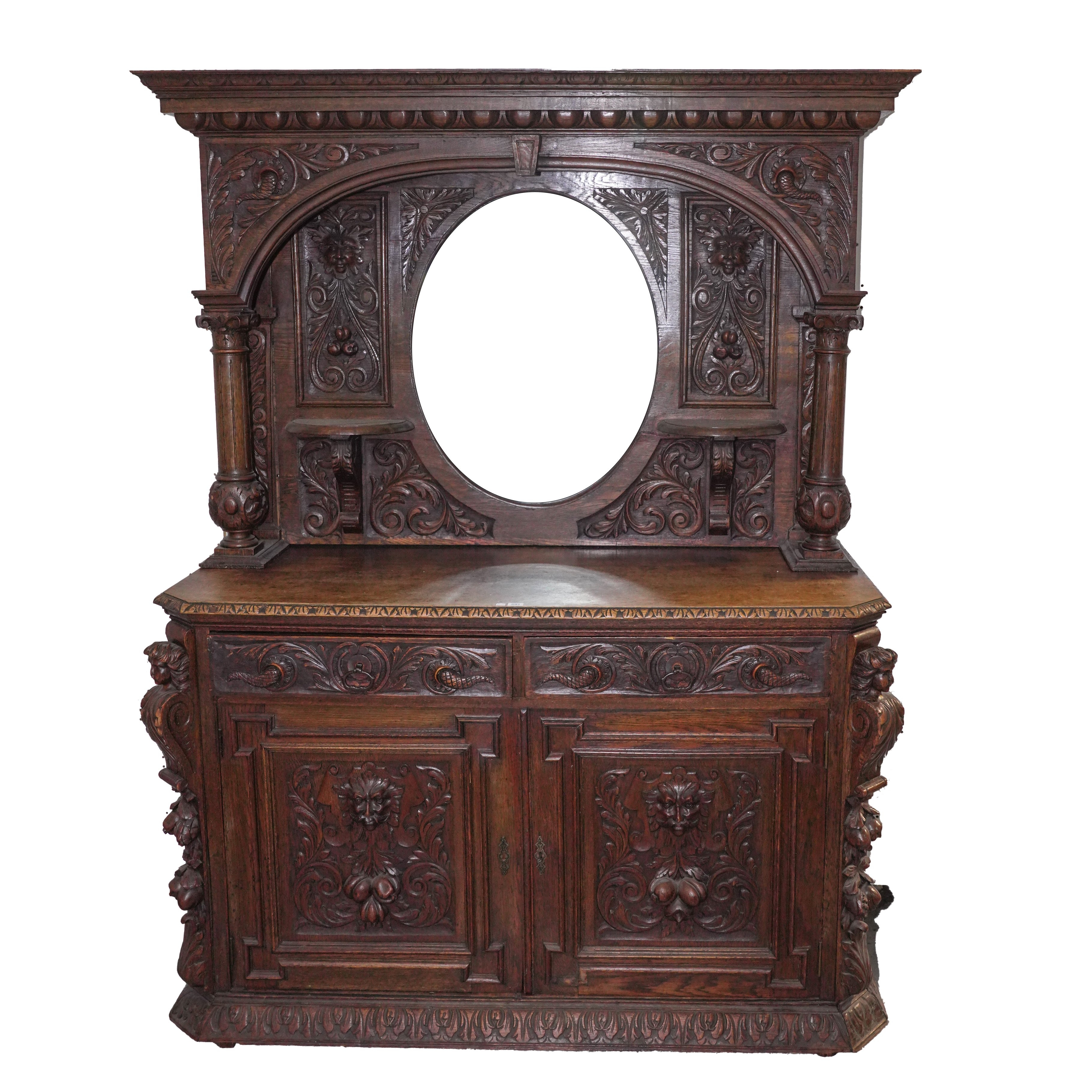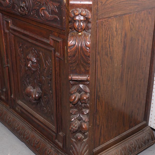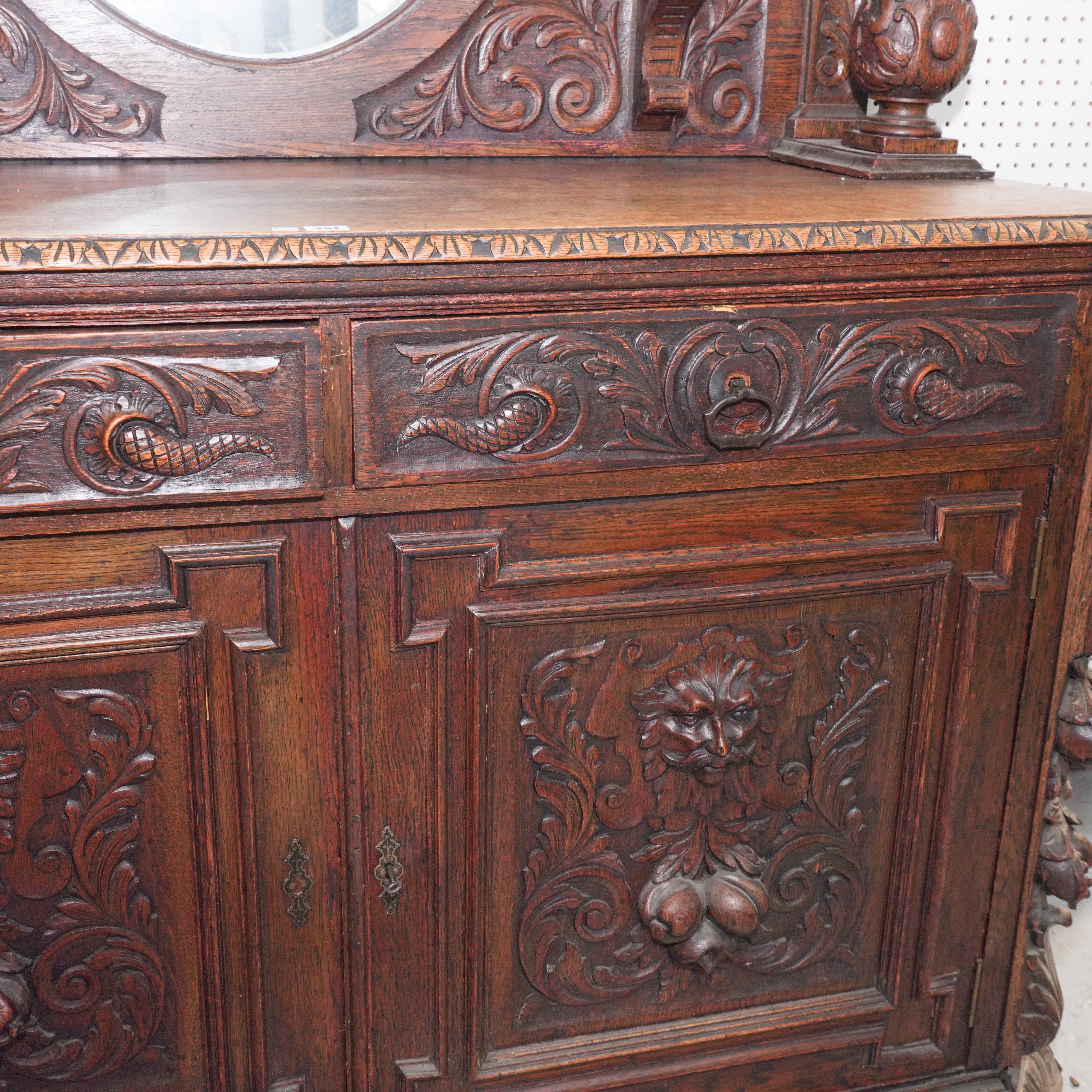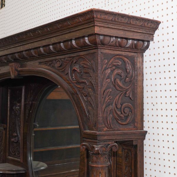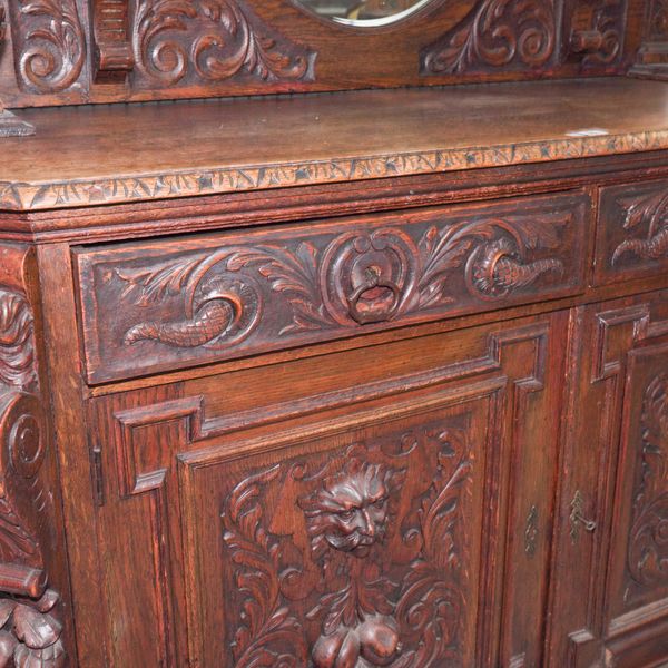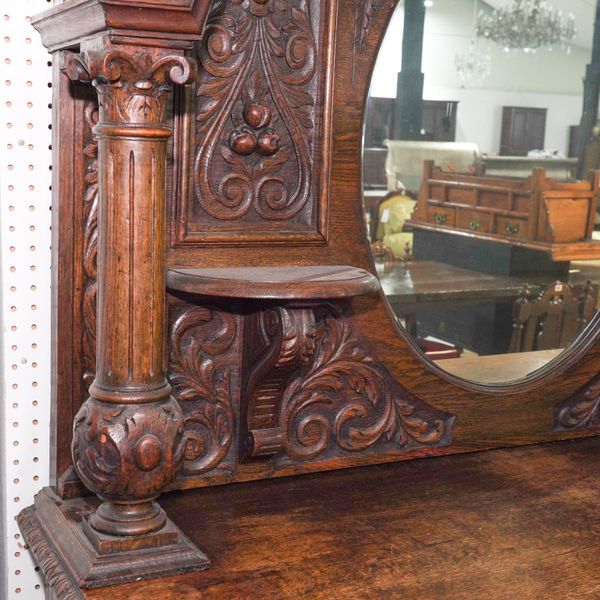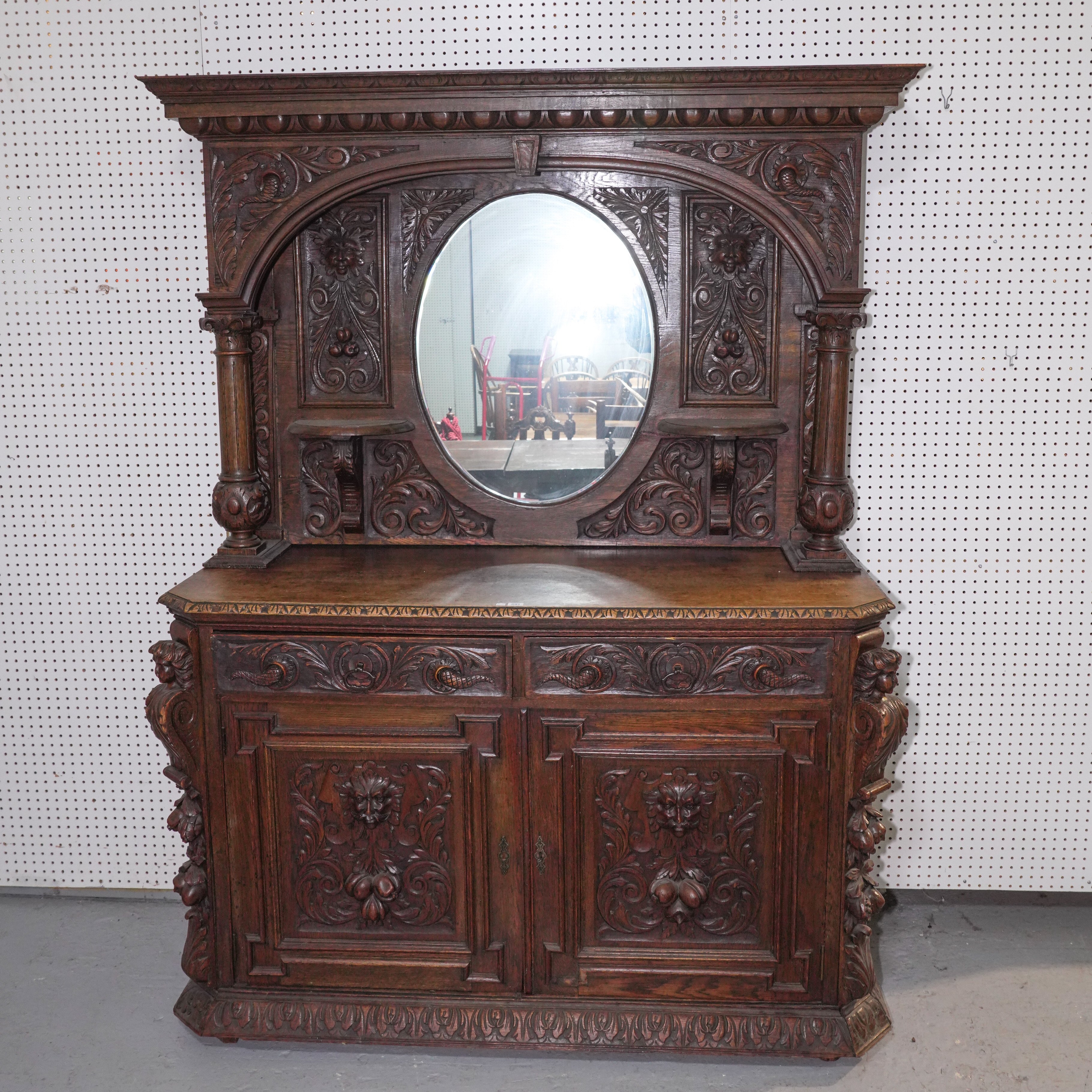 With oval plate flanked by carved panels and shelves, 150cm wide; 60cm deep; 201cm high