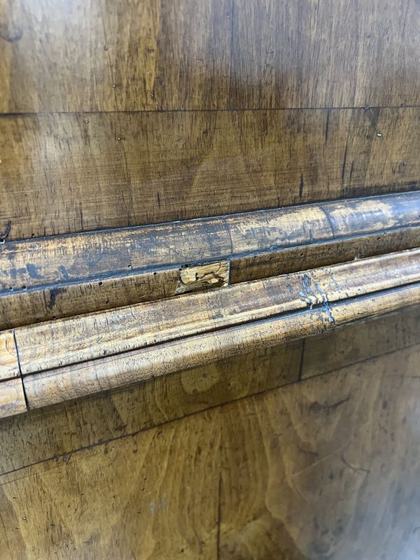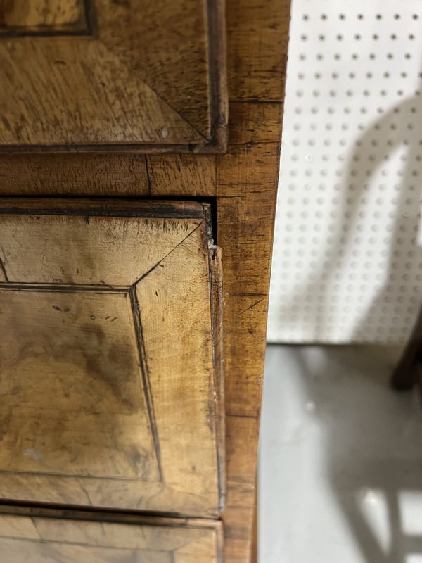 old marks and scratches present expected with the age of the item, signs of restoration to the veneer and moulded edges, some small sections of losses around the drawer fronts, see images.
