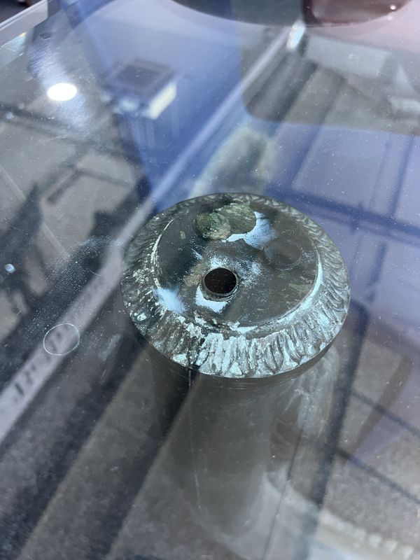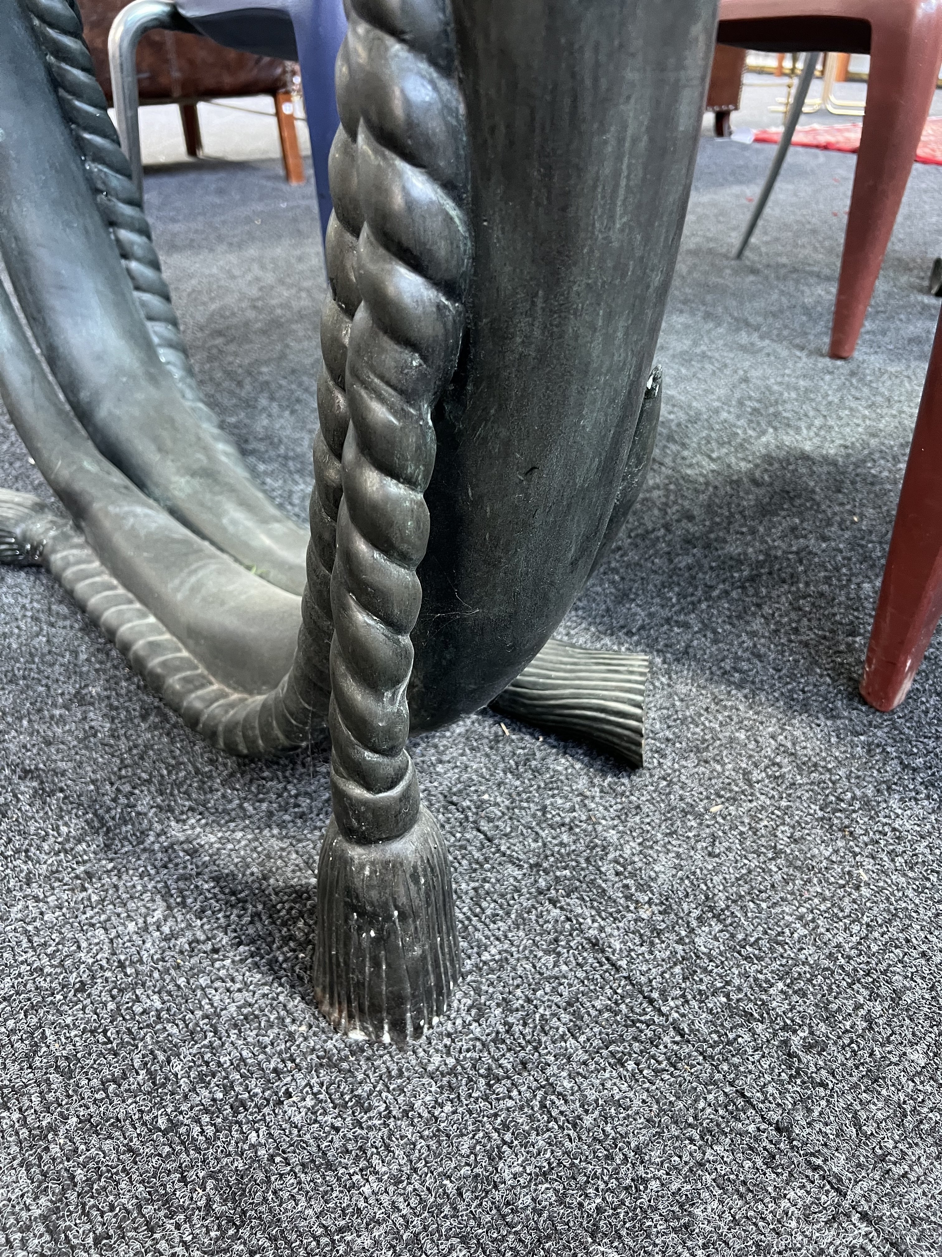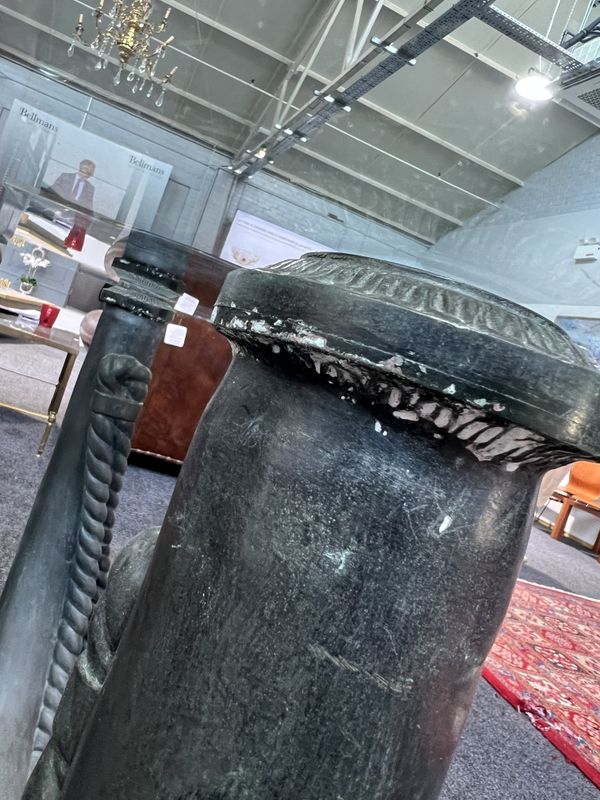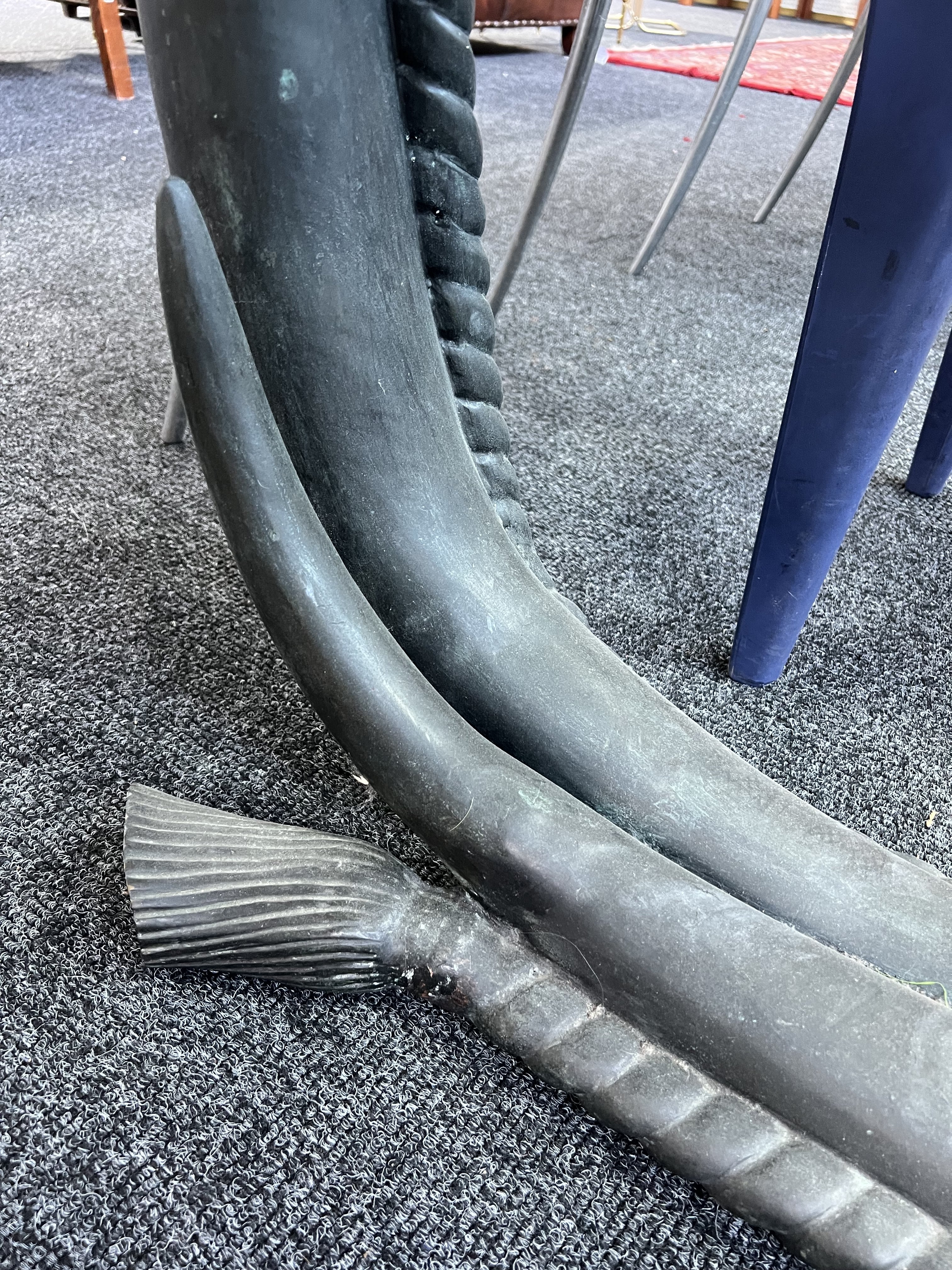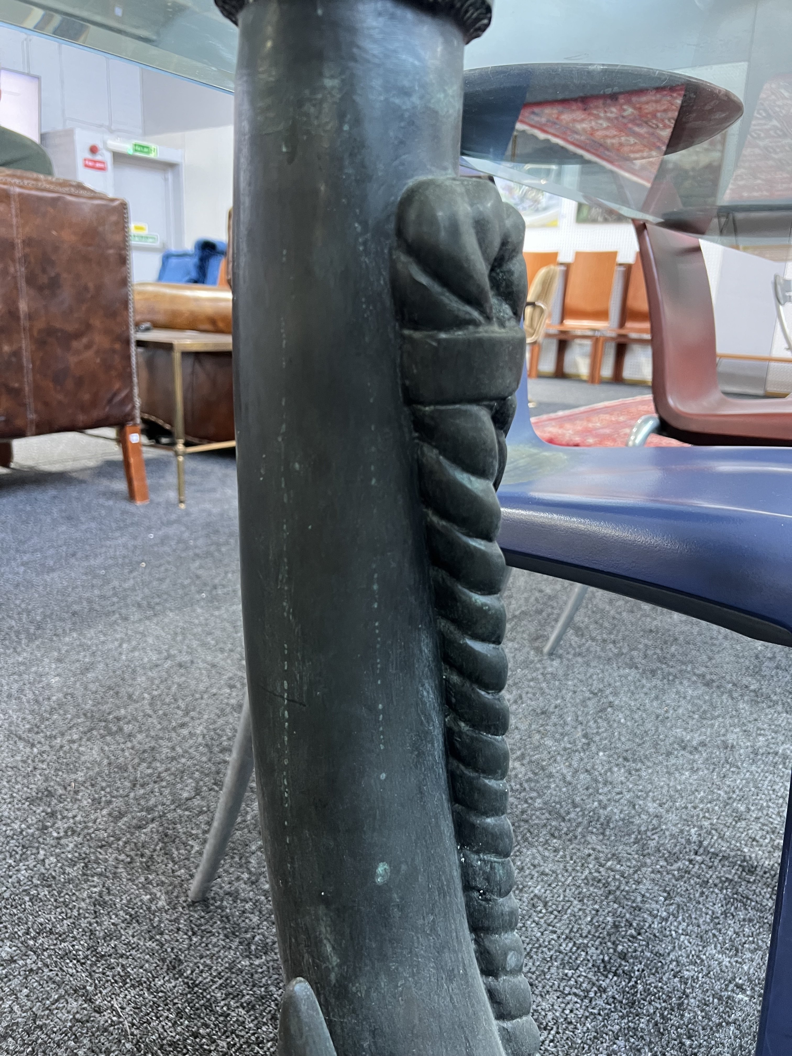 The rectangular bevelled glass top on a pair of bronze supports, cast as rope bound tusks, 120cm wide; 212cm long; 74cm high