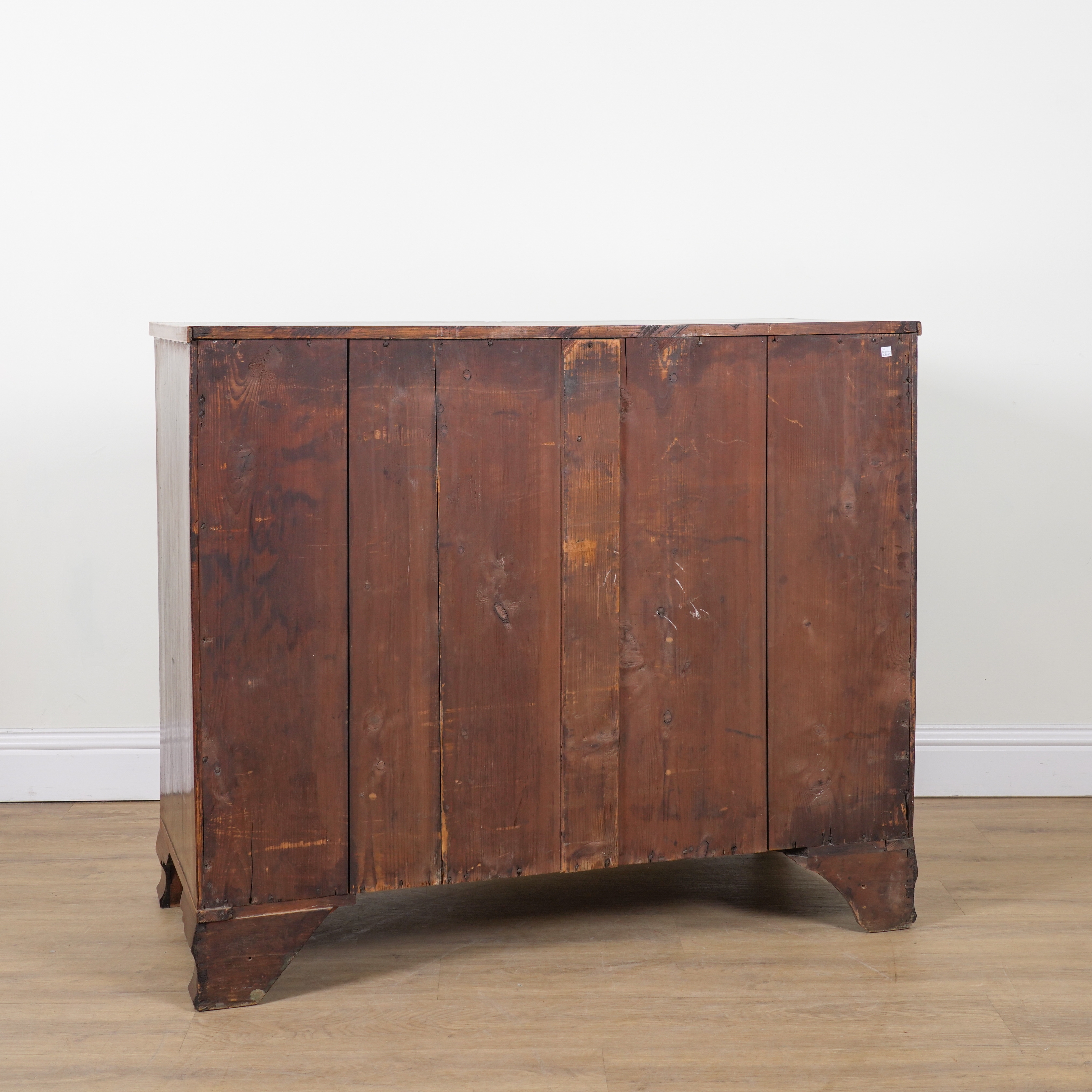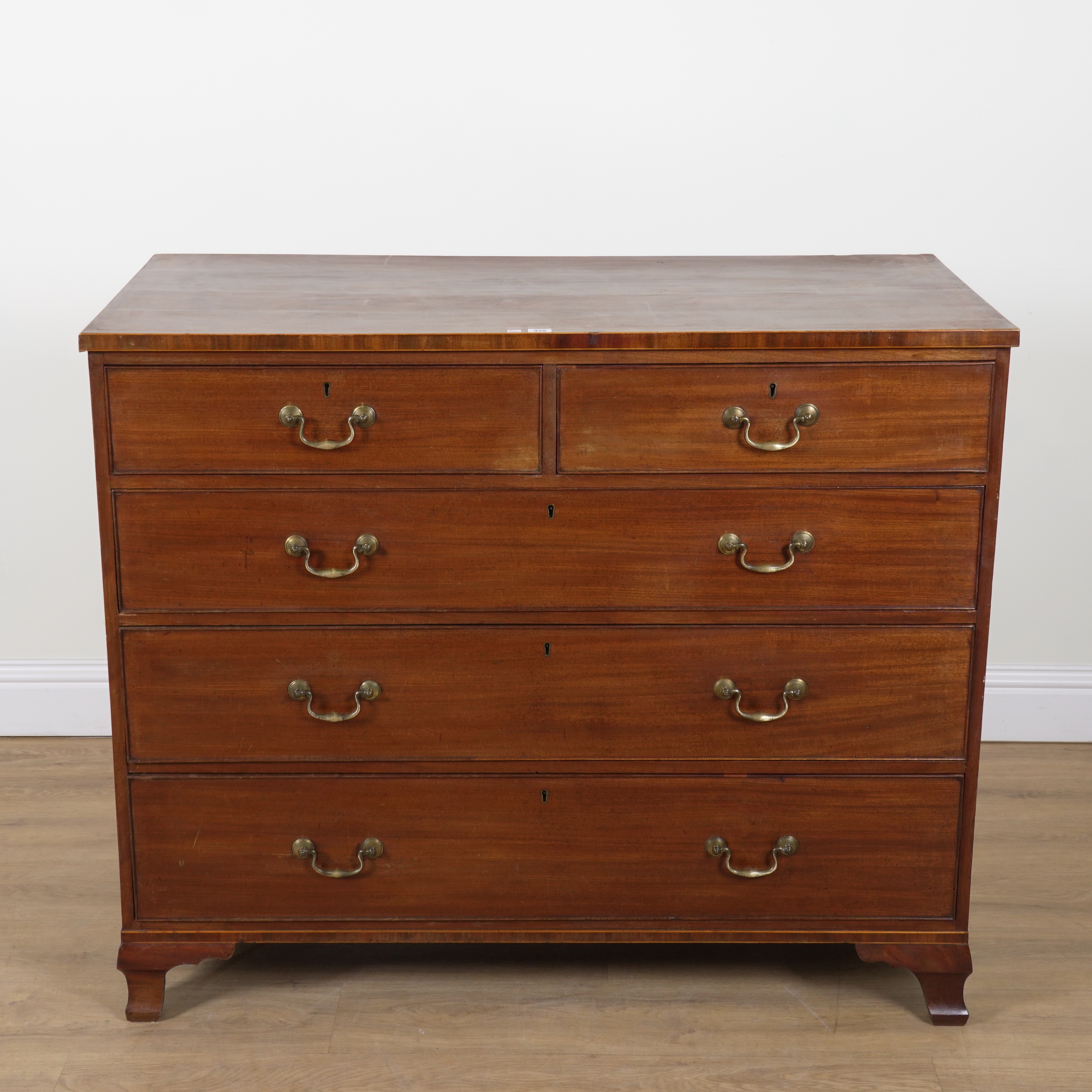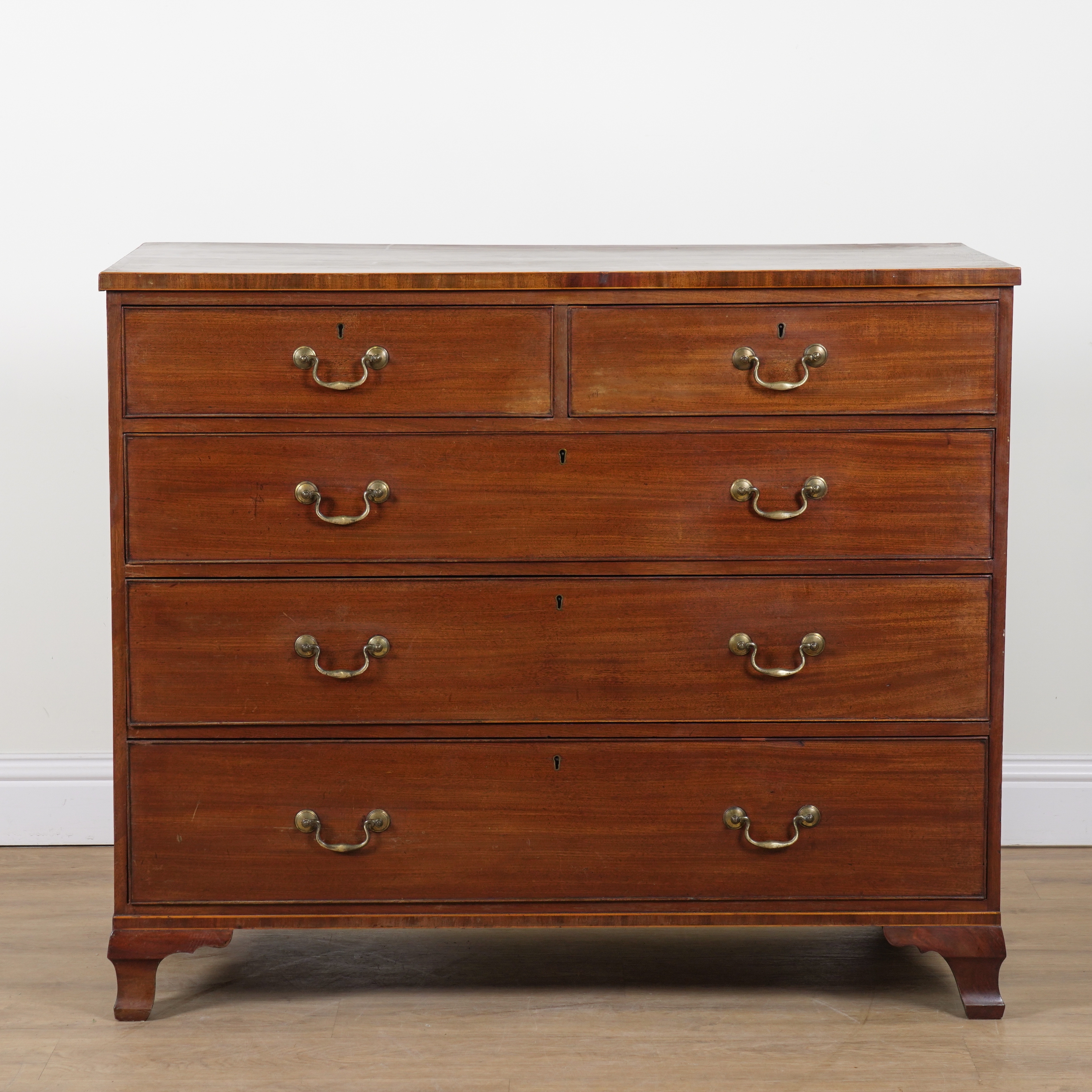 With two short over three long graduated drawers, on ogee bracket feet, 123cm wide; 54cm deep; 103cm high
