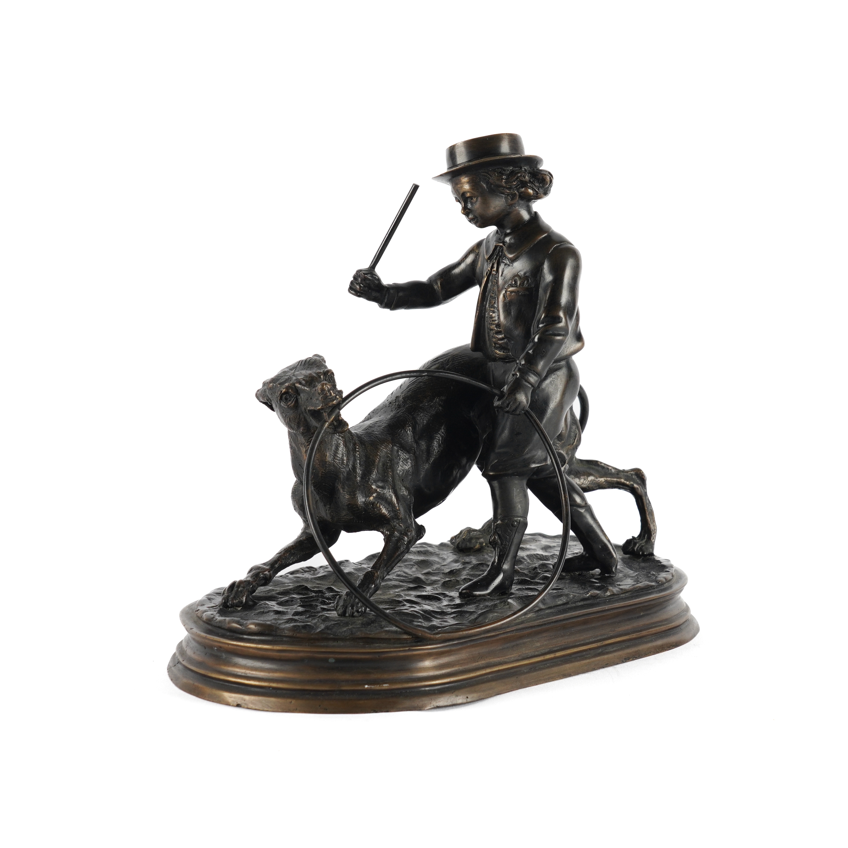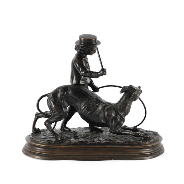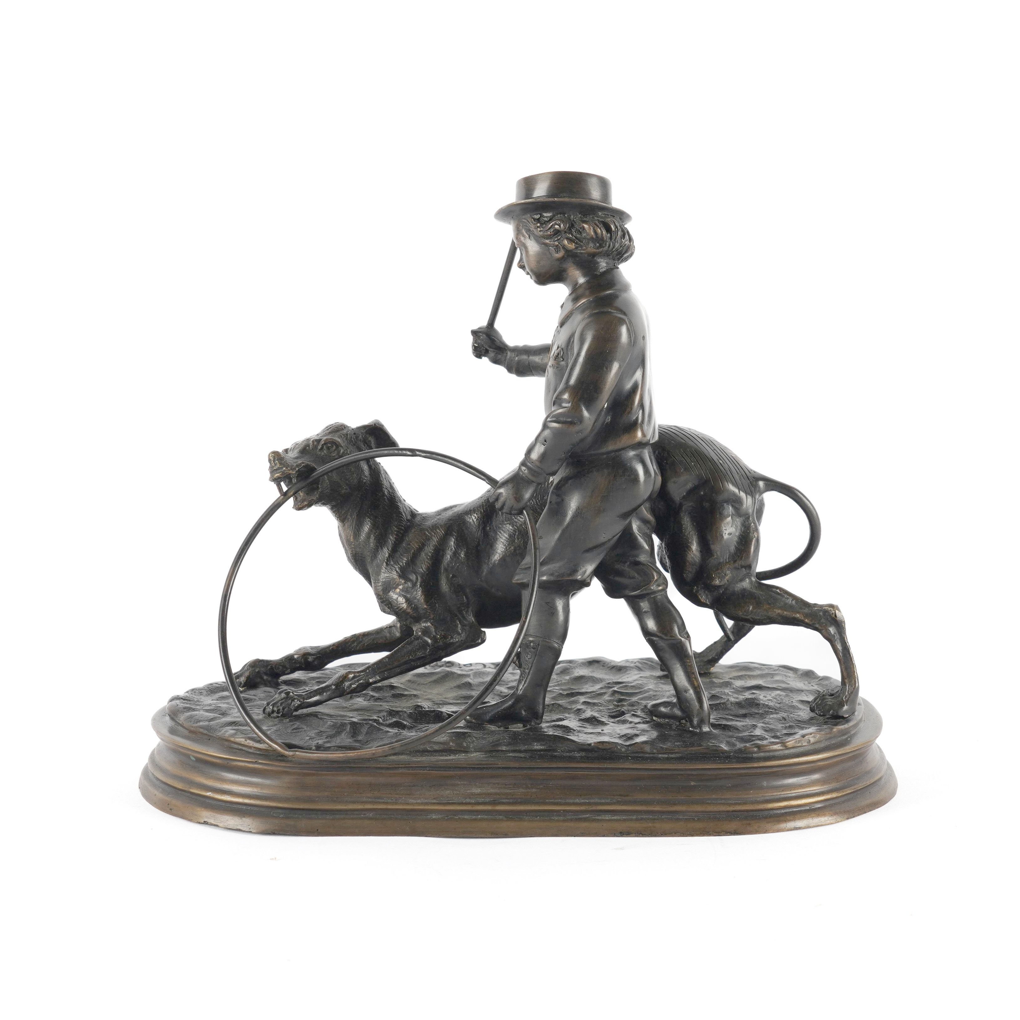AFTER J MOIGNIEZ (FRENCH, 1835-1894): A BRONZE GROUP OF A BOY PLAYING WITH A GREYHOUND