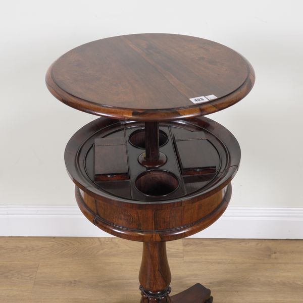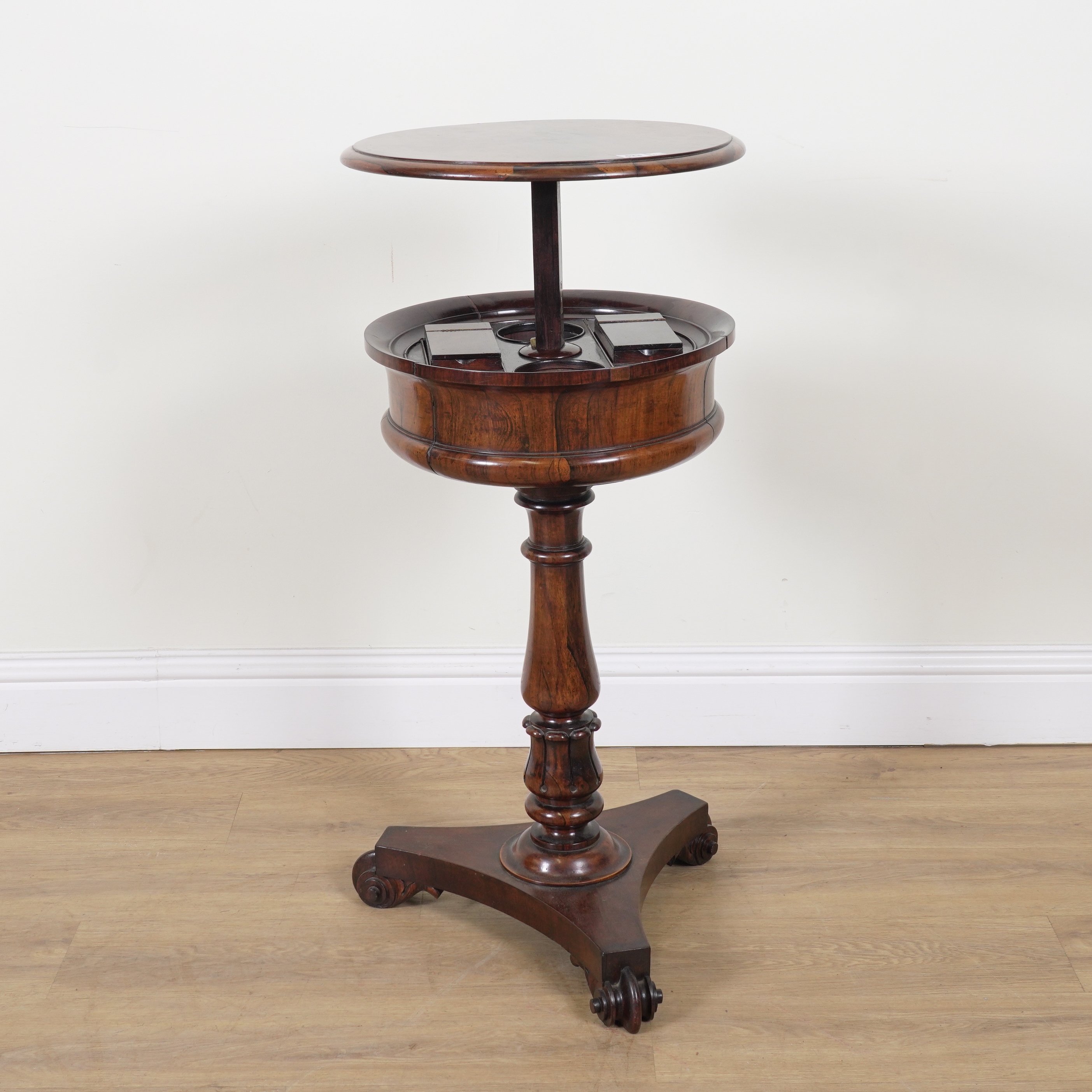 With rising top over turned column and tripod base, 46cm diameter; 76cm high; 98cm high open