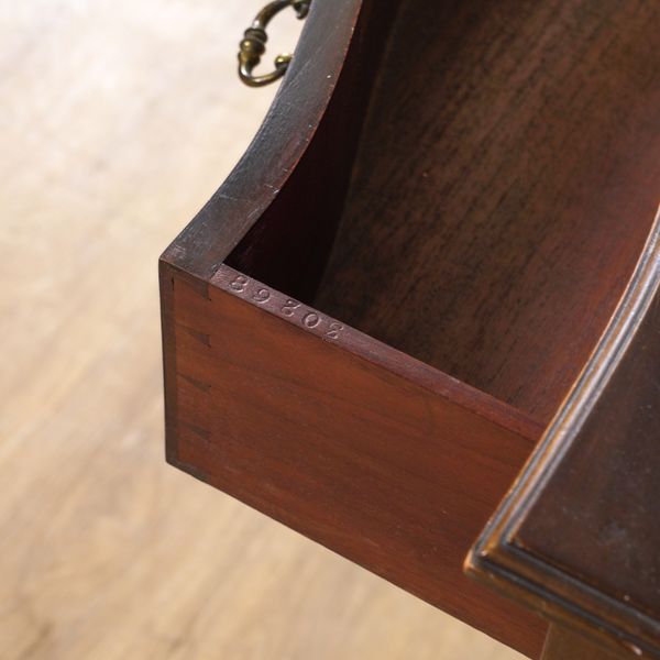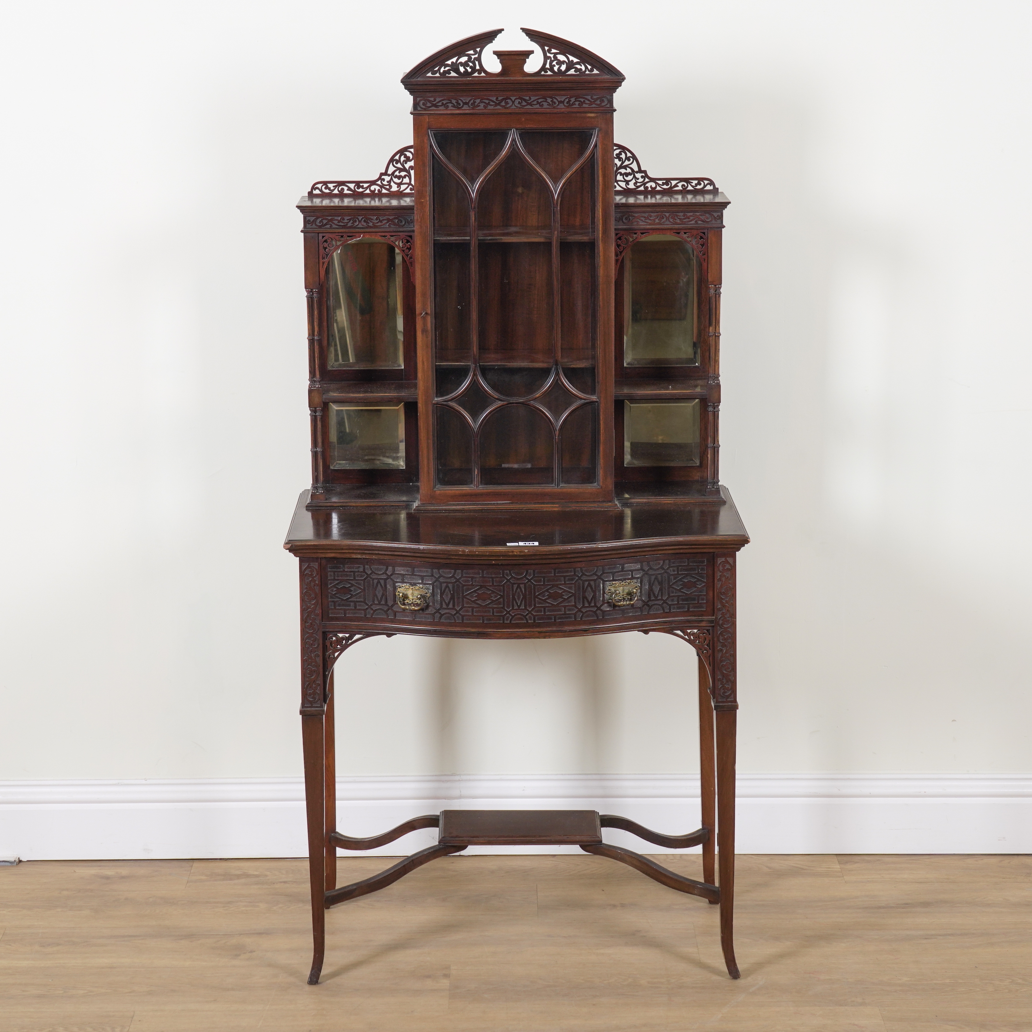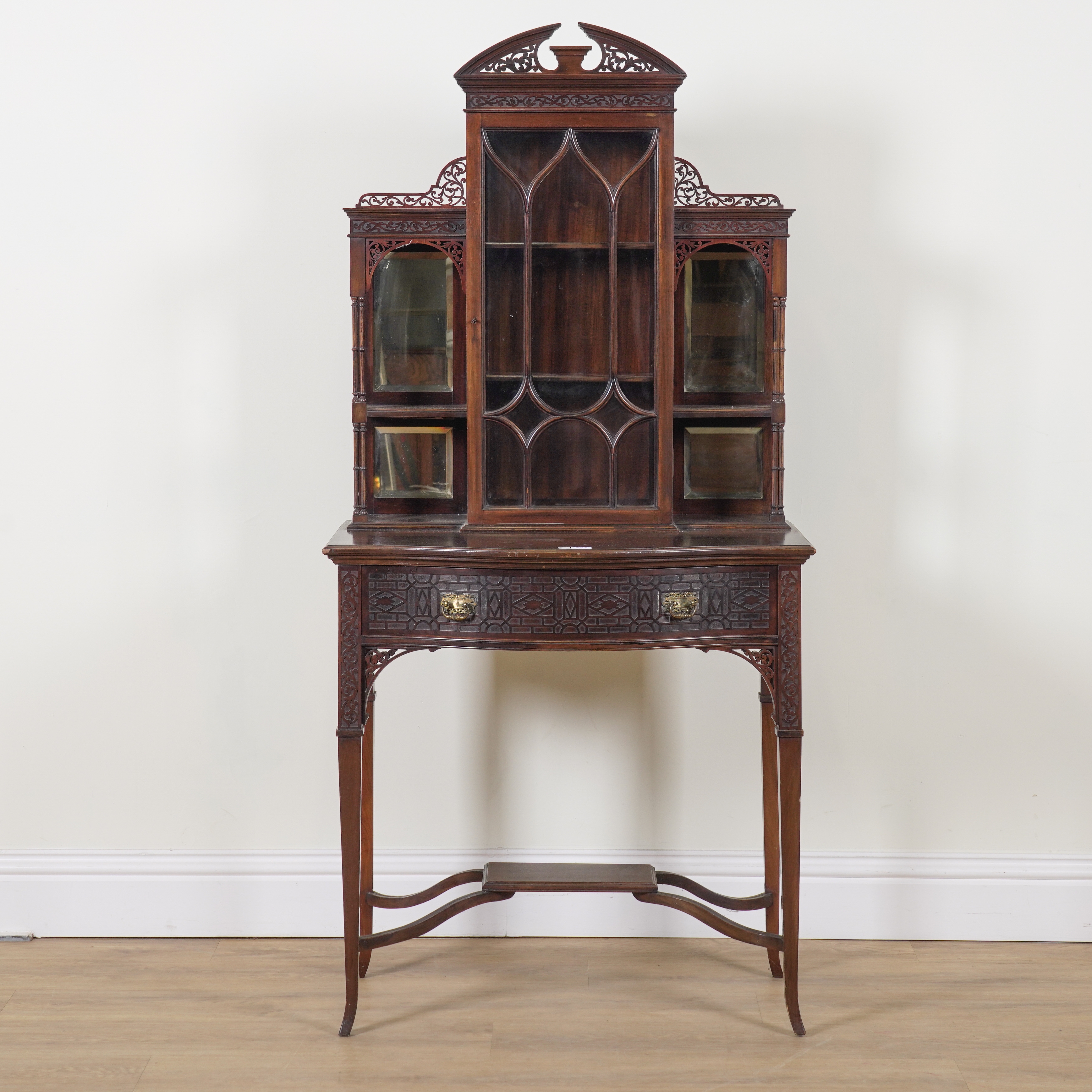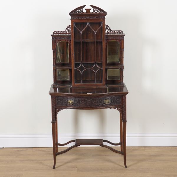 Early 20th century, with central glazed door flanked by mirrored back open shelves supported by cluster columns over serpentine single drawer, 76cm wide; 45cm deep; 158cm high