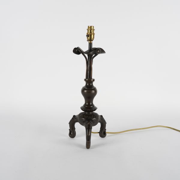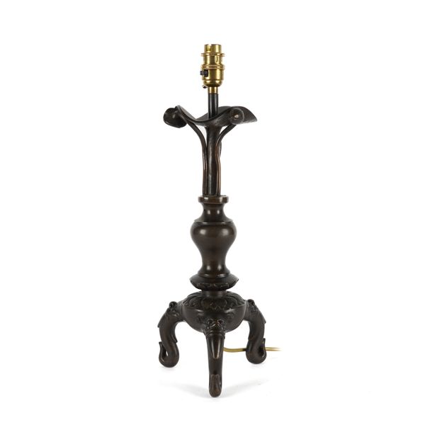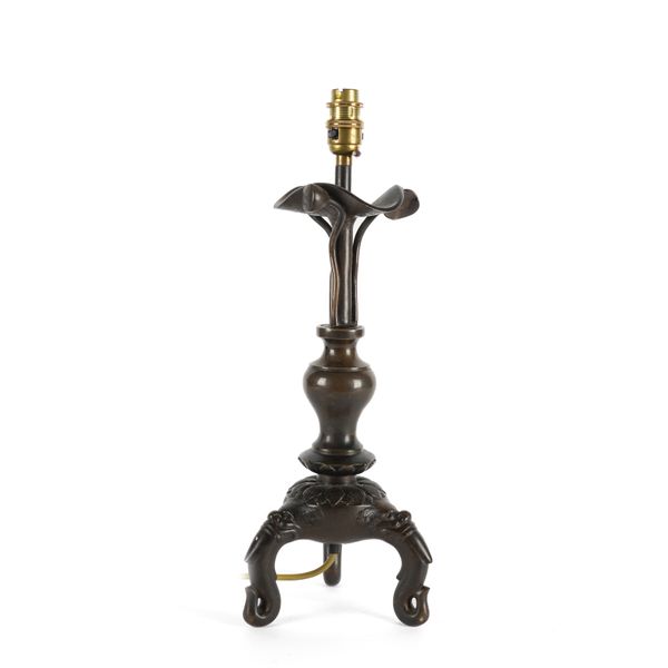 20th Century Modelled as a baluster vase issuing three stemmed lotus flowers raised on a triform scroll base, 54cm high
