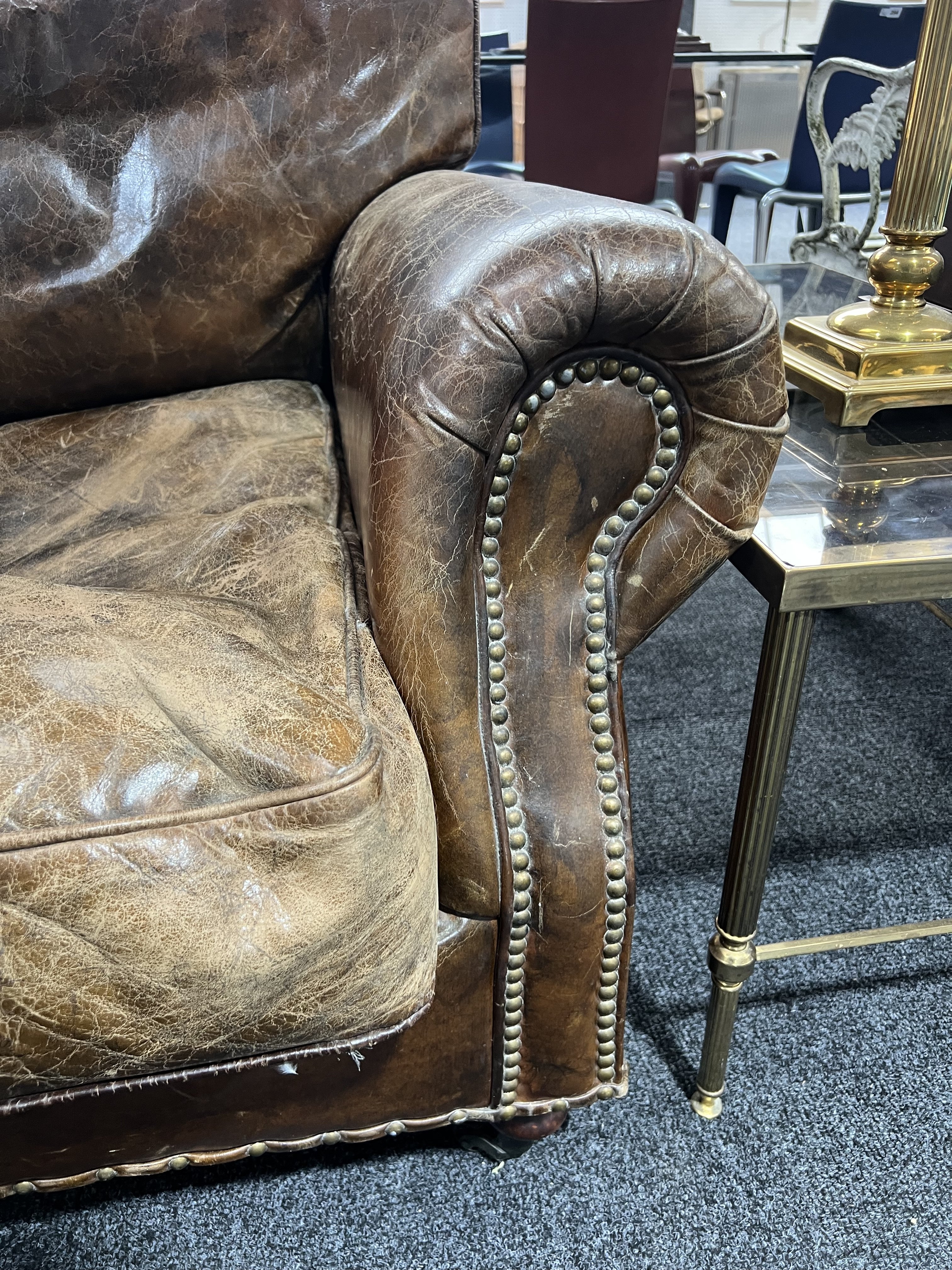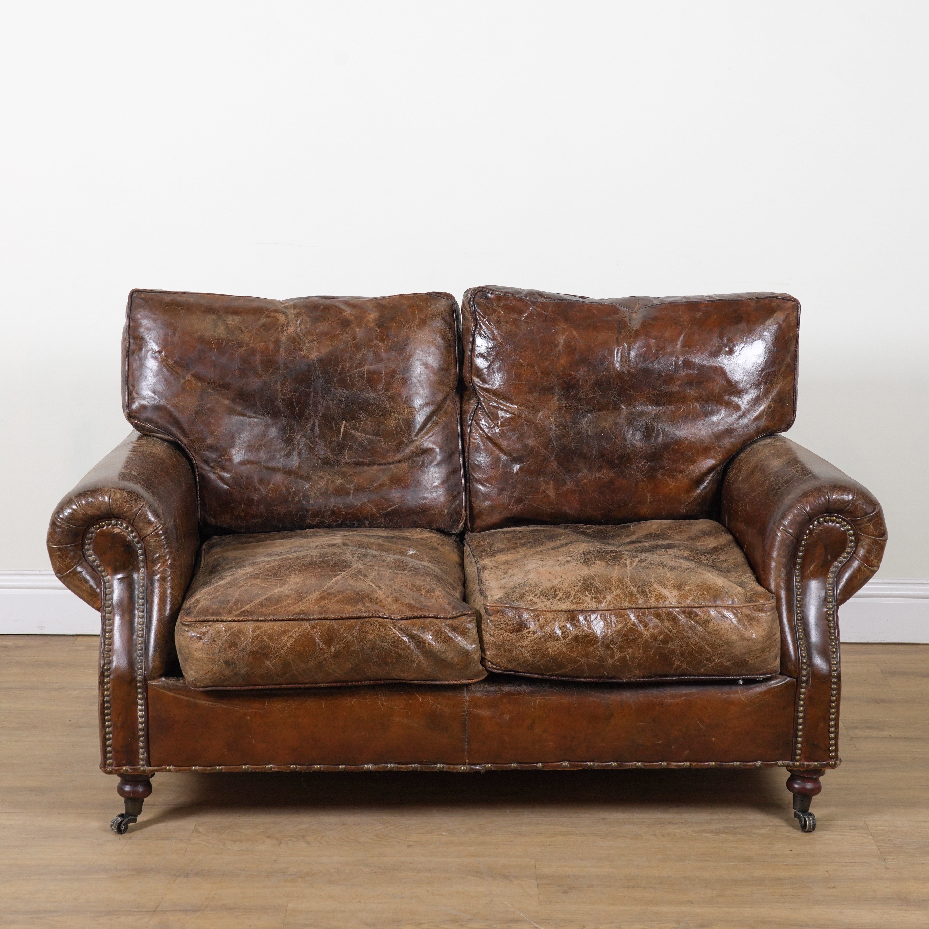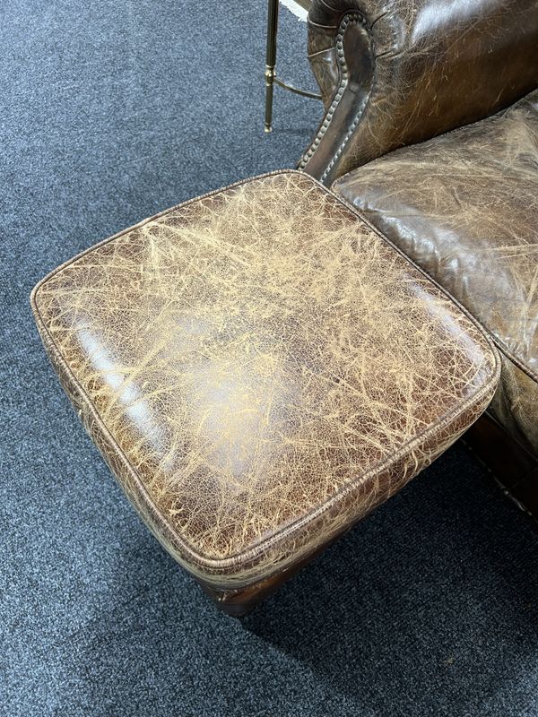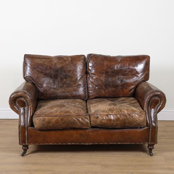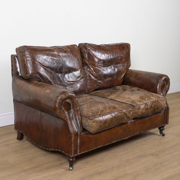 AN EARLY 20TH CENTURY STUDDED TAN LEATHER TWO SEAT SOFA (2)