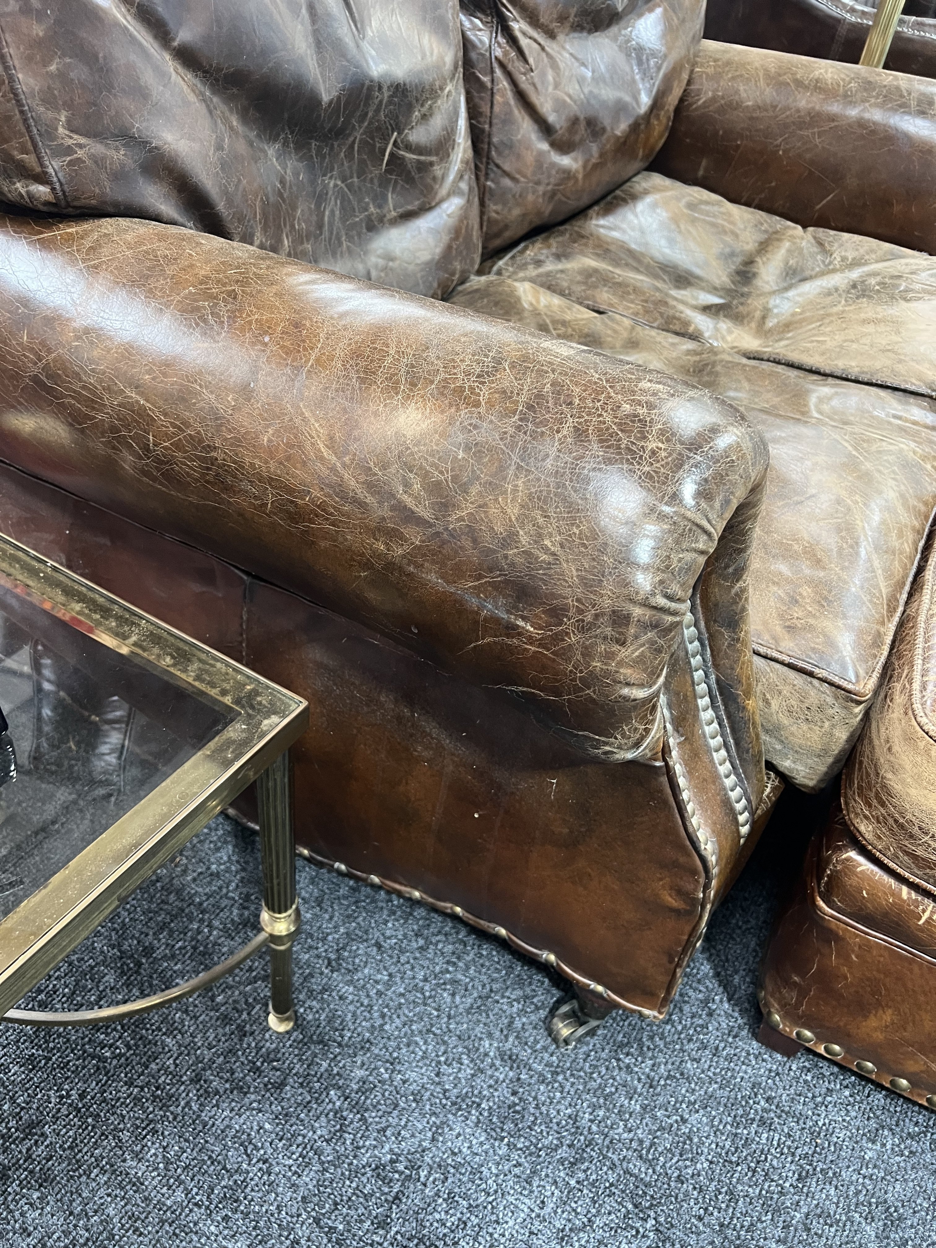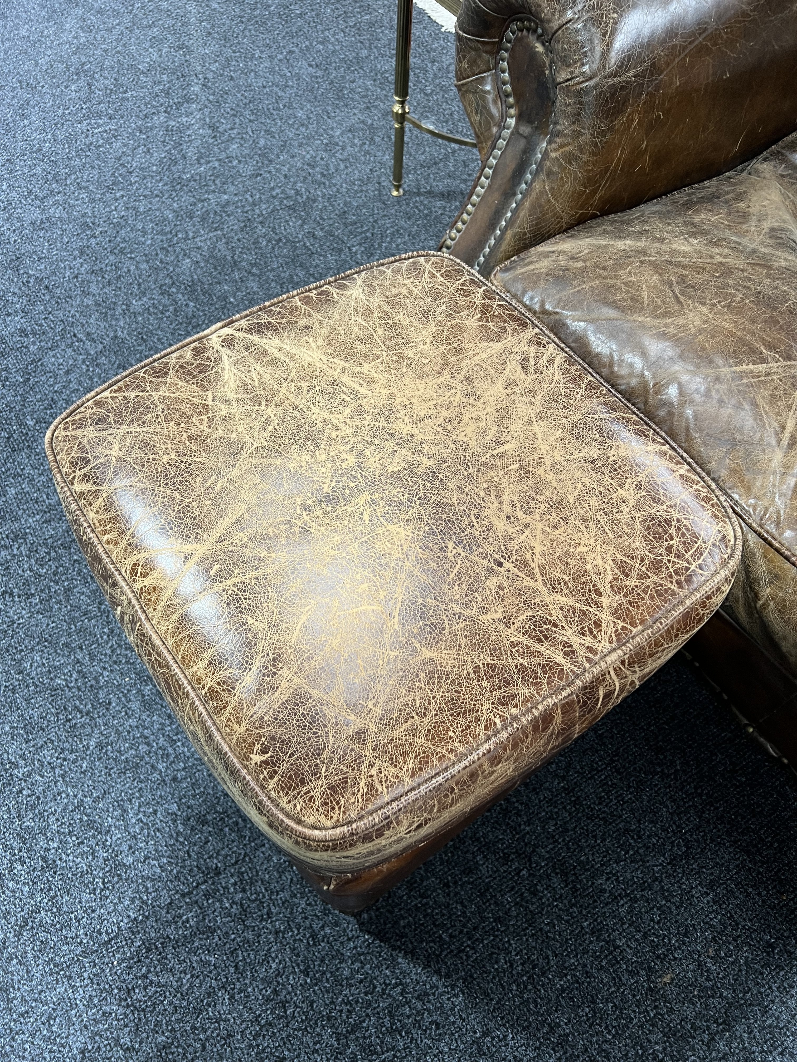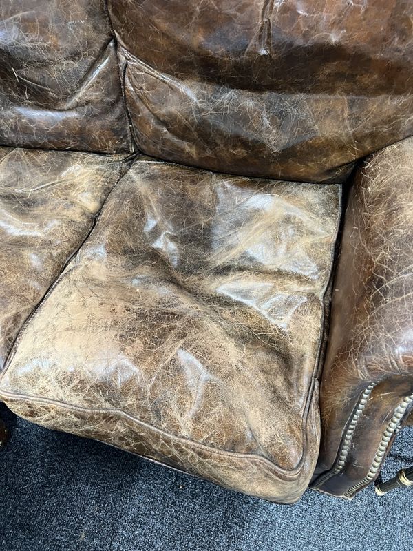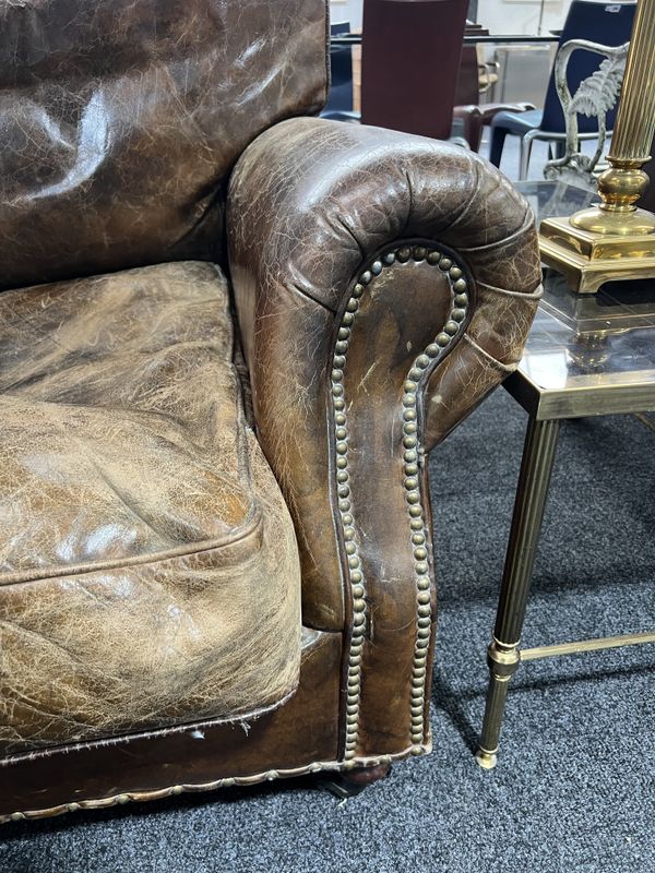 leather upholstery cracked worn and faded all over, see images solid frame and arms marks and scratches to the supports.