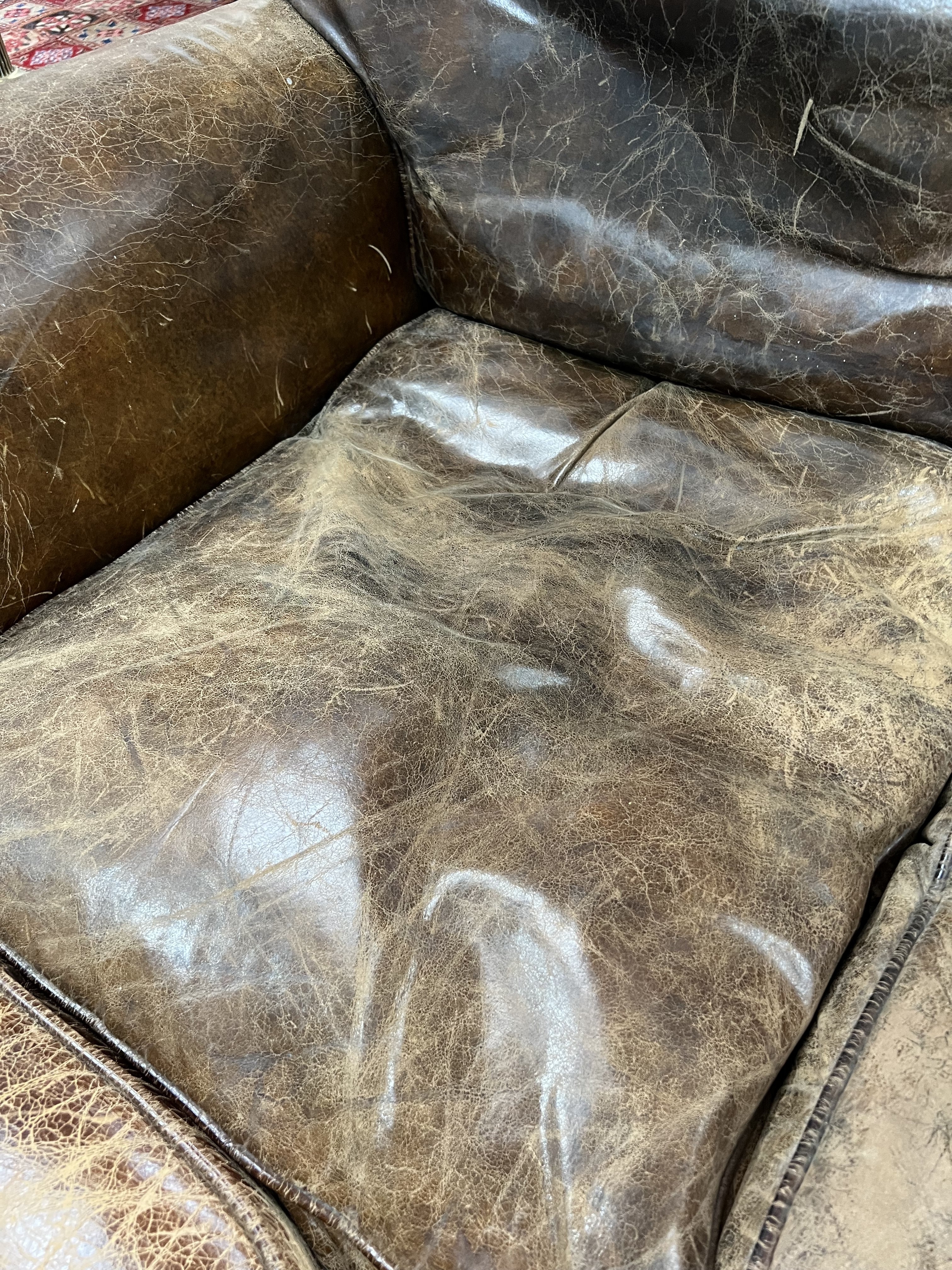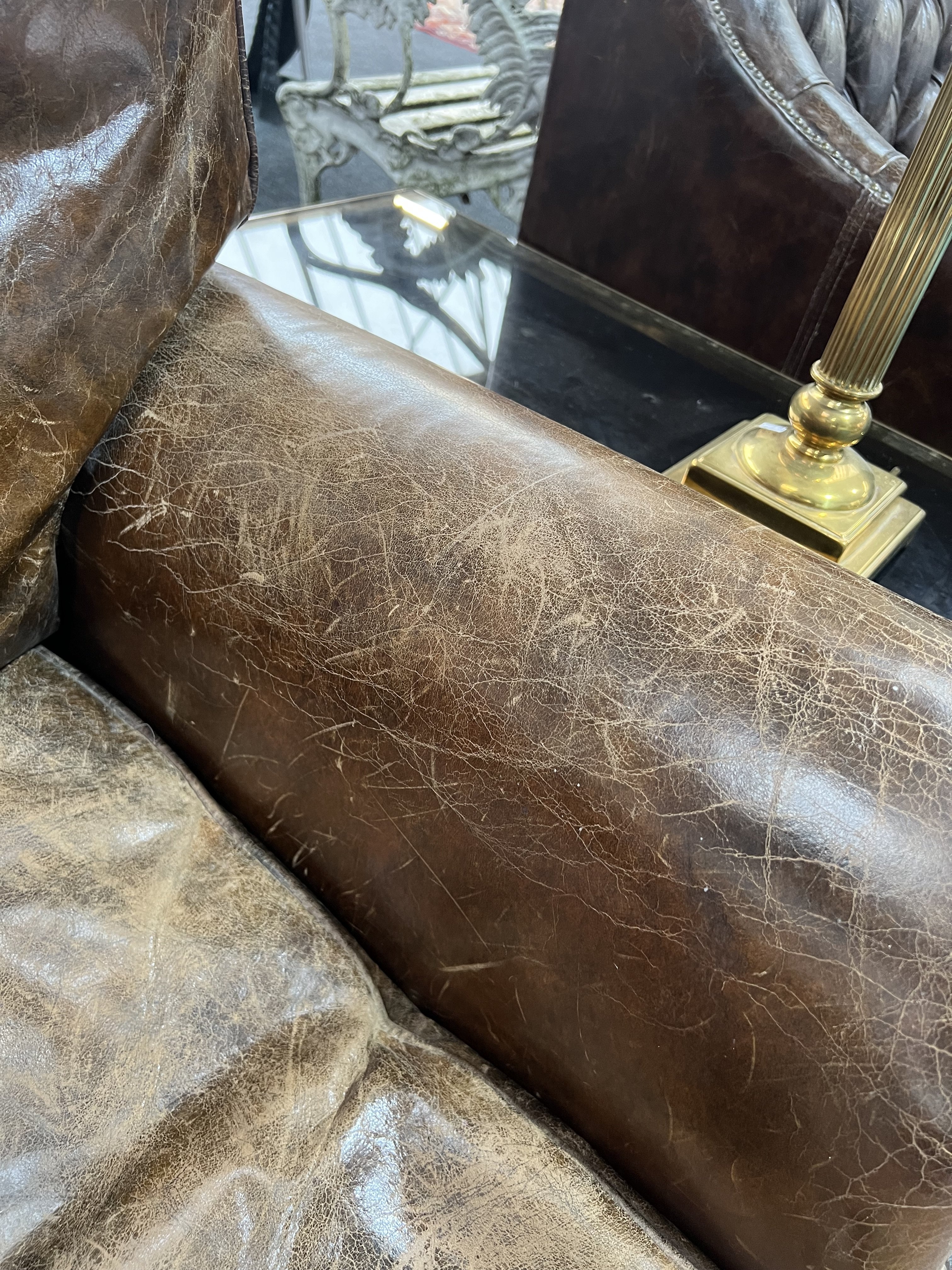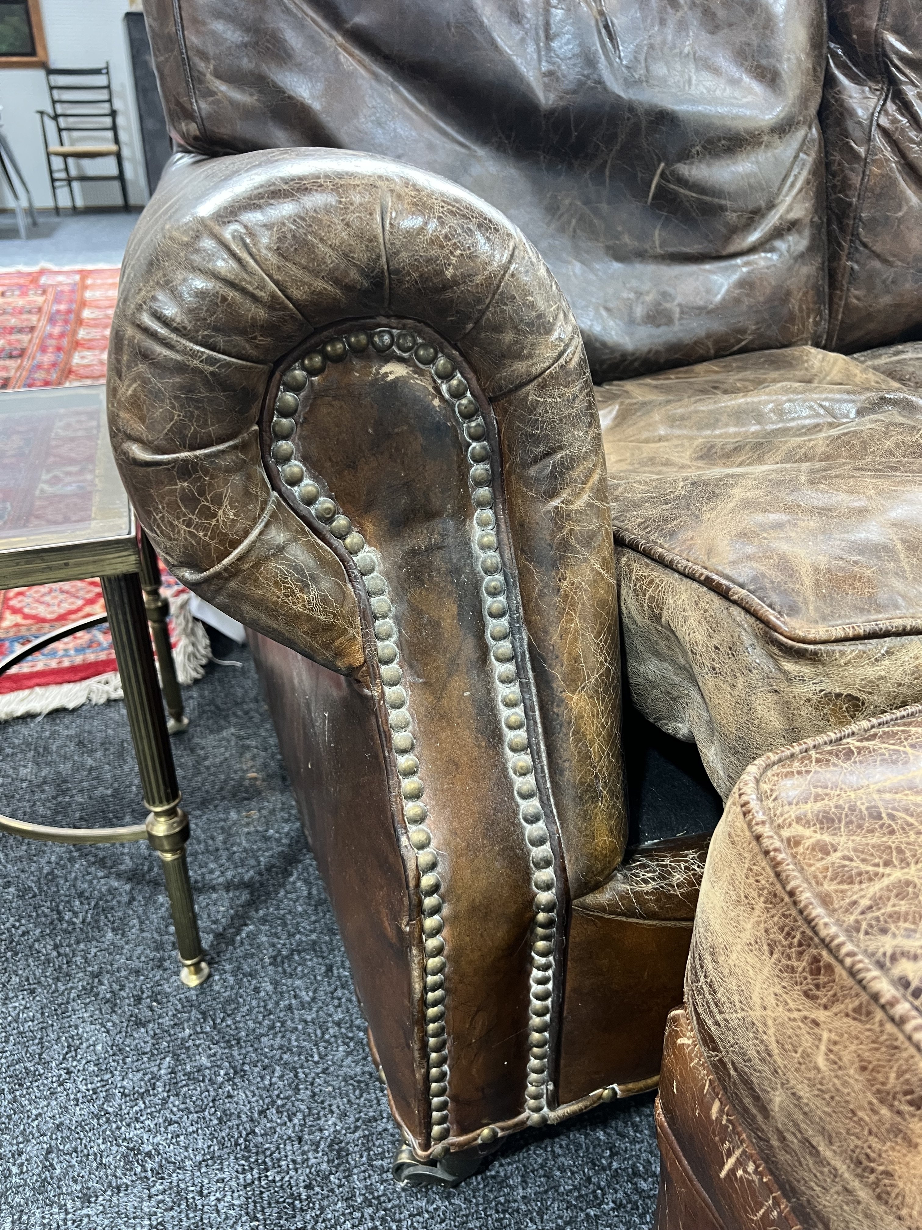 leather upholstery cracked worn and faded all over, see images solid frame and arms marks and scratches to the supports.