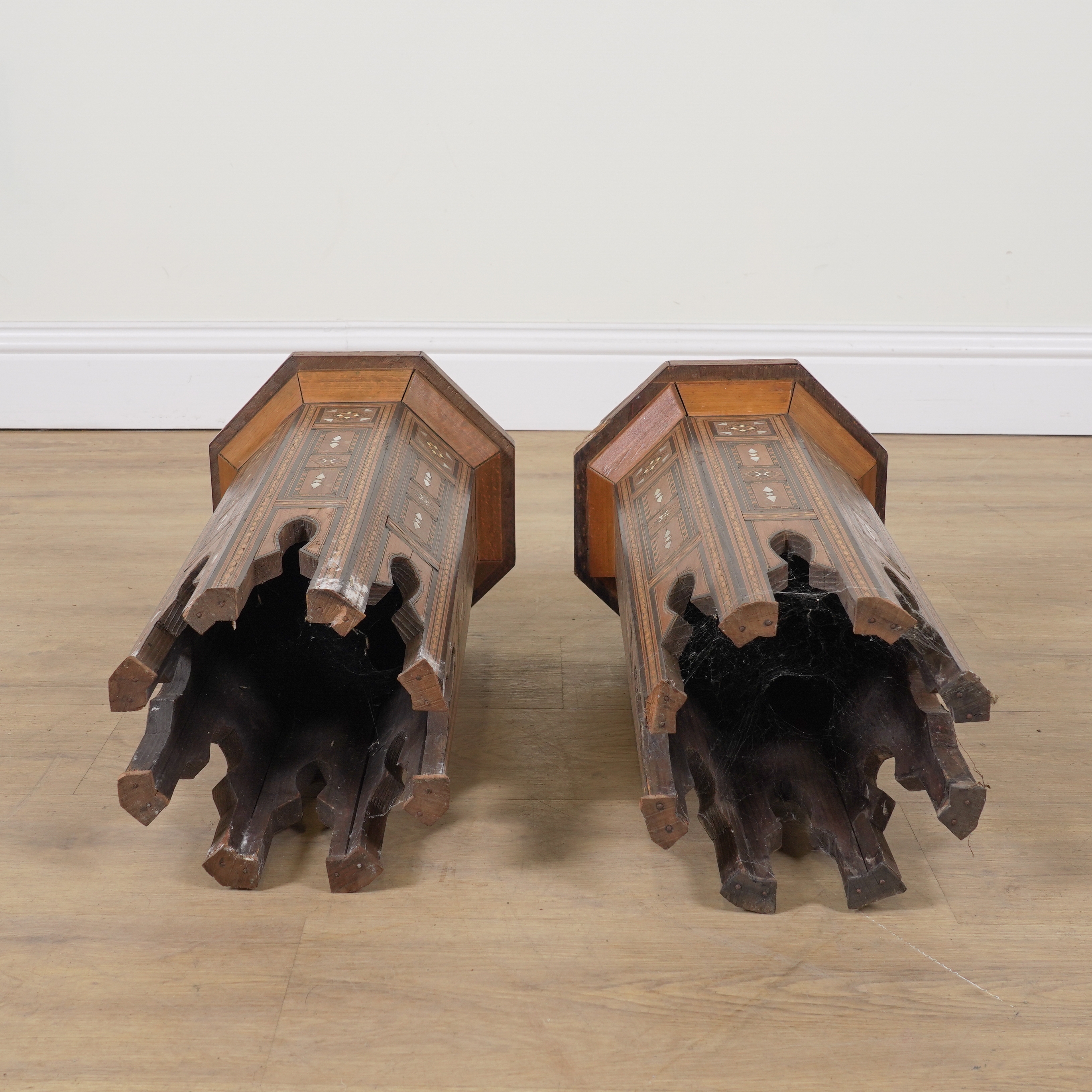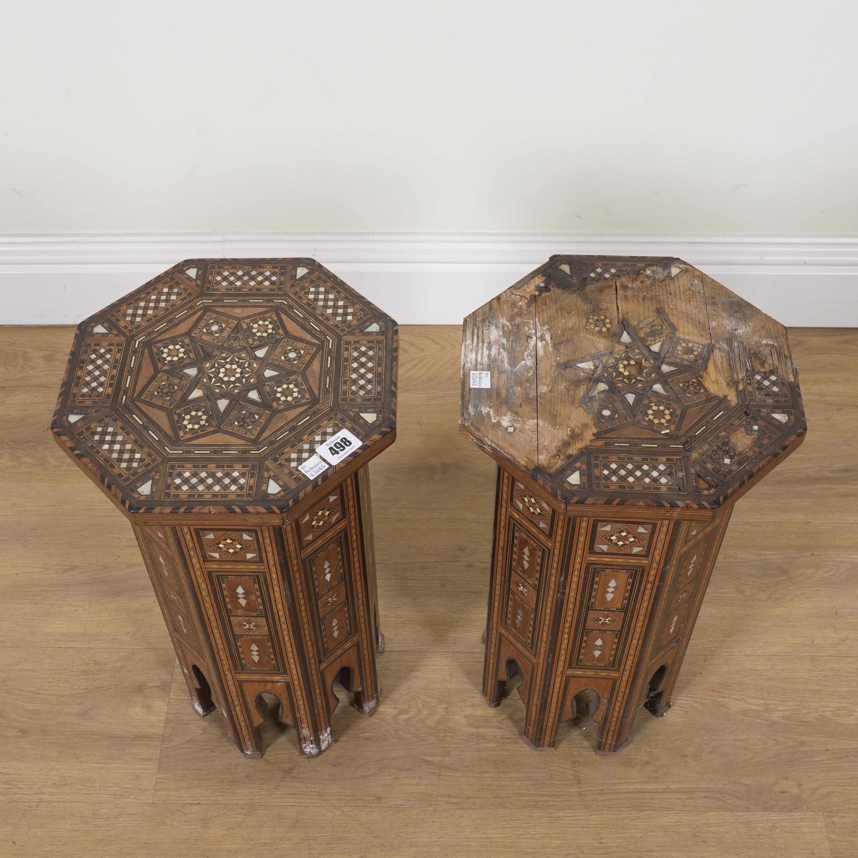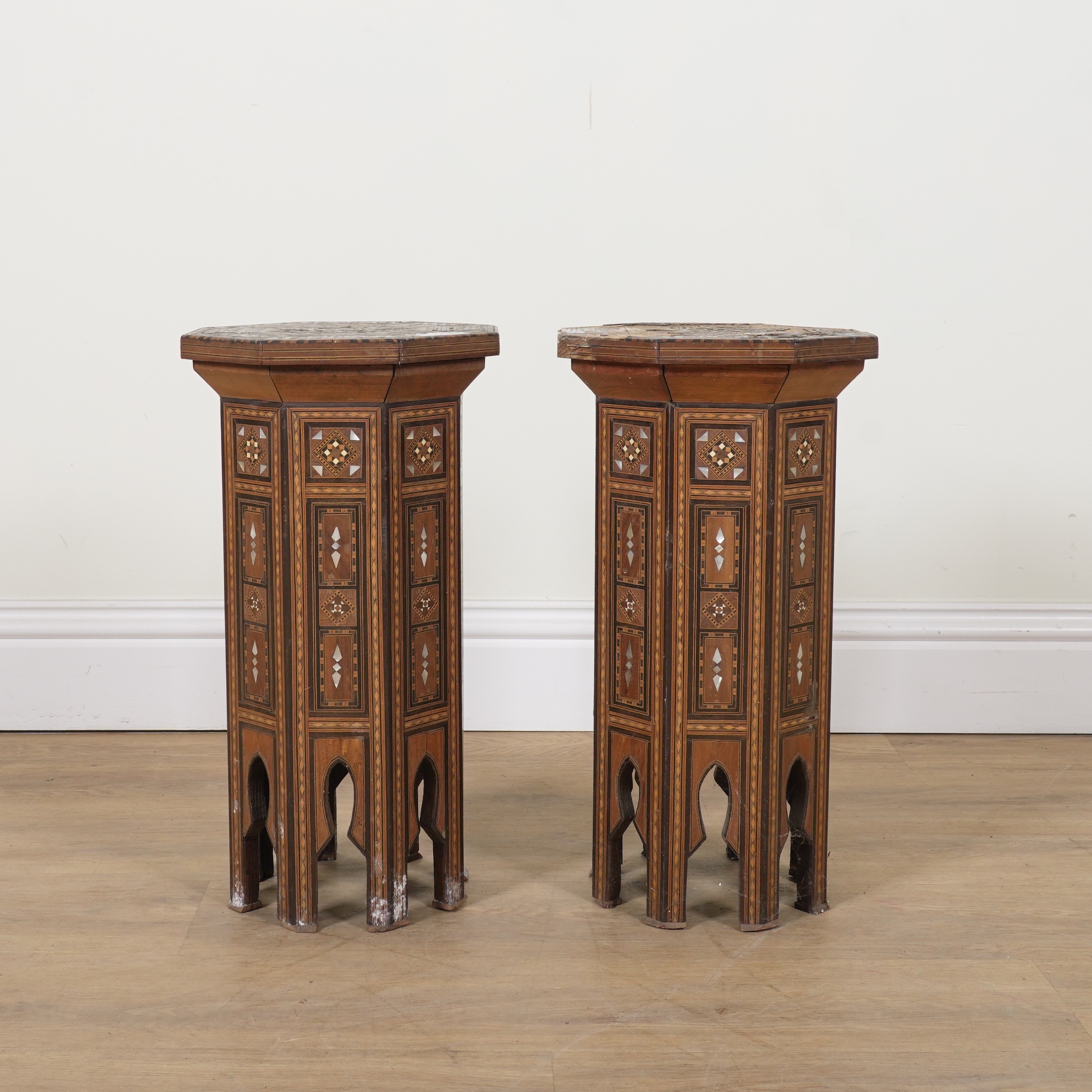 A PAIR OF EARLY 20TH CENTURY MOTHER-OF-PEARL AND BONE INLAID OCTAGONAL OCCASIONAL TABLES (2)