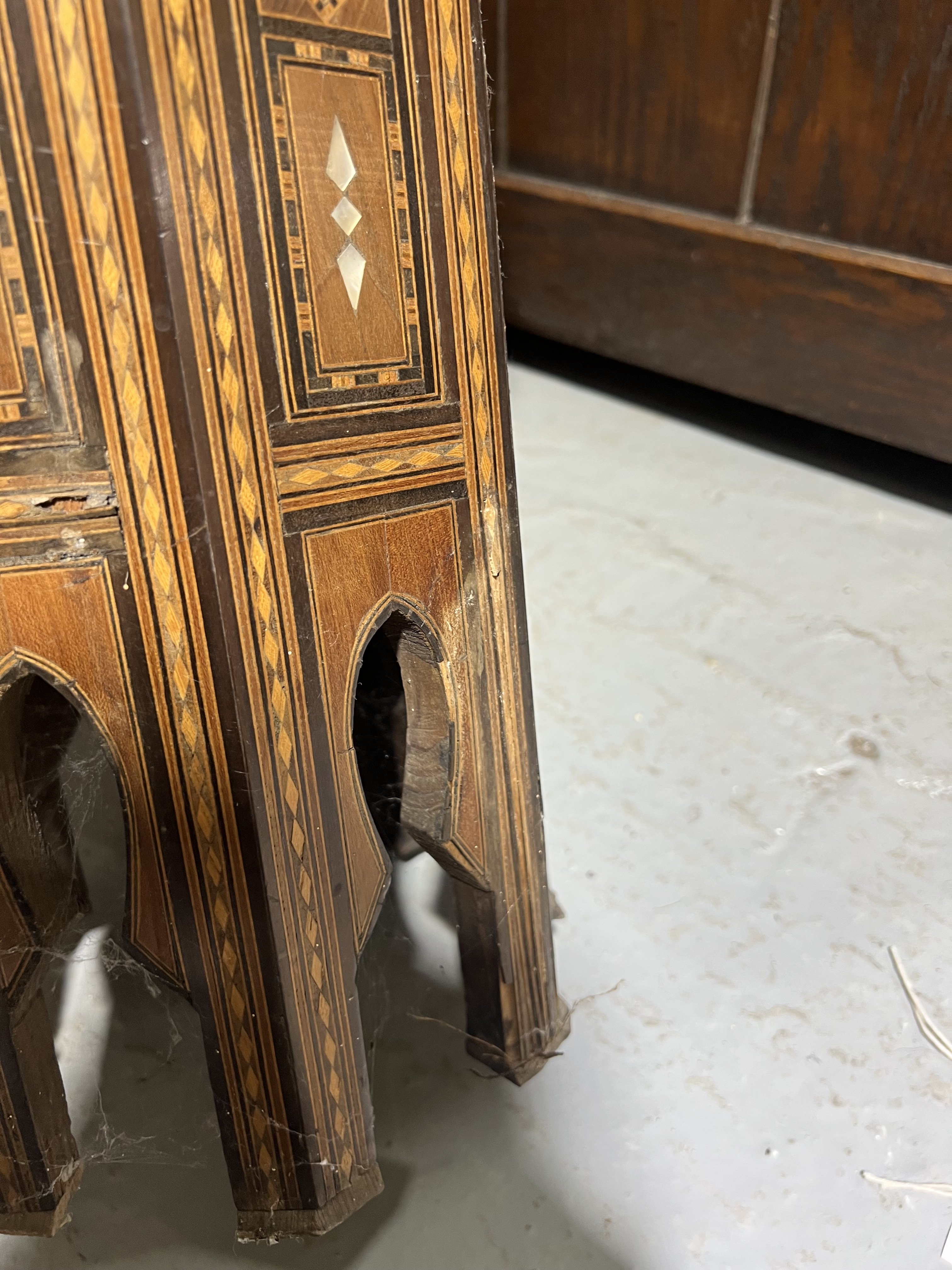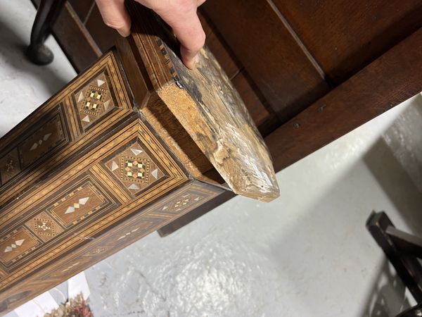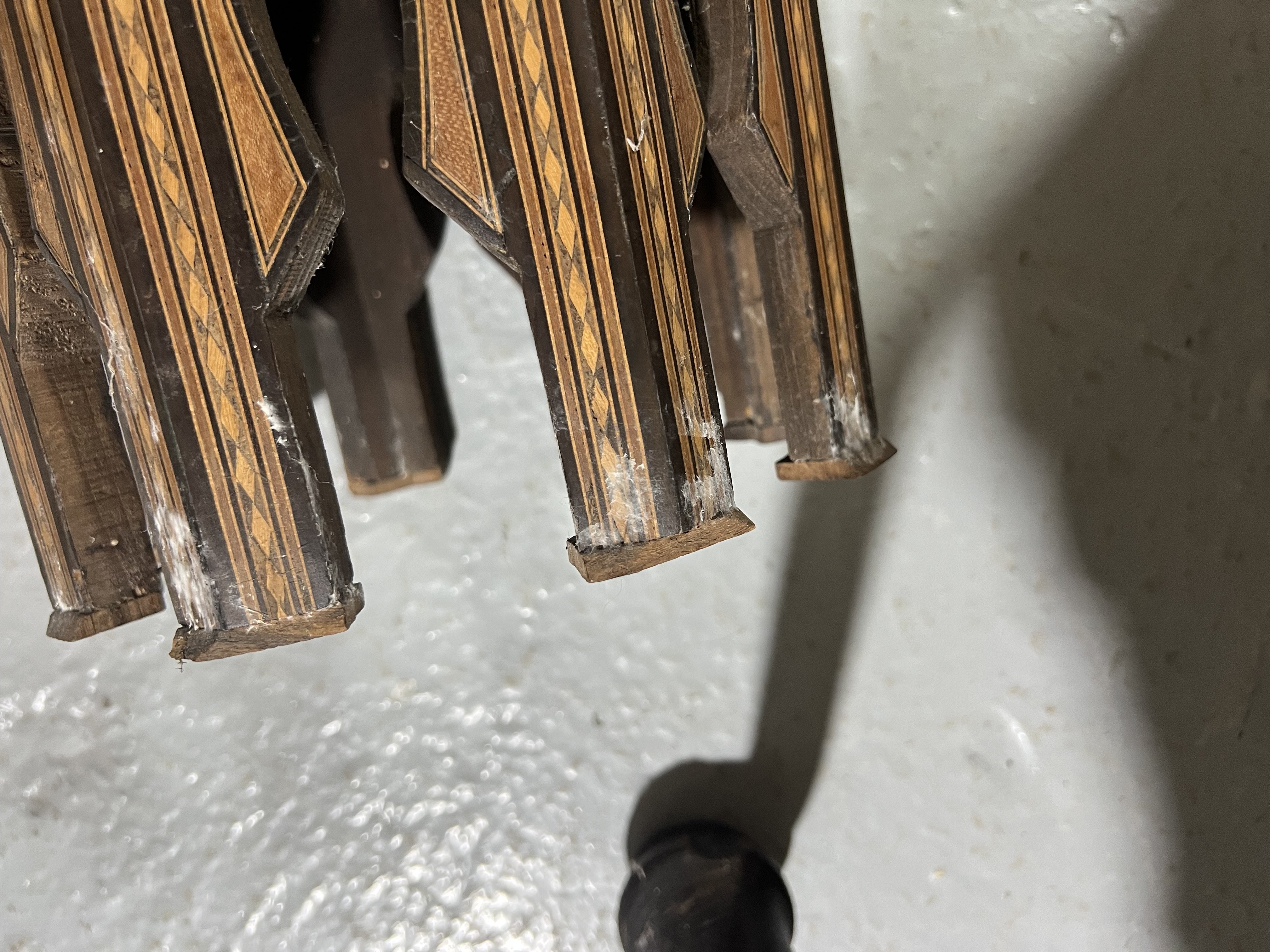 white marks present to left side table are old cobwebs, this table also has some losses to the top and all supports chipped, the other table also suffers with chipped supports and section of inlay missing around the body, see images.