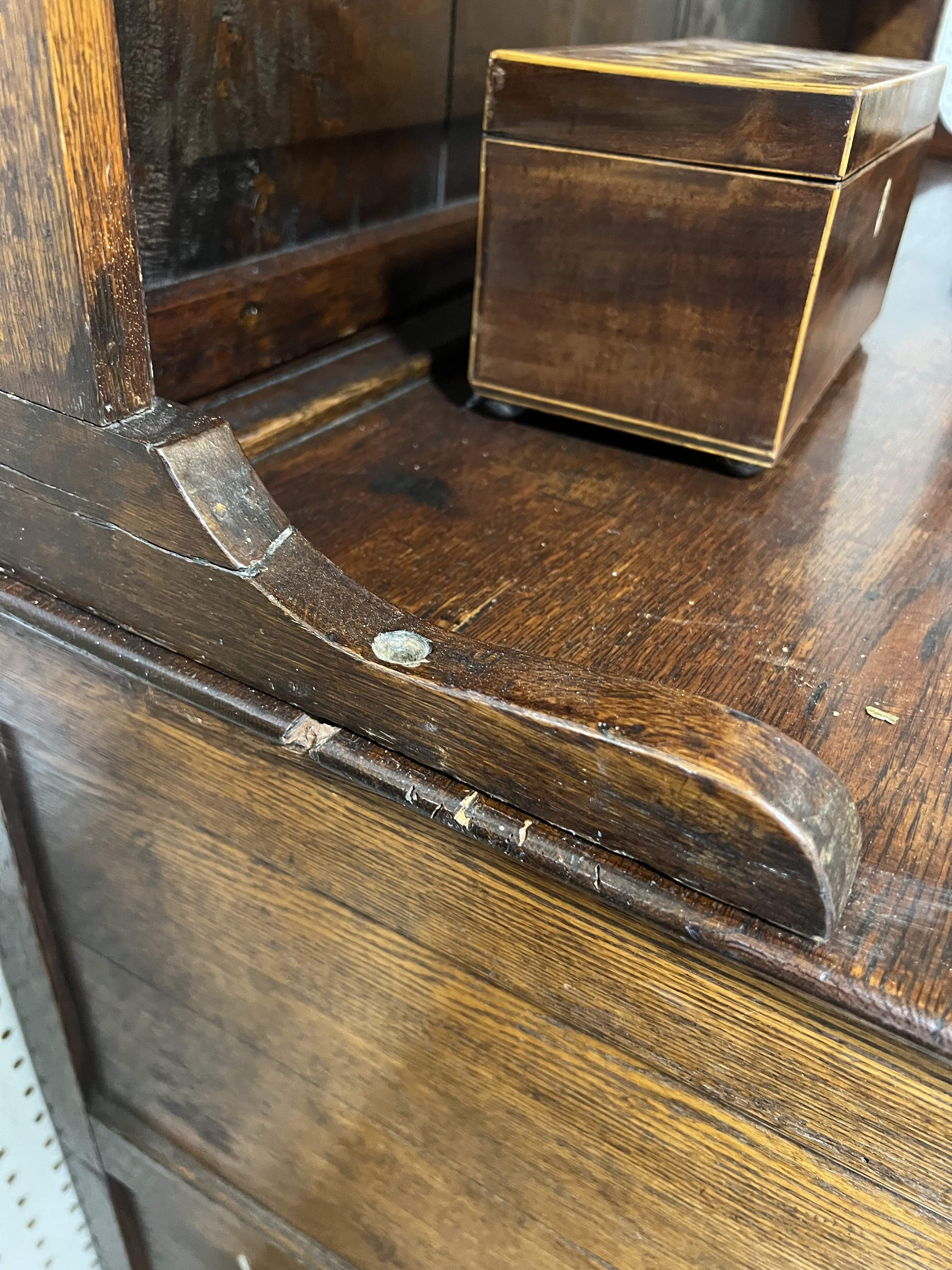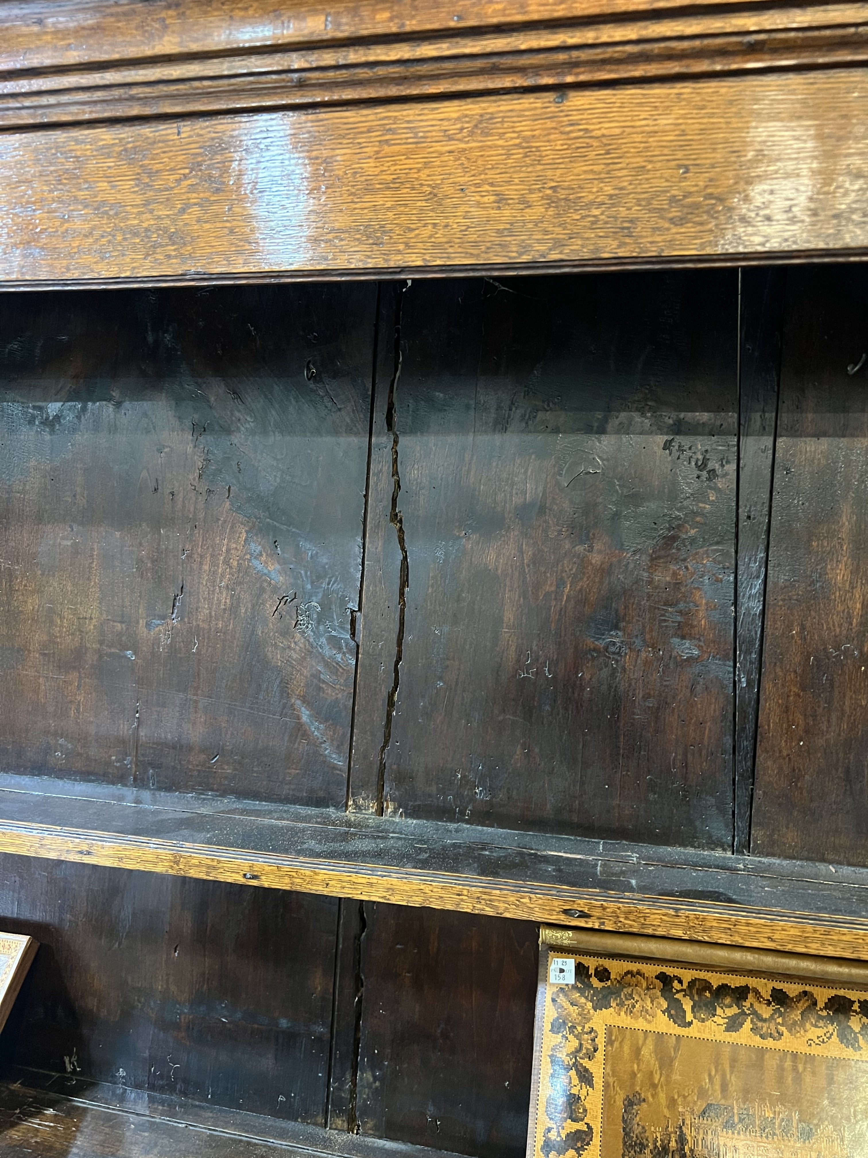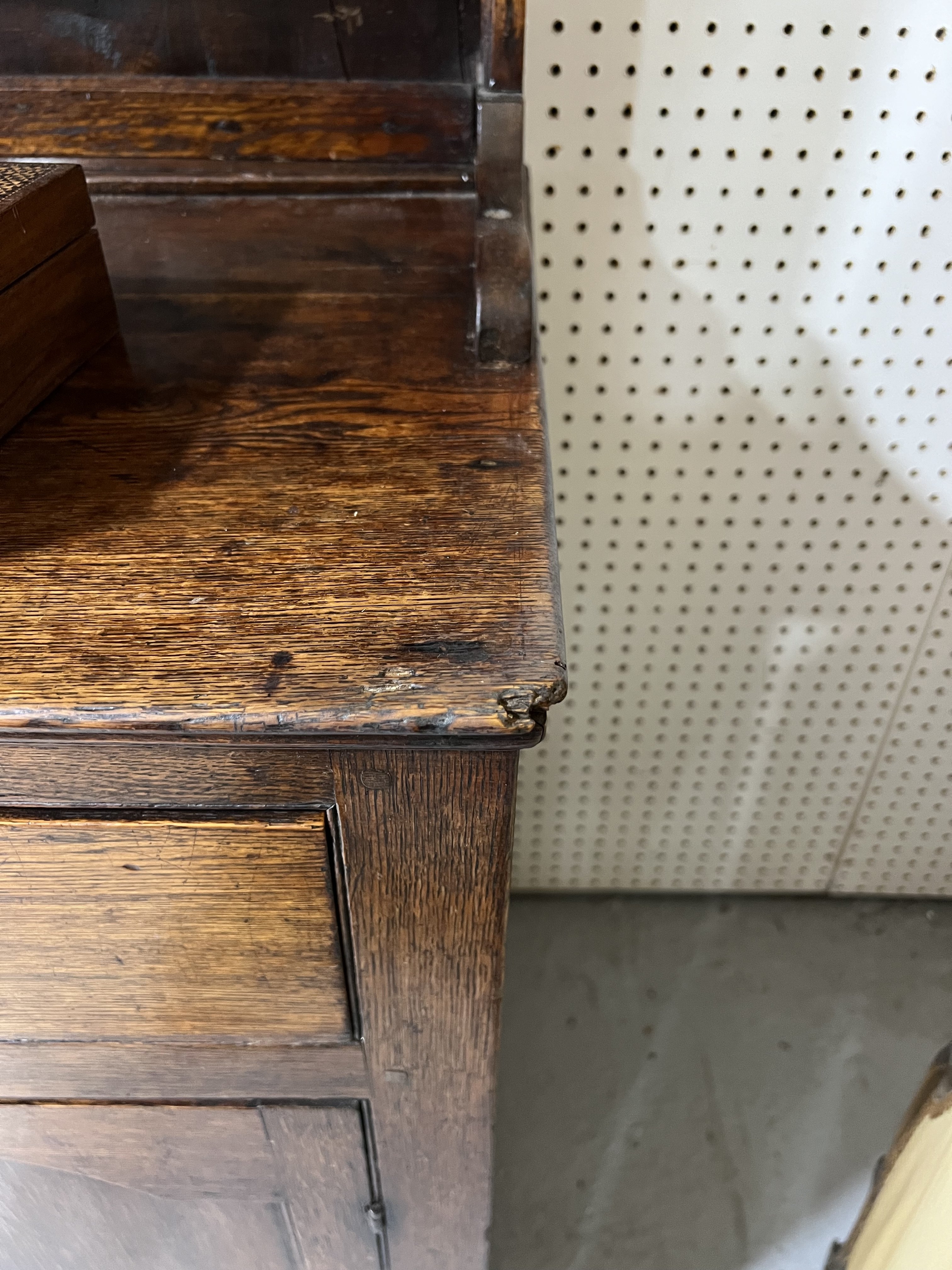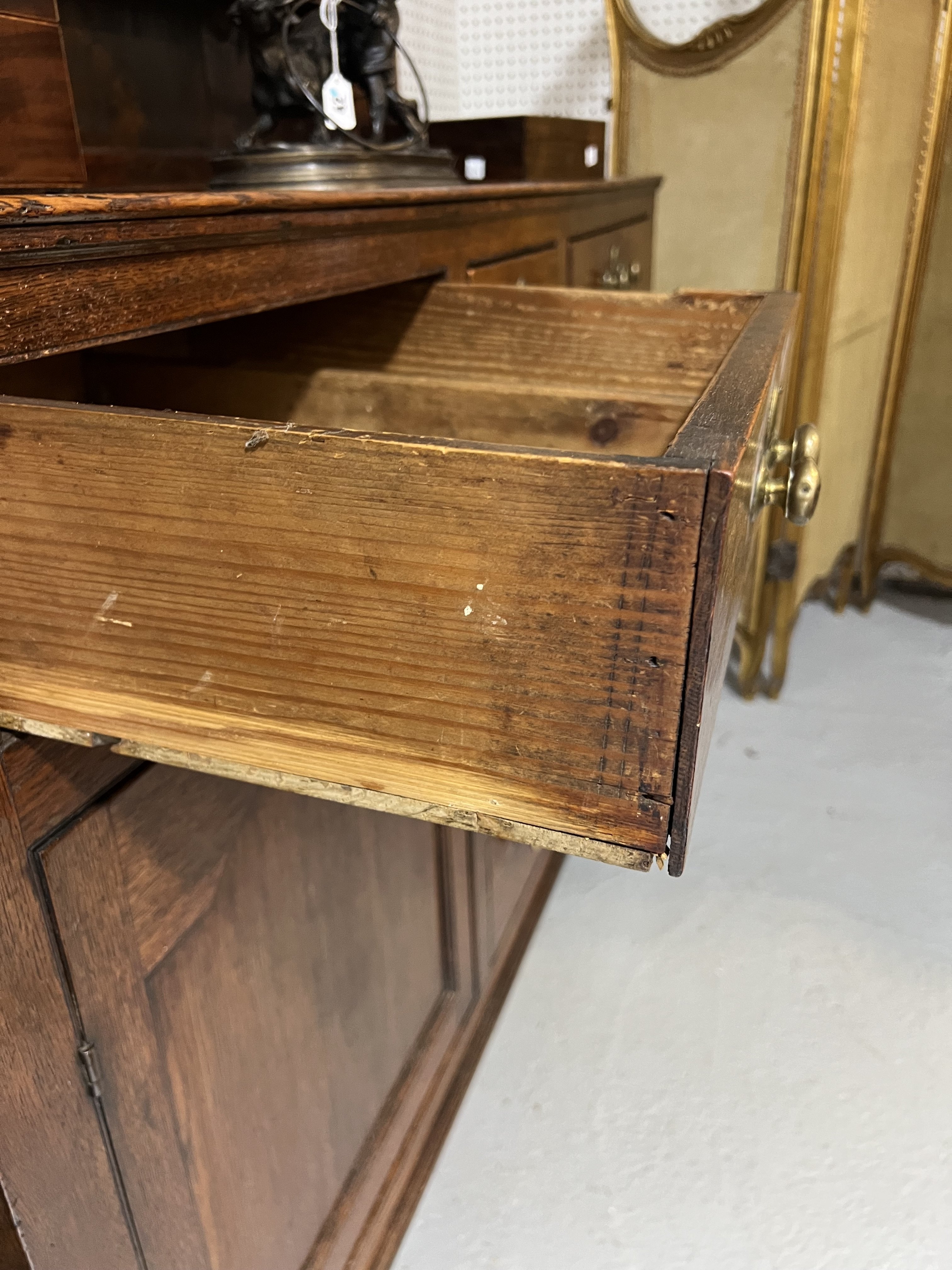 old marks and scratches expected with the age of the item, backboard split, small chips at the front corners of the top, later pine shelves fitted to base, three central drawers flanked by cupboards are dummy drawers and do not function.