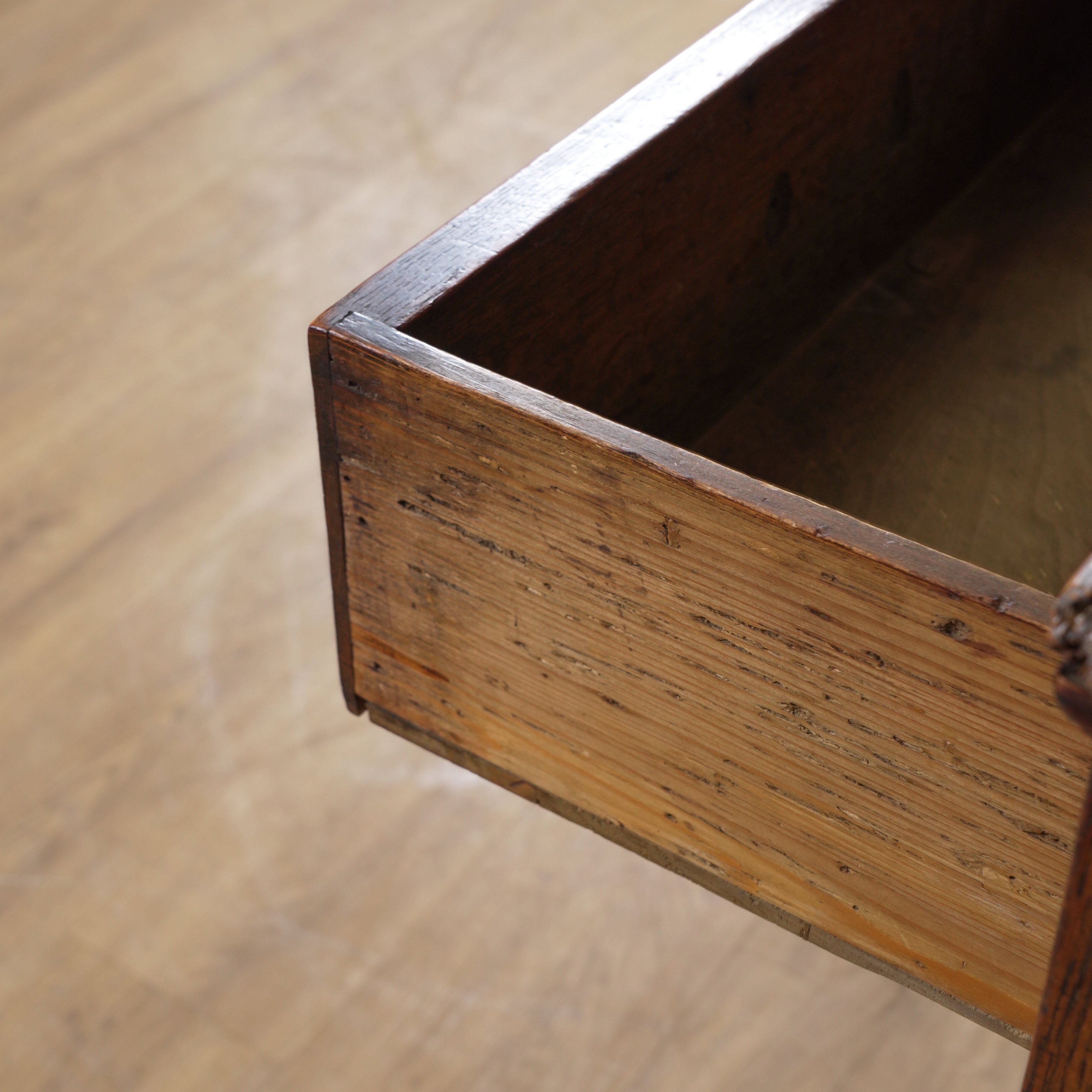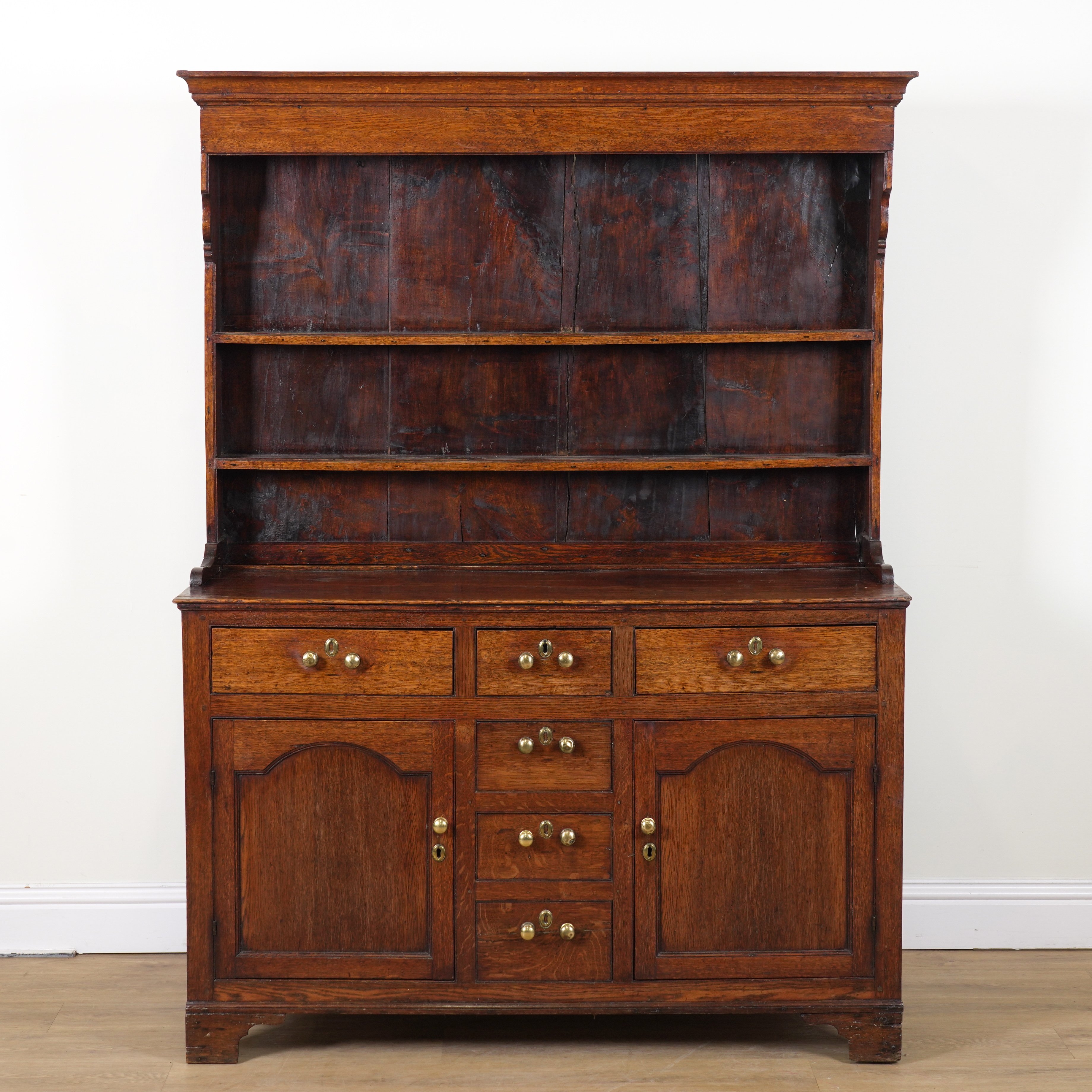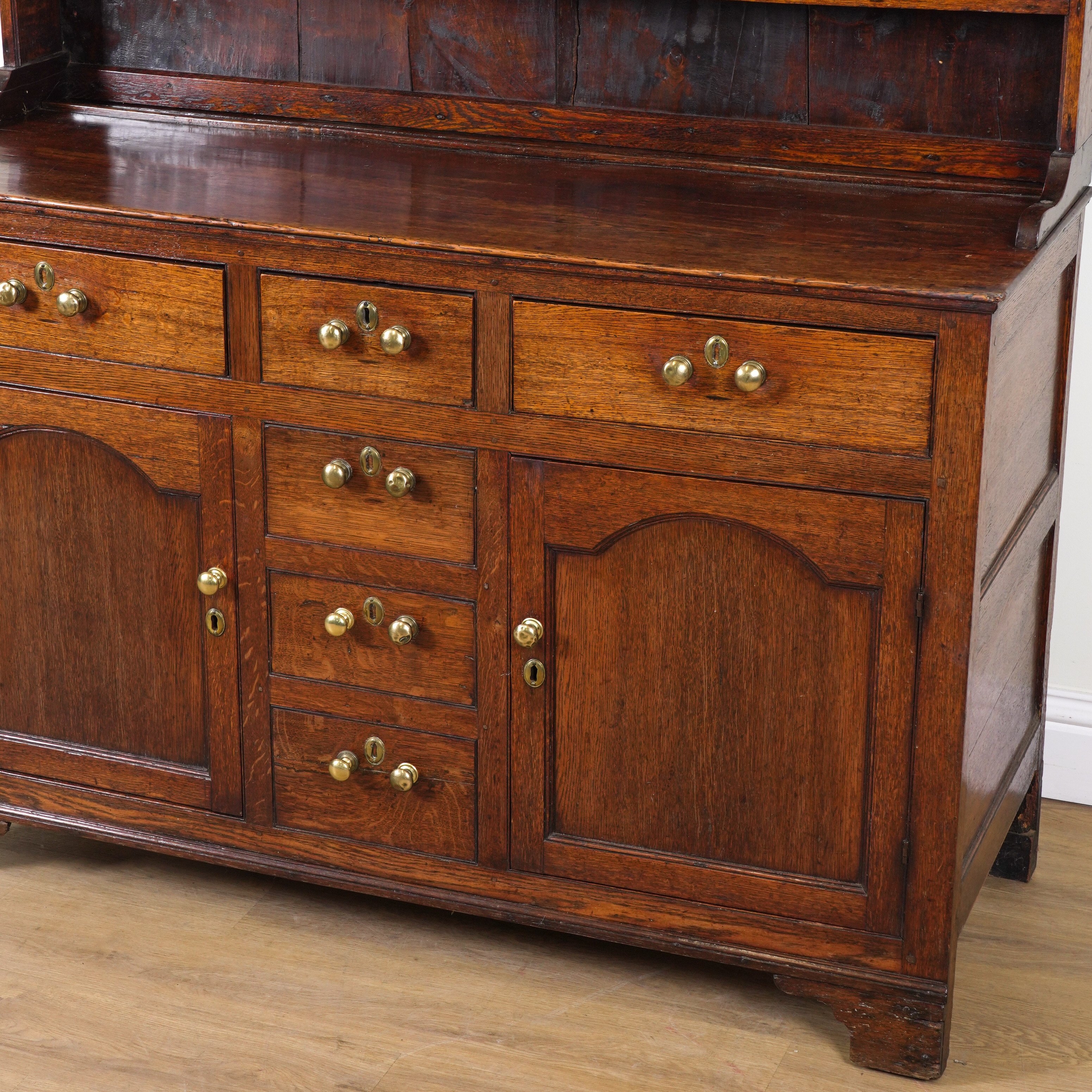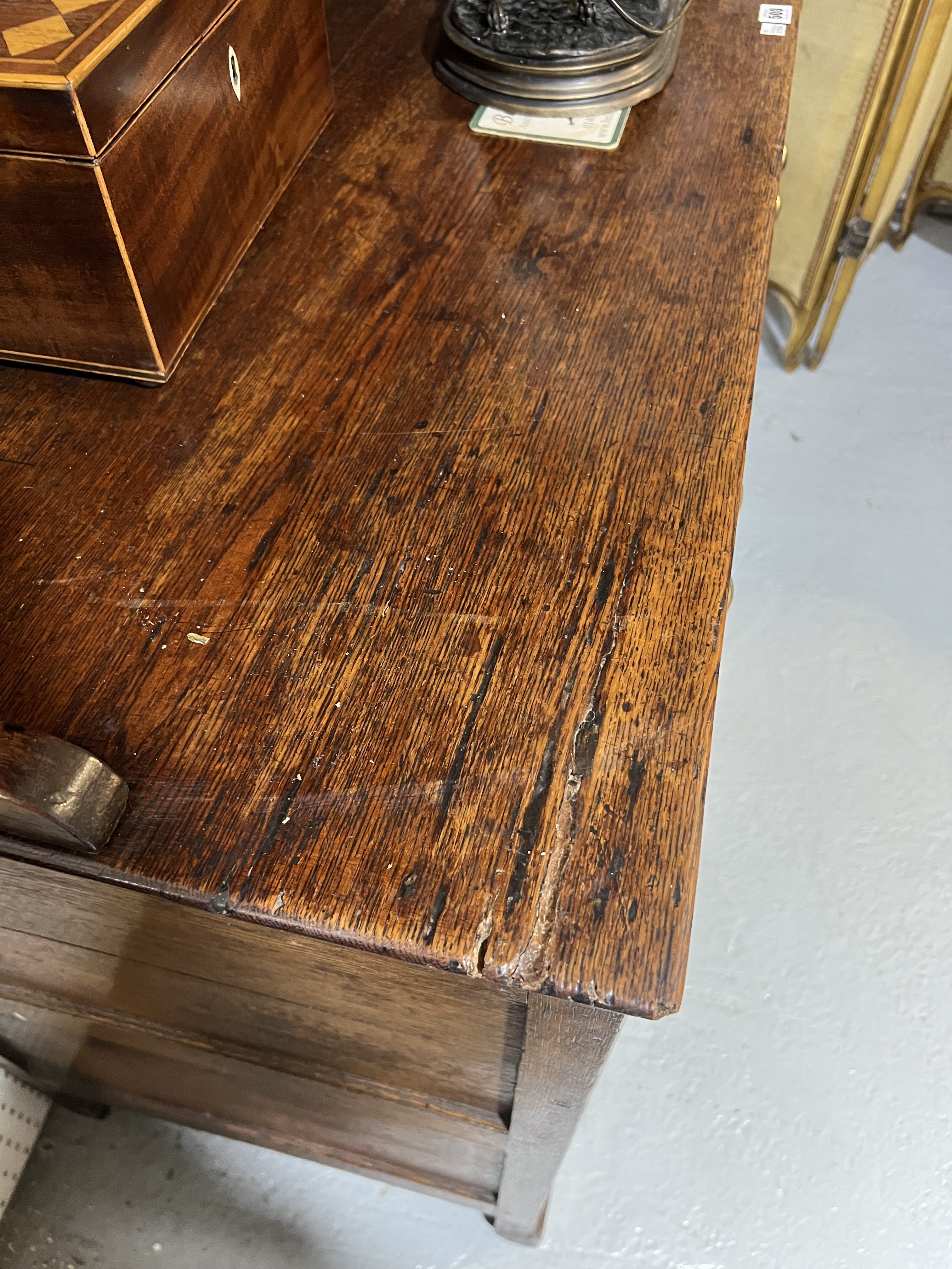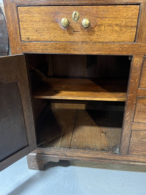 old marks and scratches expected with the age of the item, backboard split, small chips at the front corners of the top, later pine shelves fitted to base, three central drawers flanked by cupboards are dummy drawers and do not function.