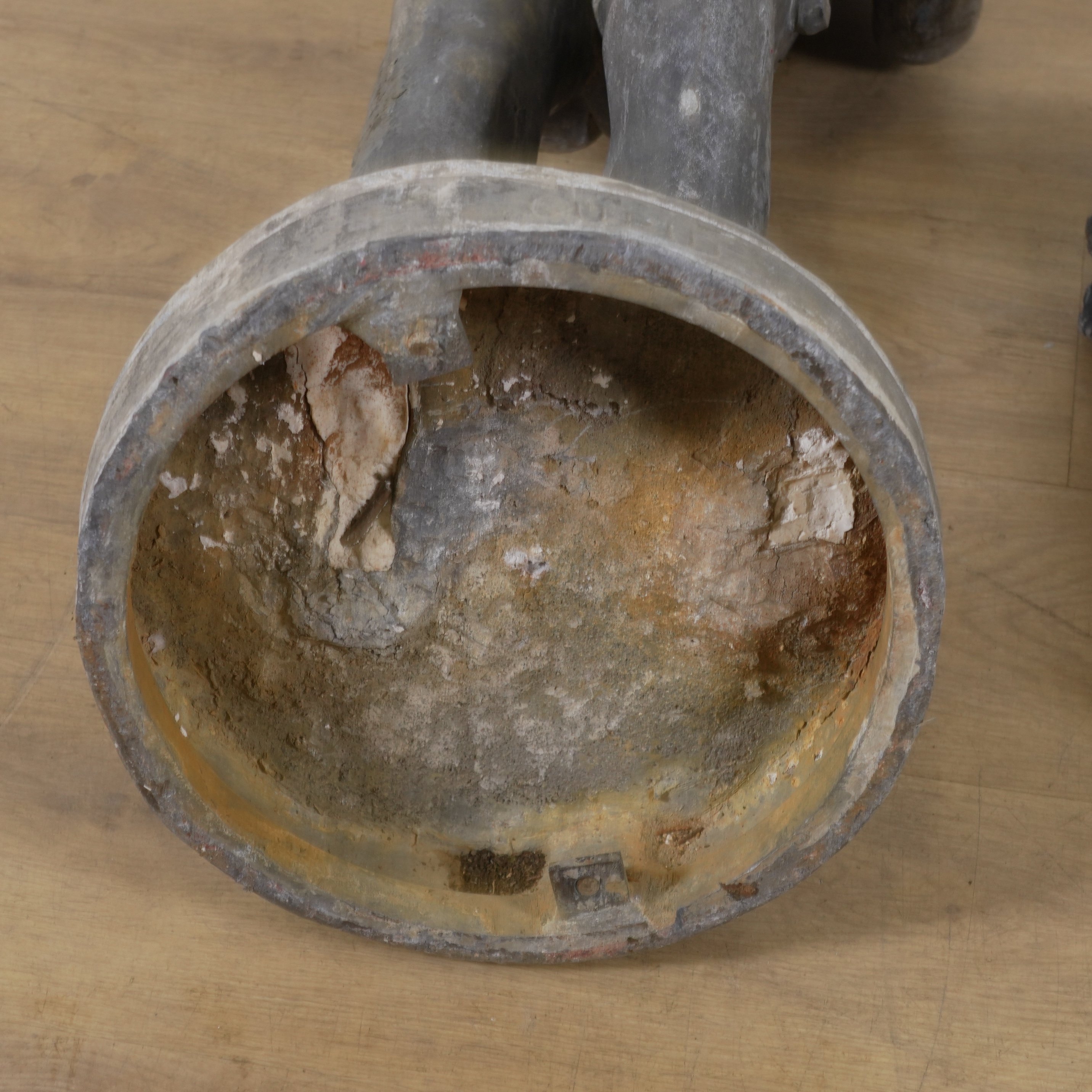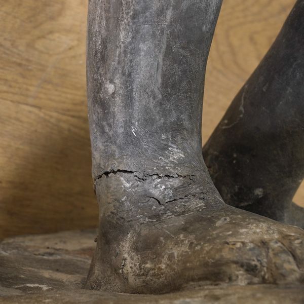 lead figure has a break at one ankle, the figure does not stand upright due the break with the weight pulling the figure forward, will require some restoration, the loose stand would of originally been attached to figure.