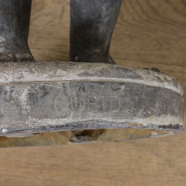 Late 19th / early 20th century, modelled with bow, inscribed CUPID to the base, damage to ankle, 96cm high; together with a lead anthenienne stand modelled with two birds, 42cm high