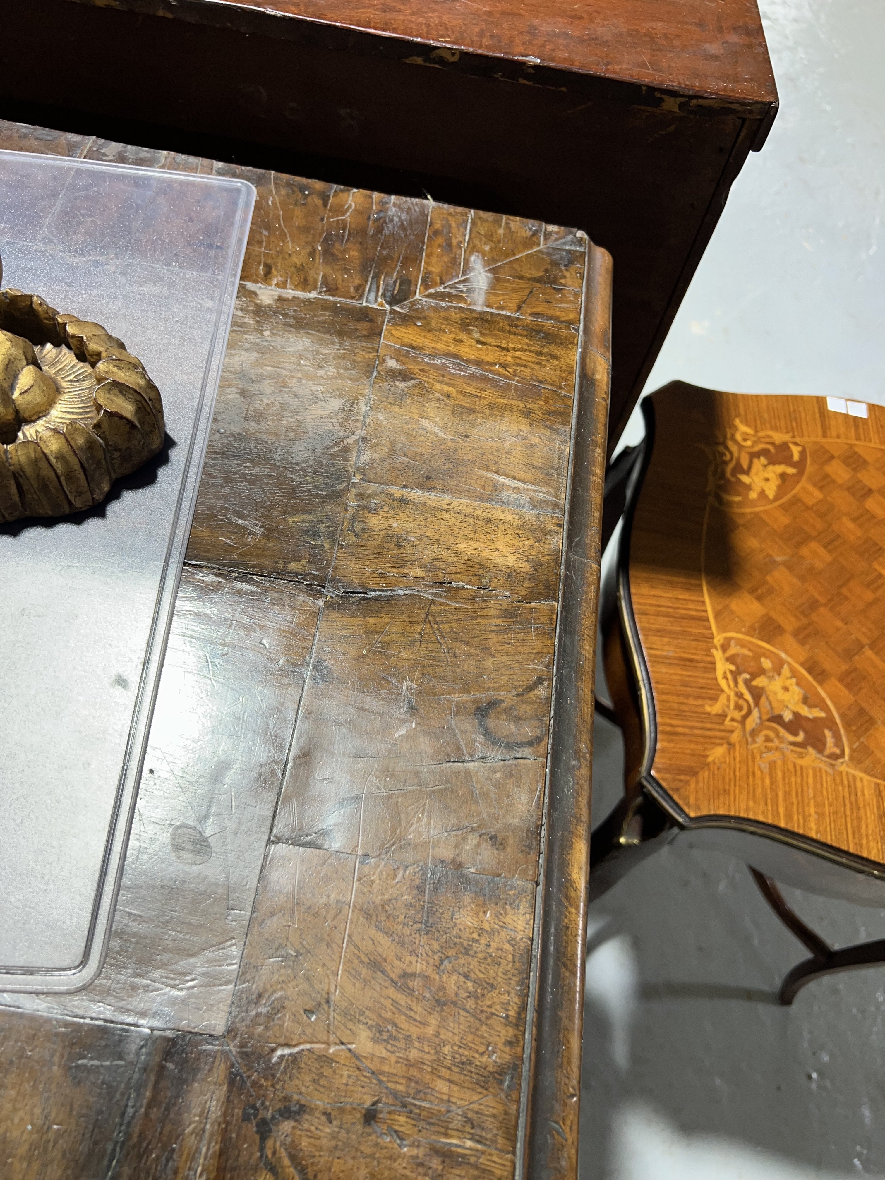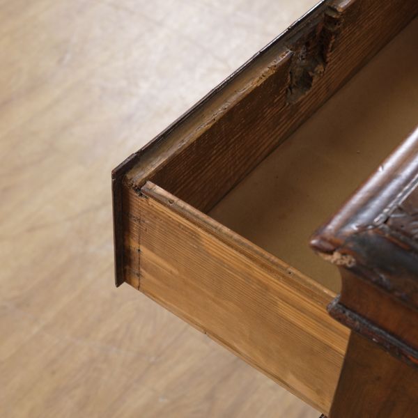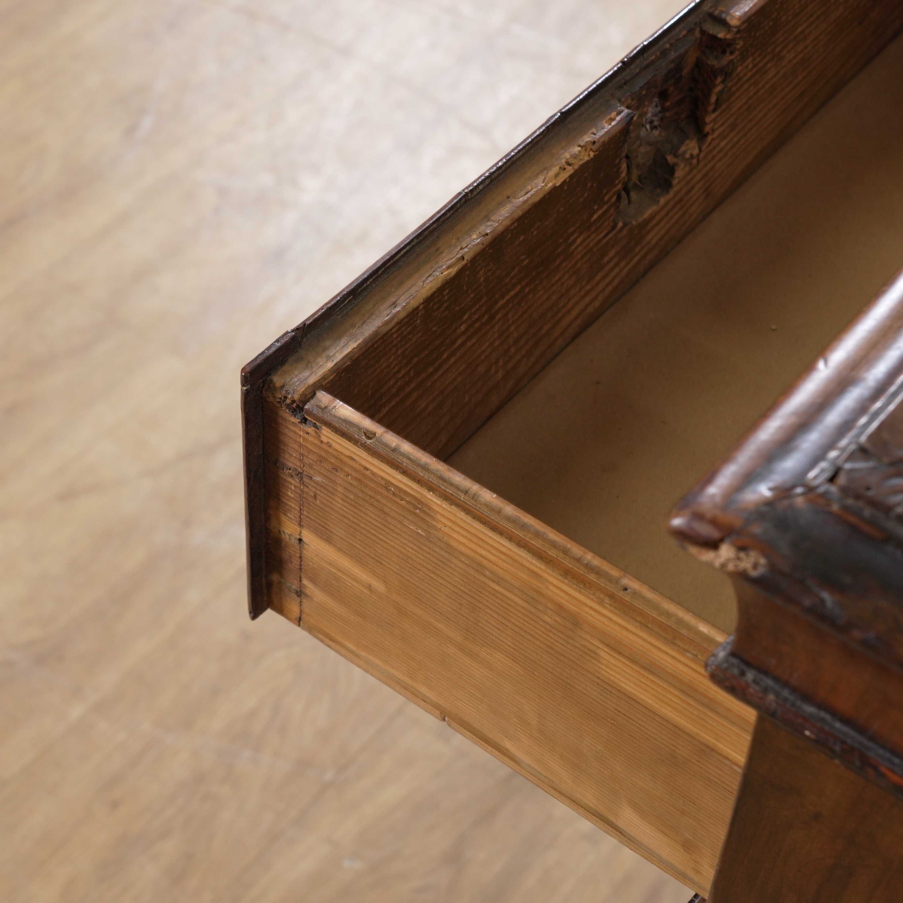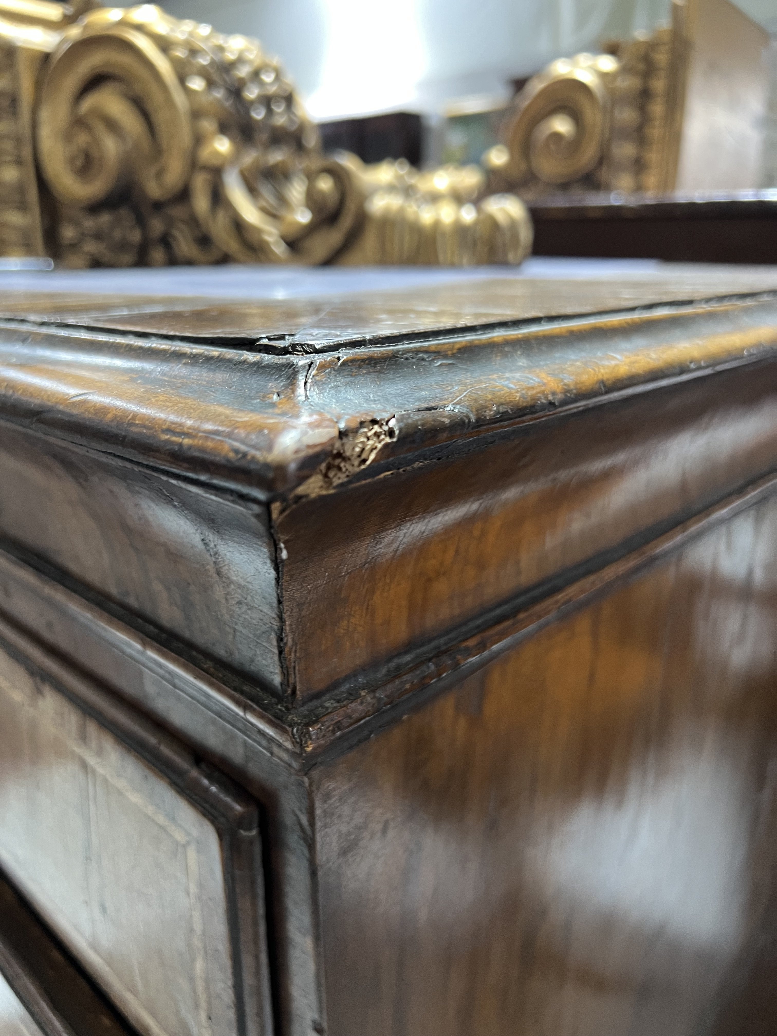 old marks and scratches expected with the age of the item, multiple splits and cracks to the veneered top, splits towards the drawer fronts, later supports fitted, with chips around the bottom edges,