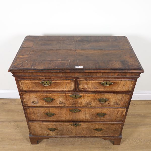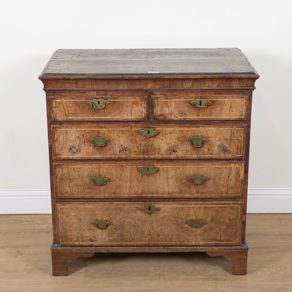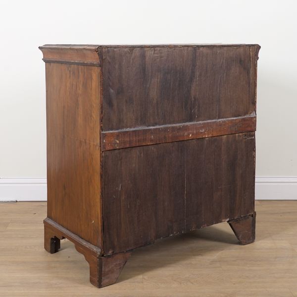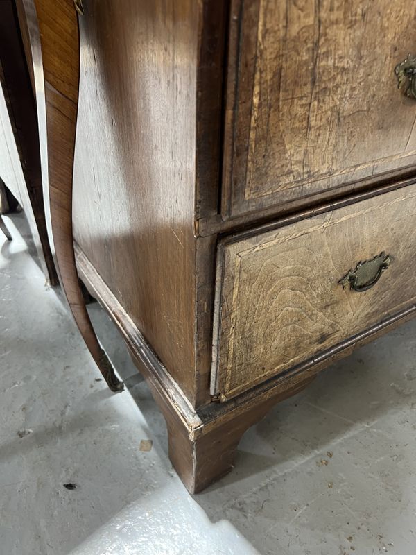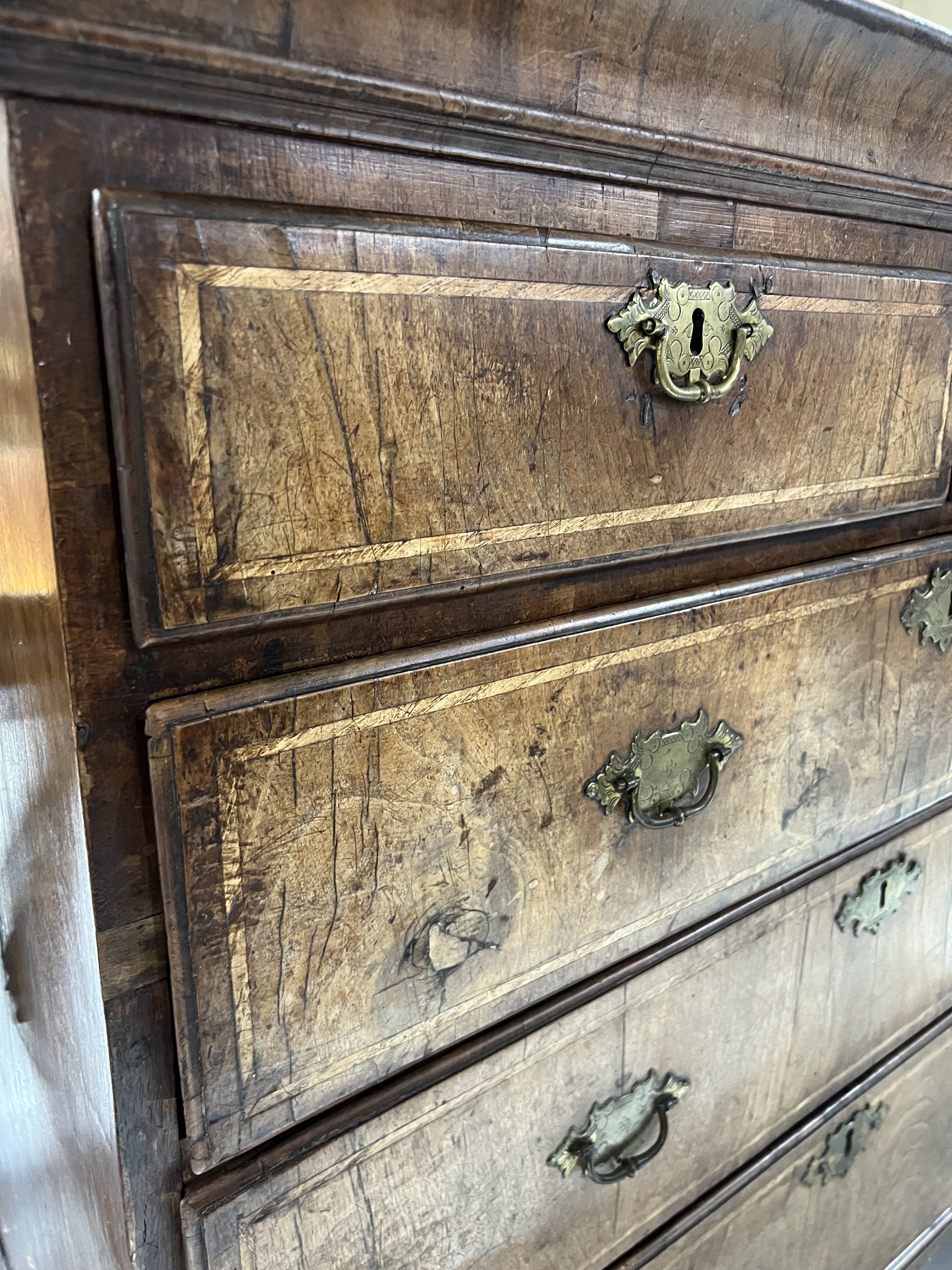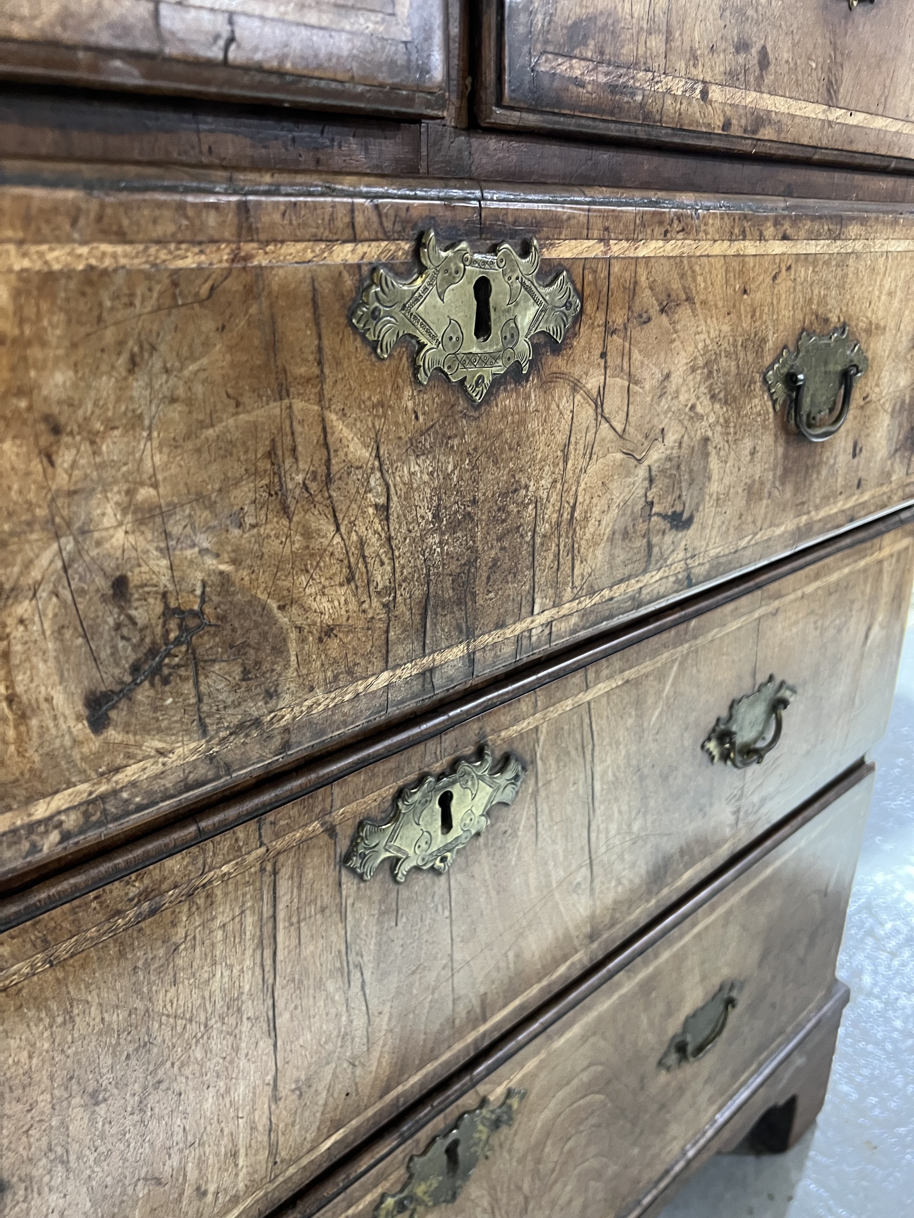 old marks and scratches expected with the age of the item, multiple splits and cracks to the veneered top, splits towards the drawer fronts, later supports fitted, with chips around the bottom edges,