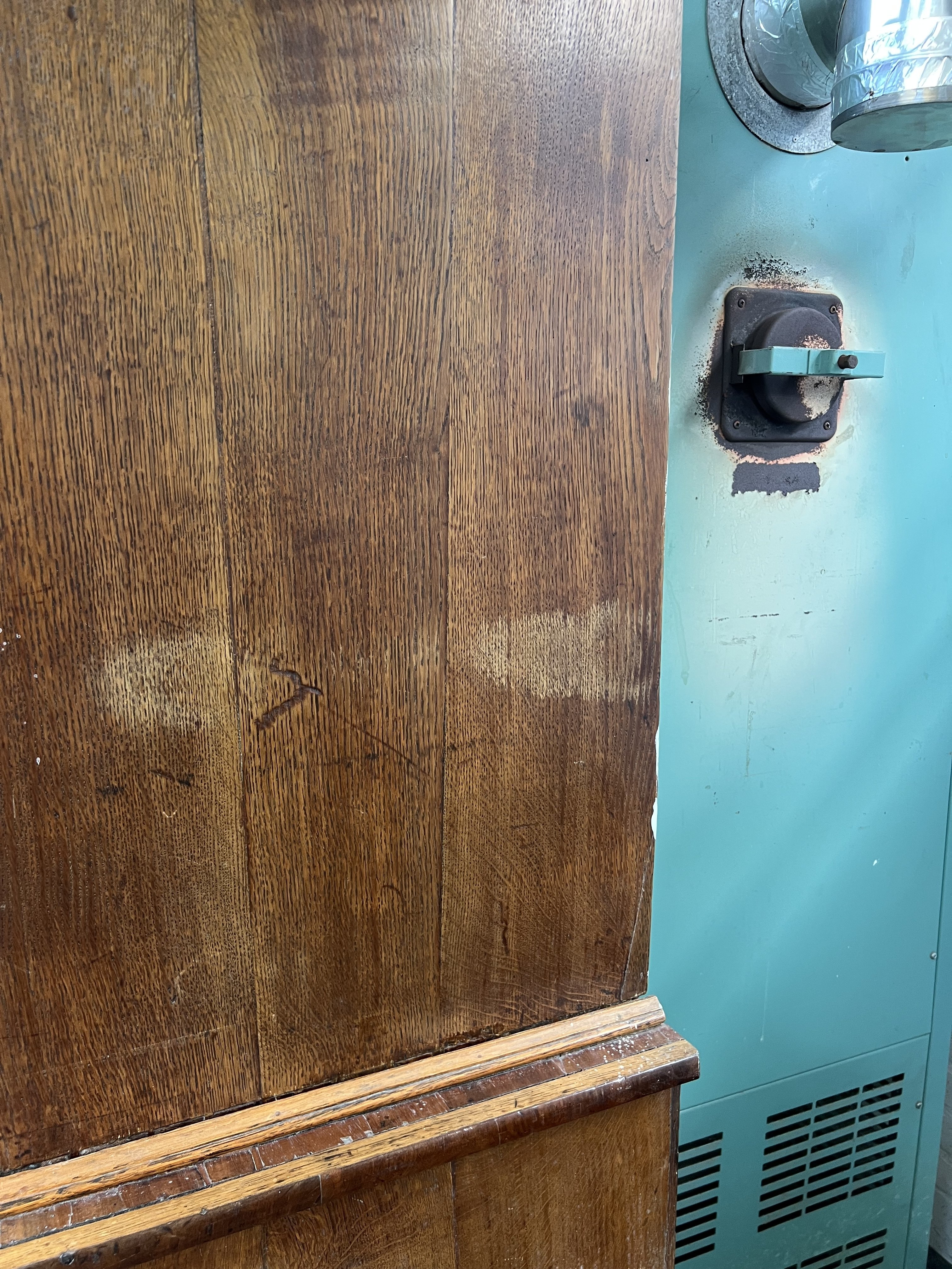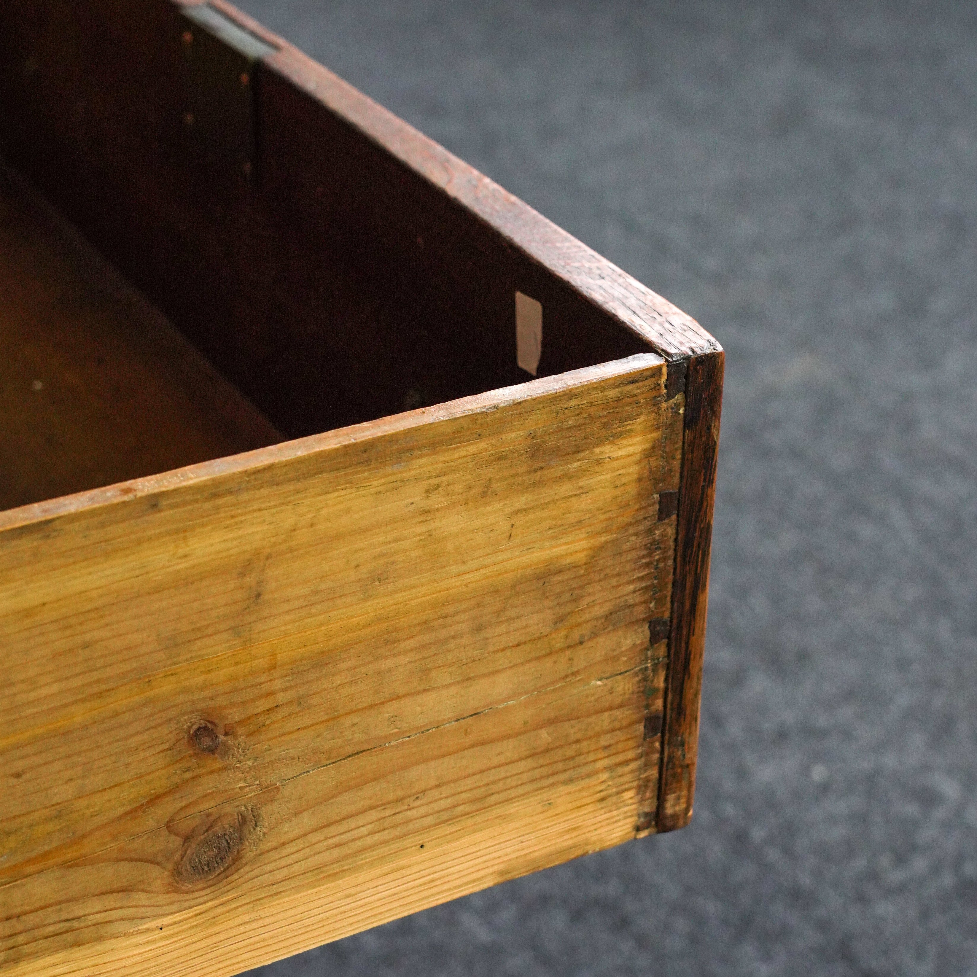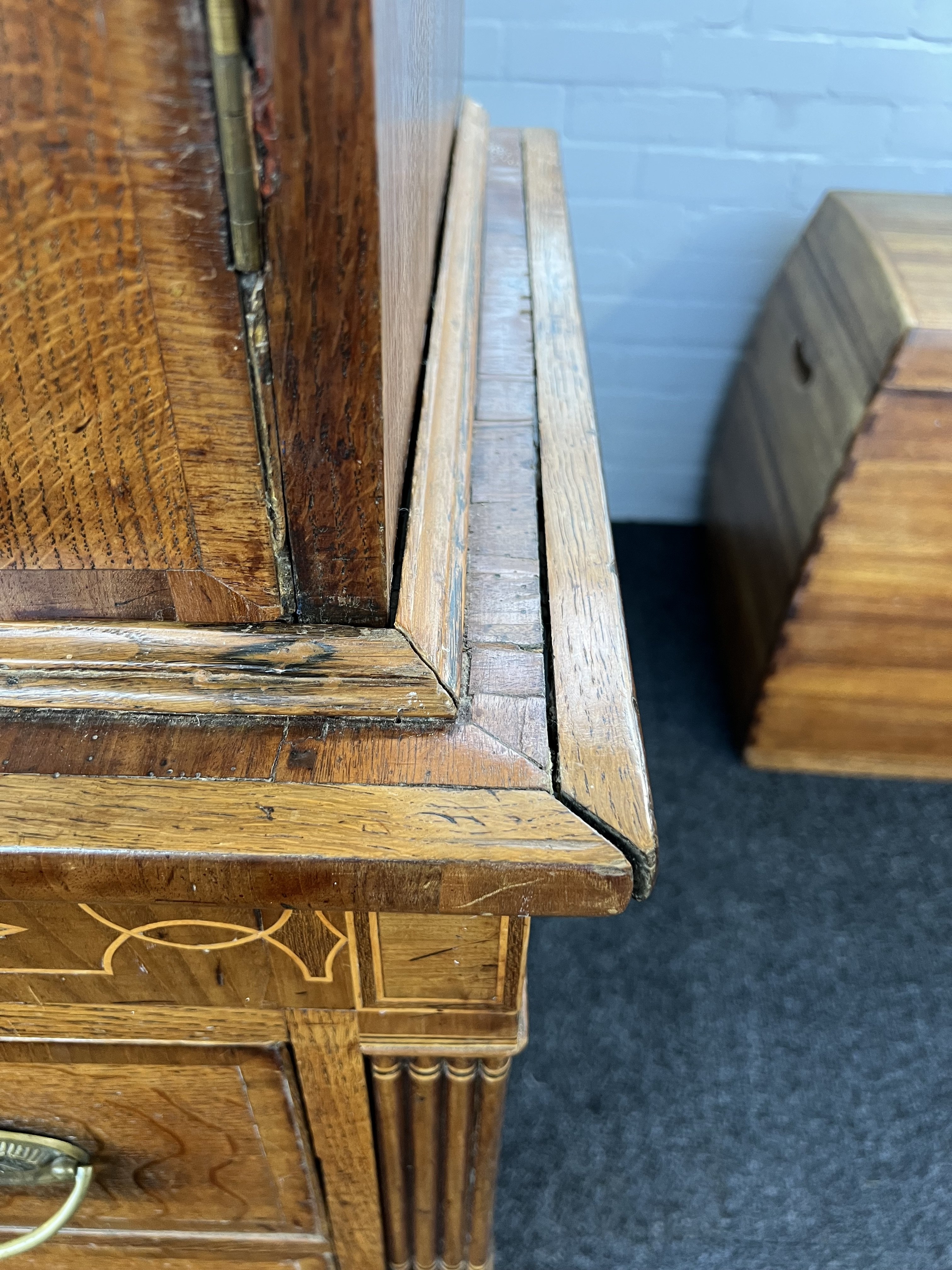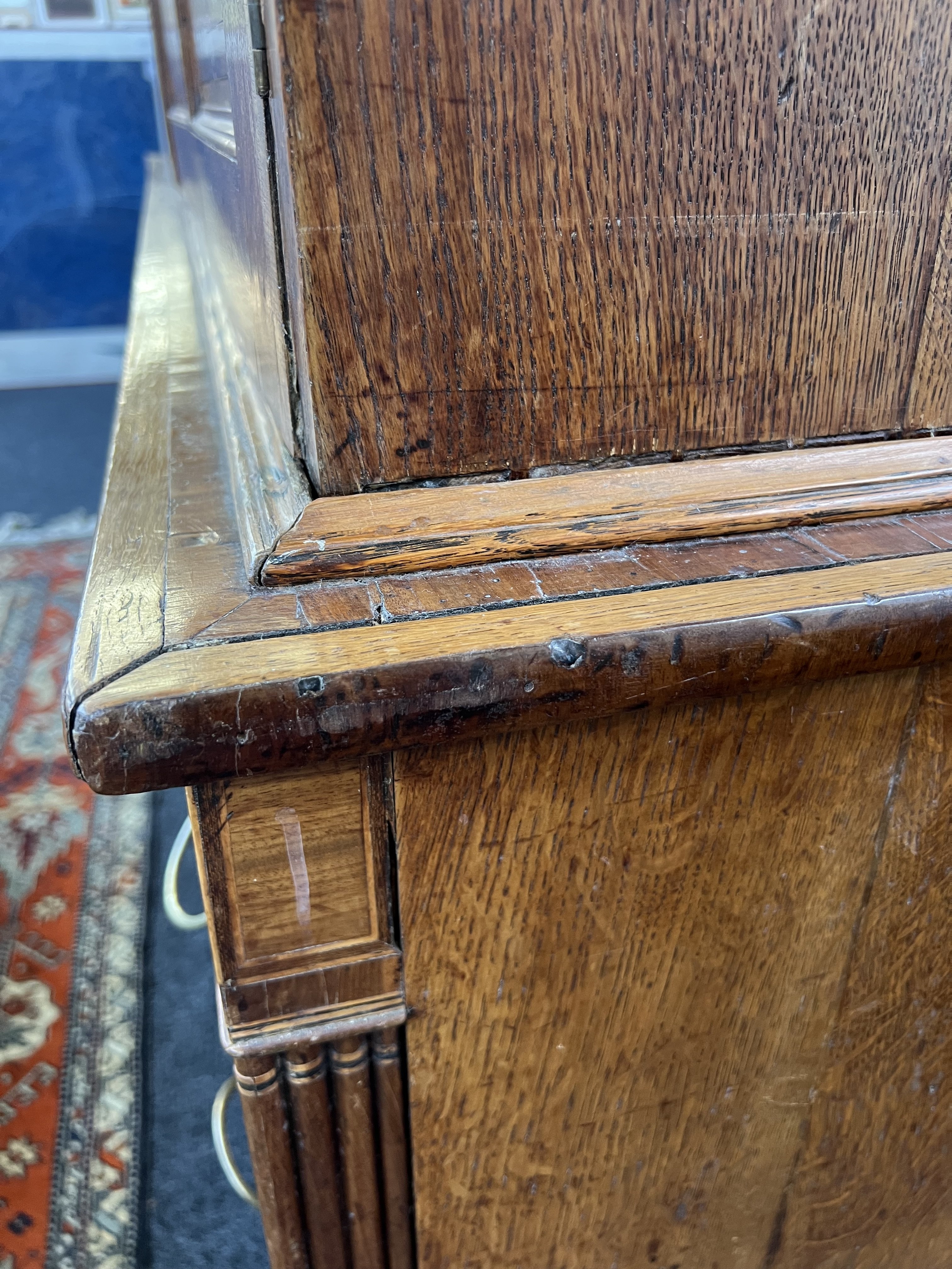 good overall condition, old marks and scratches present, signs of old repairs around the piece towards the moulded edge of top, and split sides, no key present