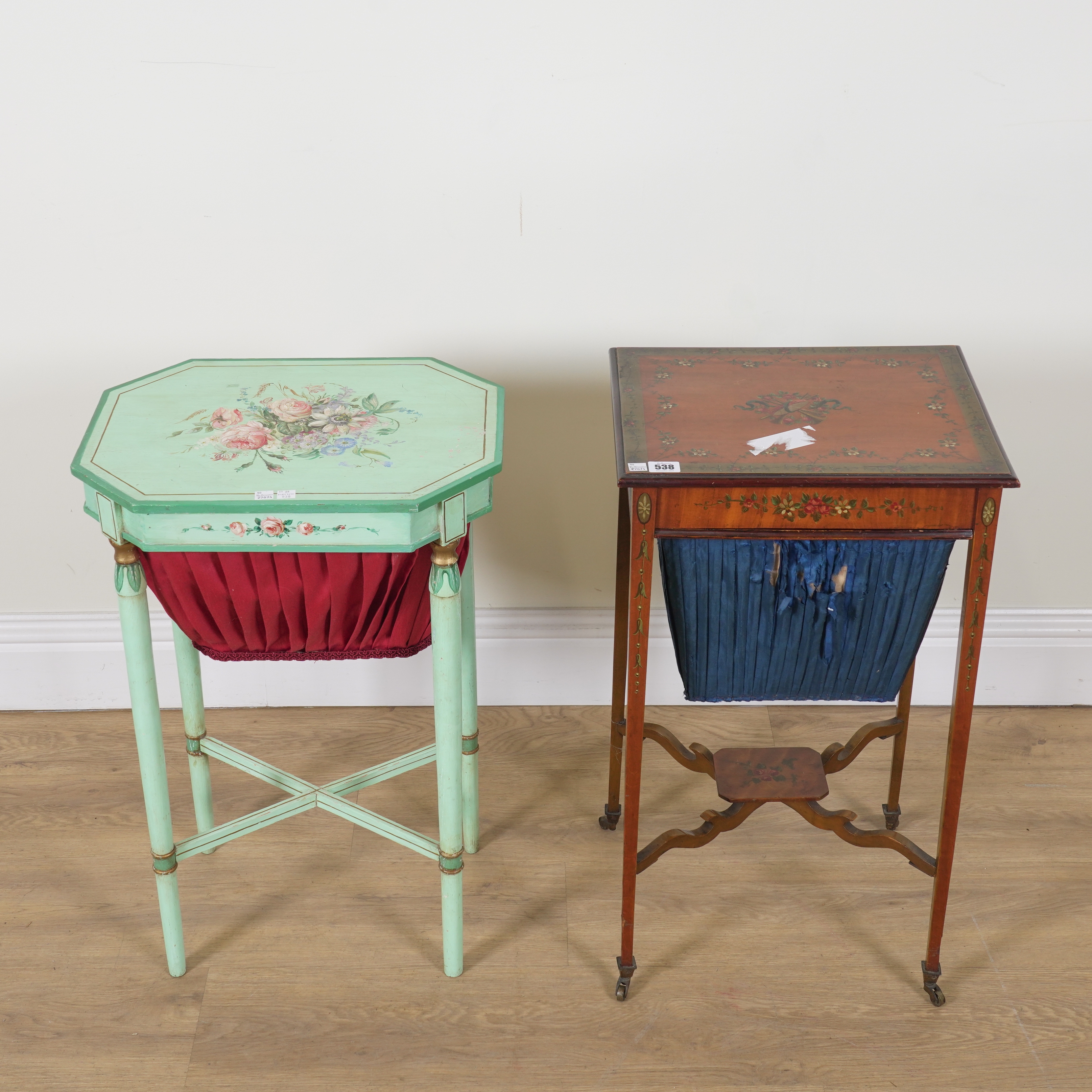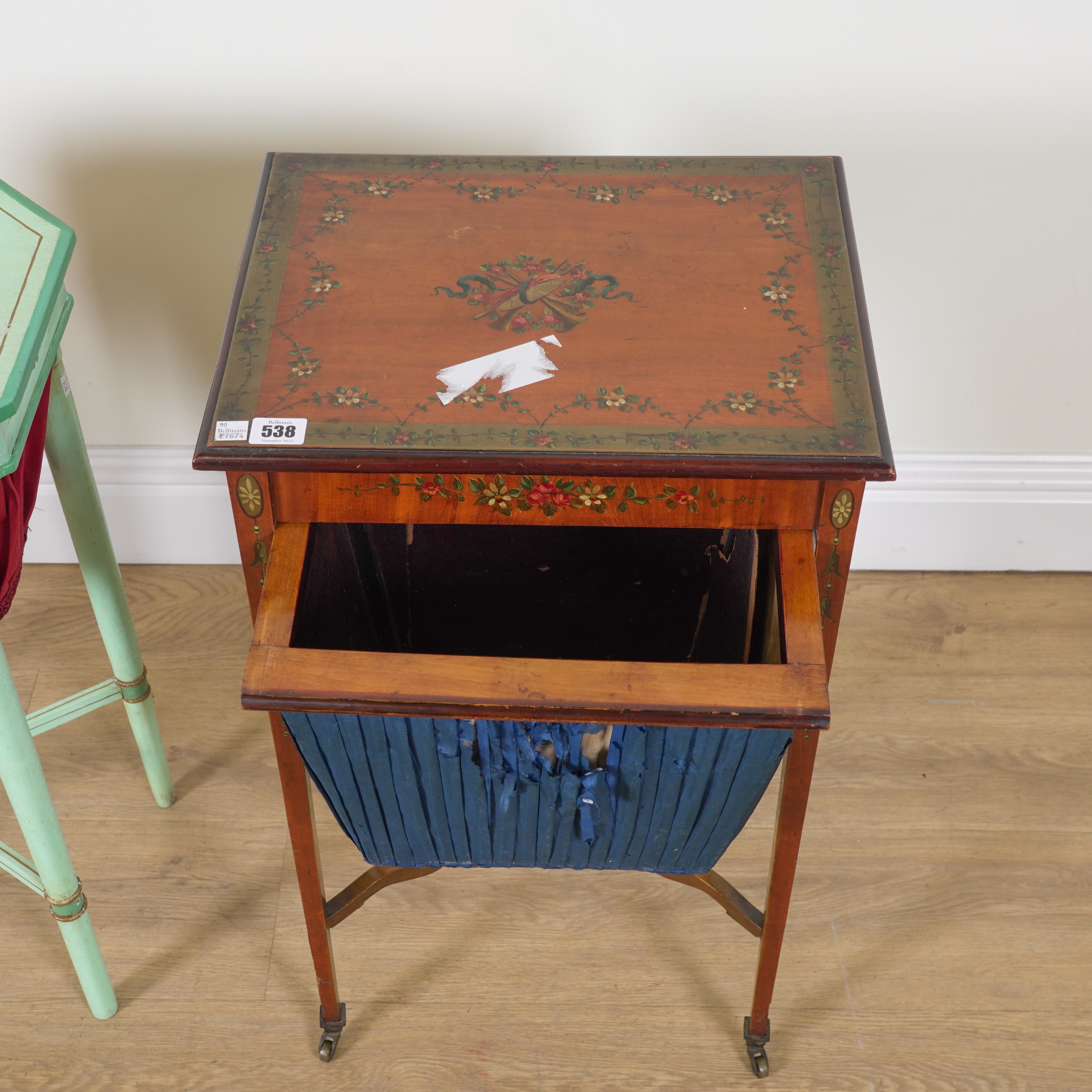AN EDWARDIAN POLYCHROME PAINTED SATINWOOD WORK TABLE (2)