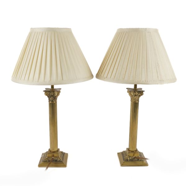 20th Century Each on square leaf-capped bases, fitted for electricity and with cream pleated shades, 52cm high