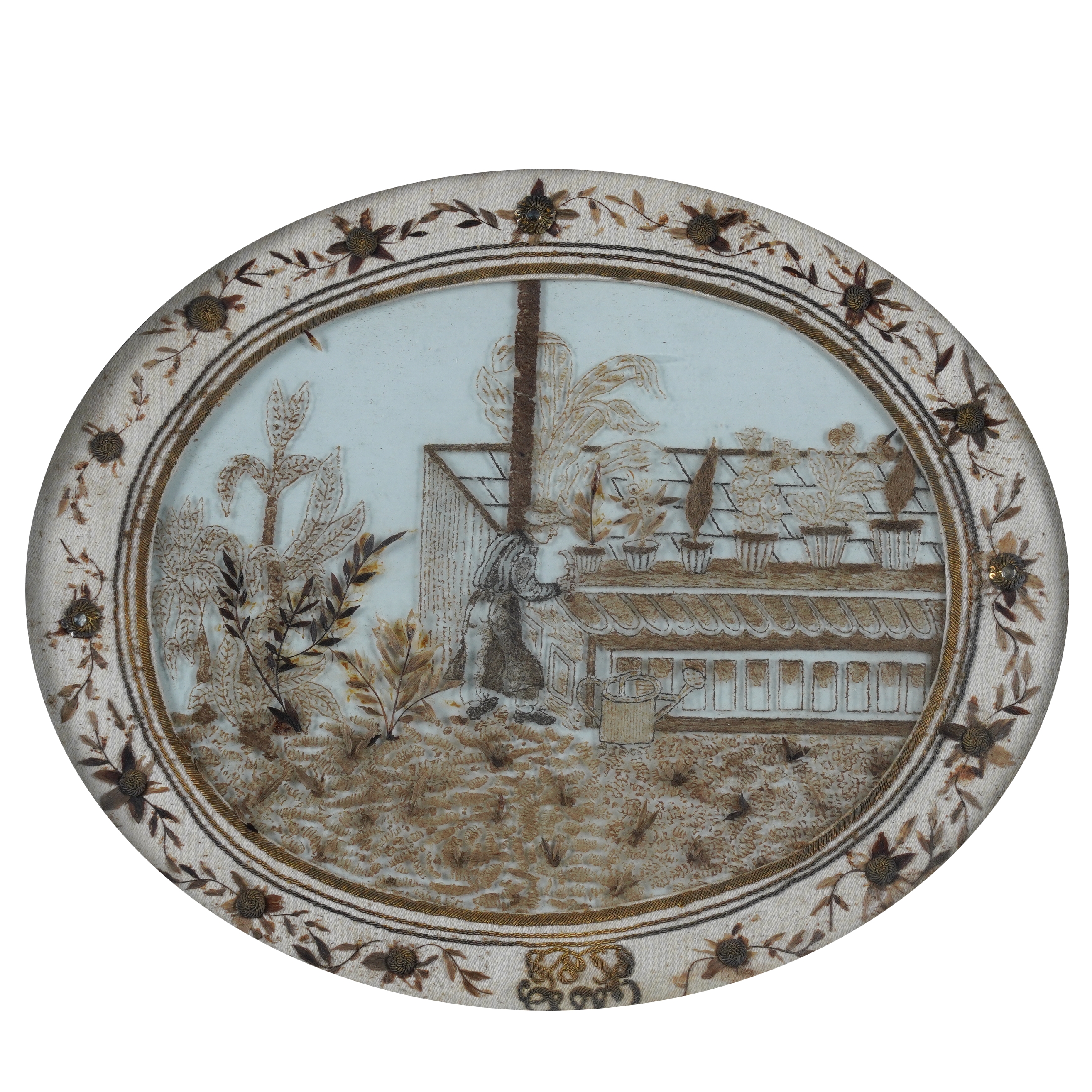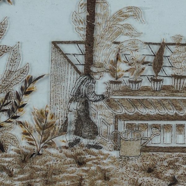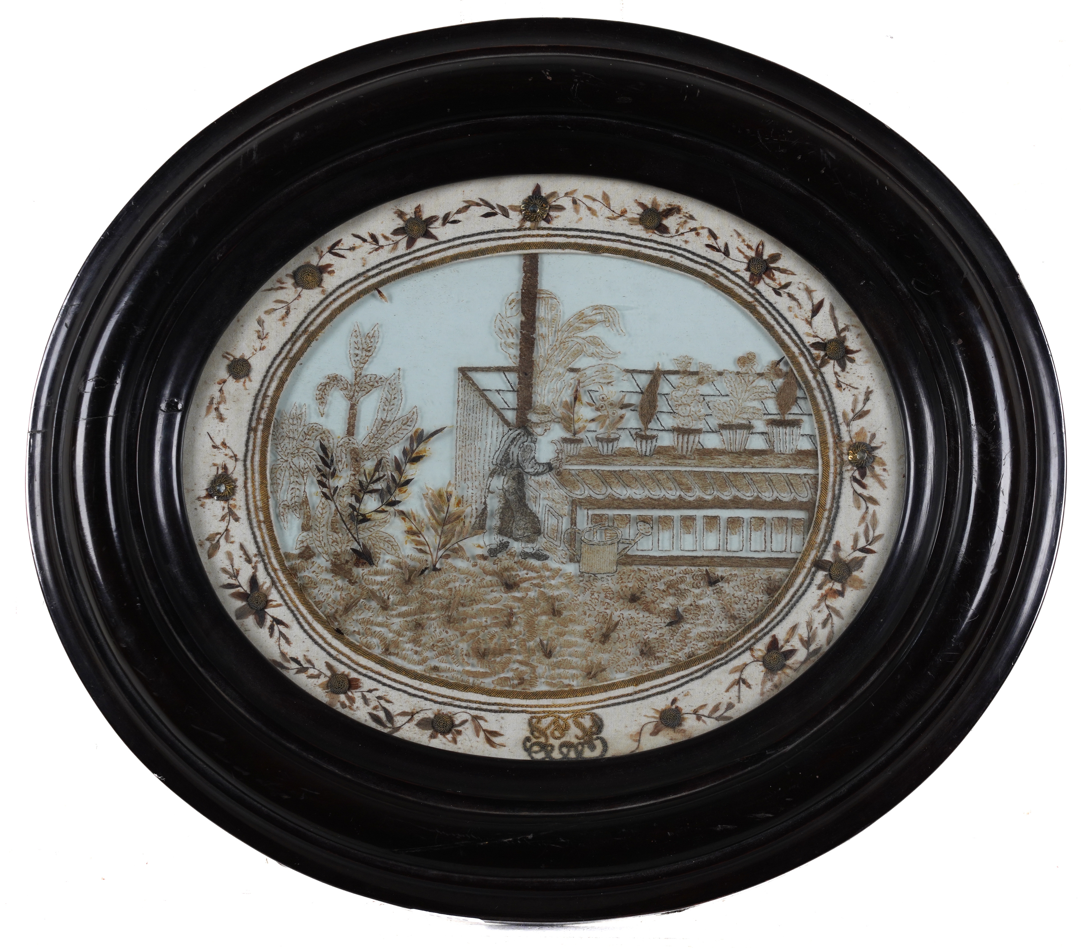 AN UNUSUAL NAPOLEON III HAIR WORK EMBROIDERED PICTURE DEPICTING A GARDENER AT WORK