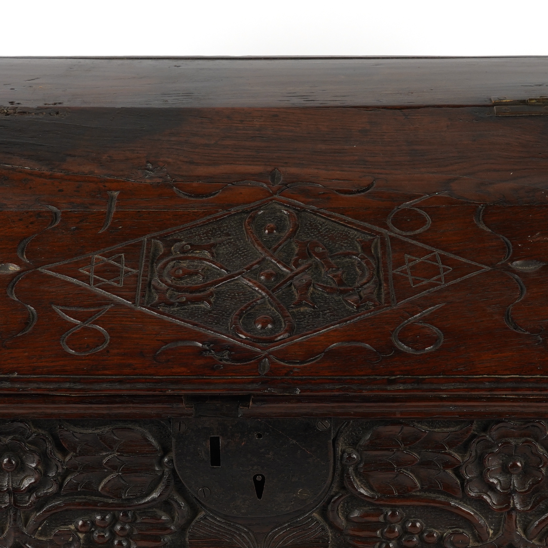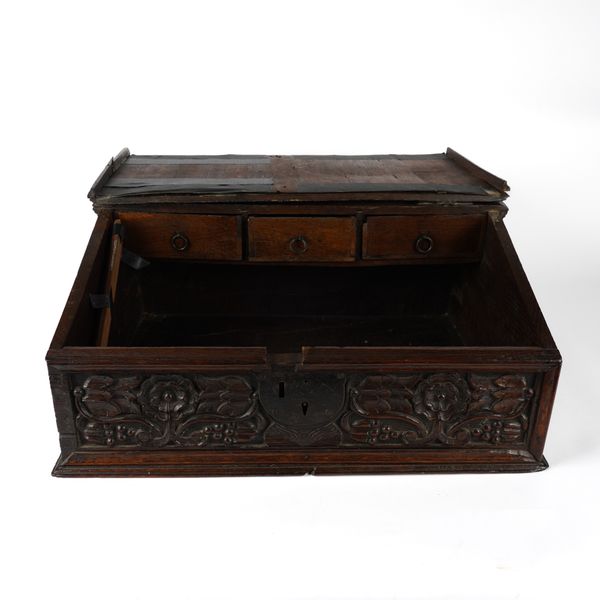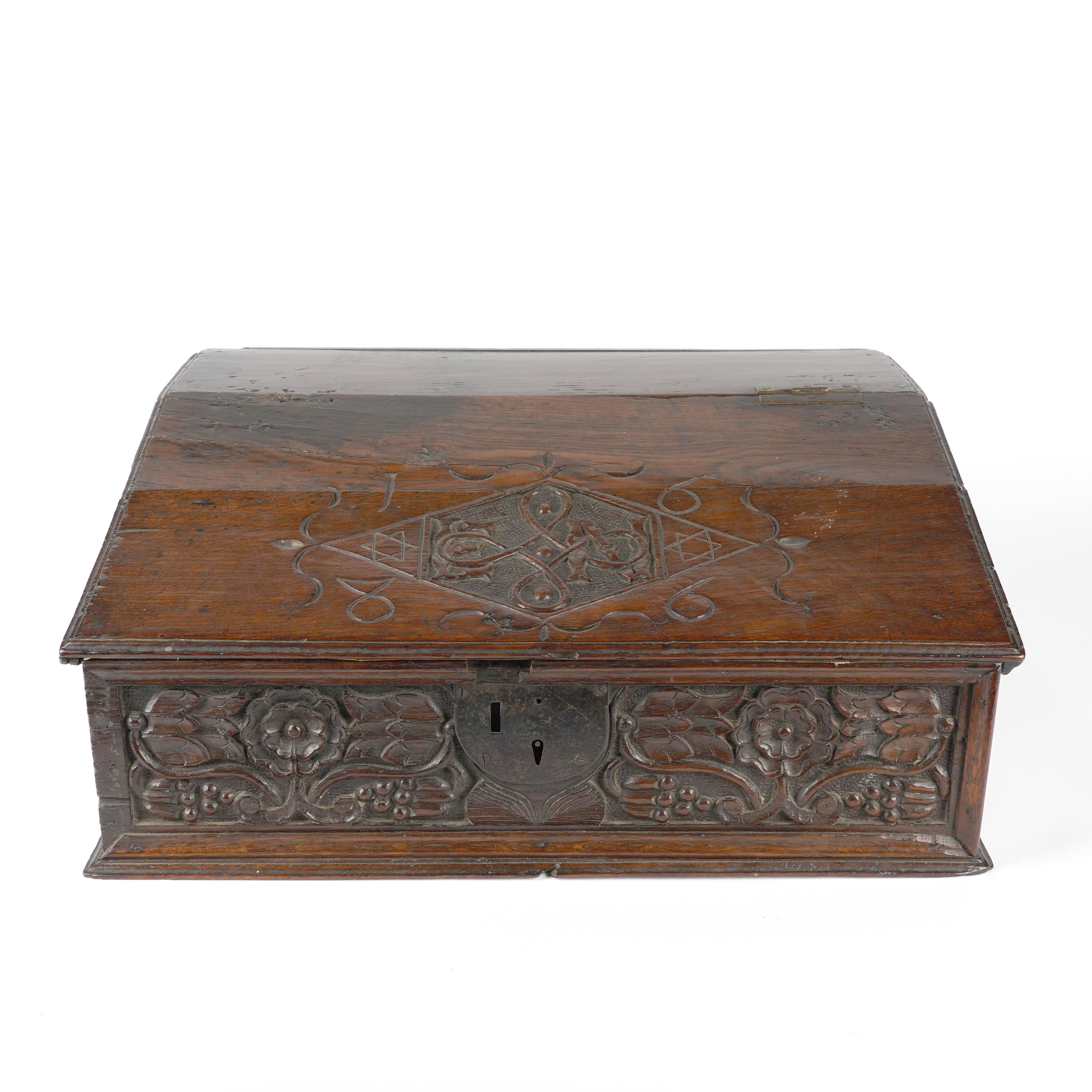 Late 17th Century Carved frieze with stylised fruit and flowers, monogram initials carved ‘EN’ and date 1686, 62cm wide