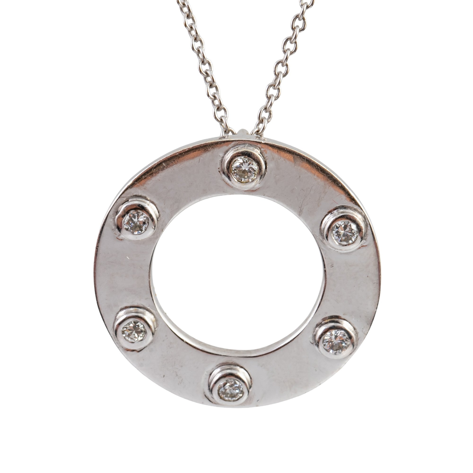 Mounted with six round brilliant cut diamonds, in unmarked white metal testing as 18ct and platinum, measuring 25mm in diameter, on a 9ct white gold chain, measuring 18cm in length, gross weight 8.7 grams