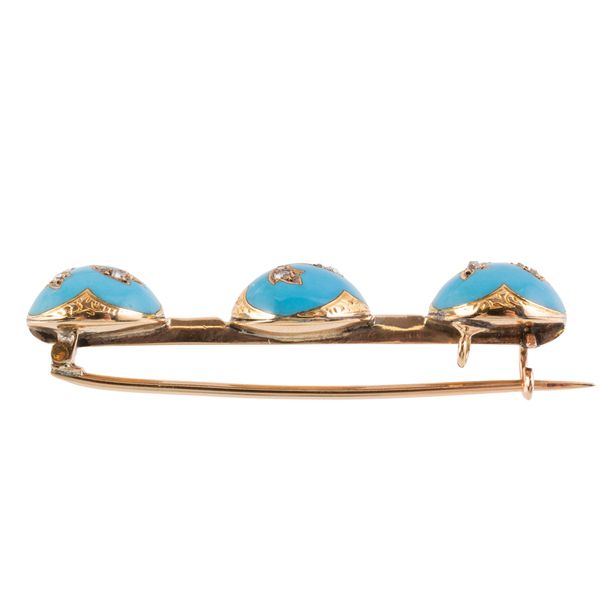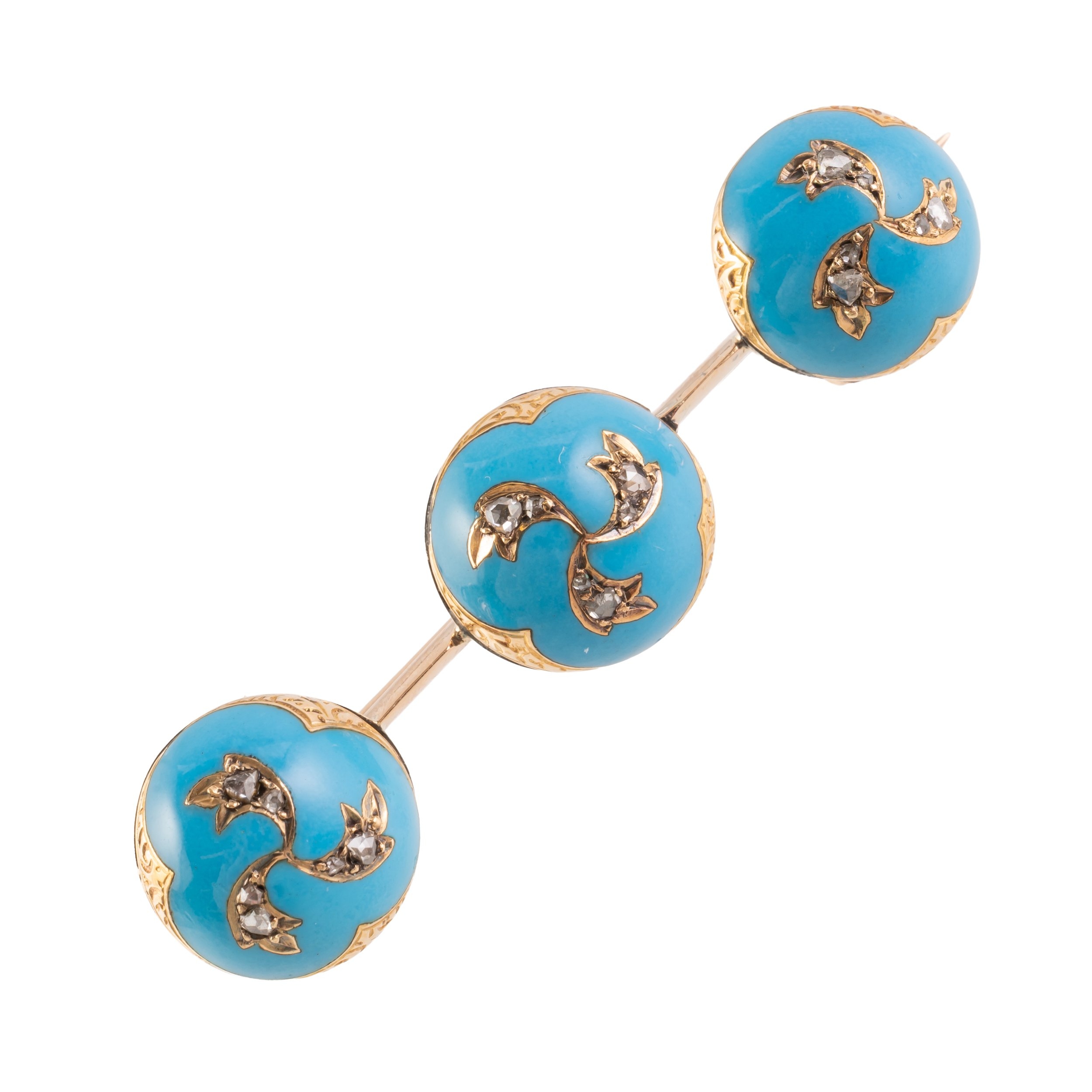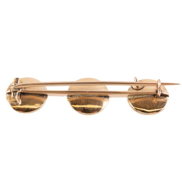 With three domes of blue enamel set with floral decorations with rose cut diamonds, mounted to an unmarked gold bar measuring 4.5cm in length, gross weight 7.7 grams