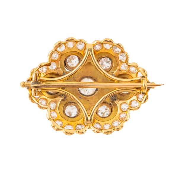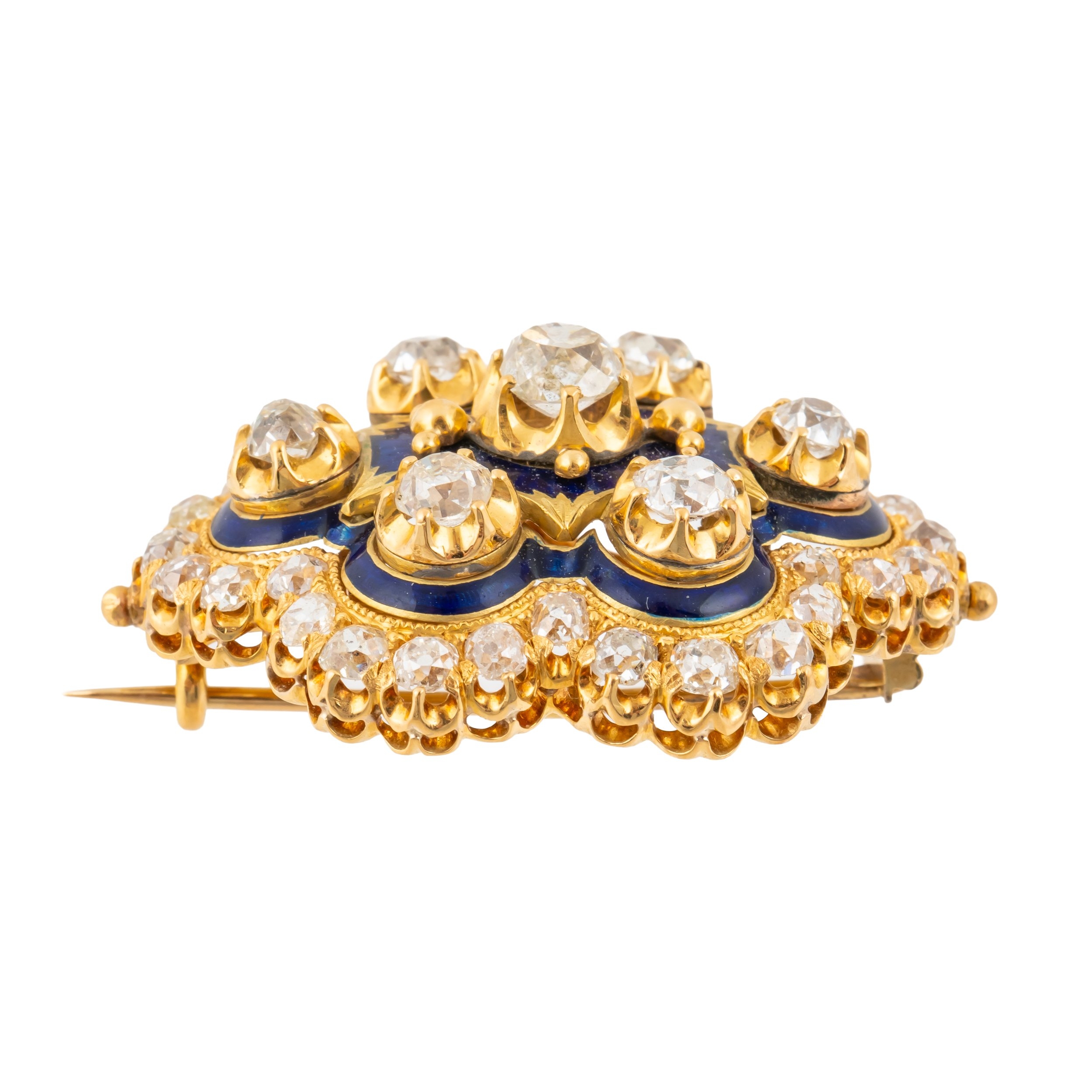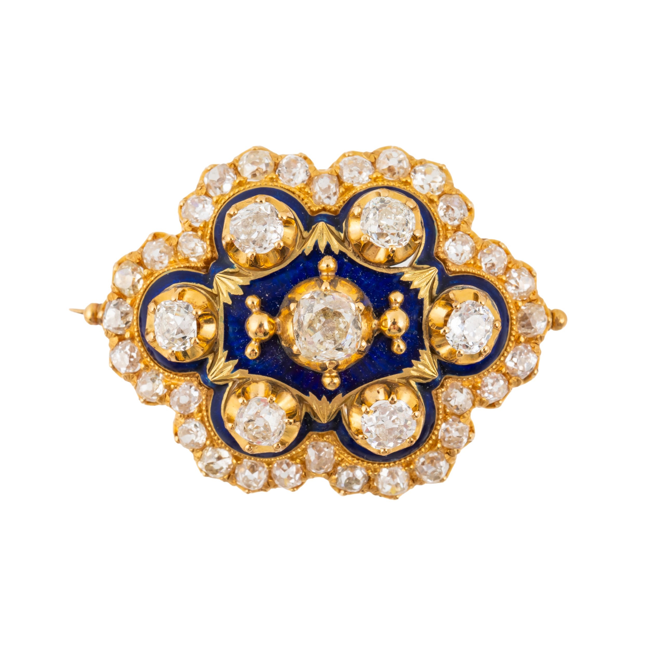 The central diamond weighing an estimated 0.86 carats, with a surround of six further diamonds each weighing an estimated 0.36 carats, on a blue enamel ground, with a border of further old cut diamonds, in unmarked gold, measuring 39.2mm x 28.5mm, gross weight 17.3 grams