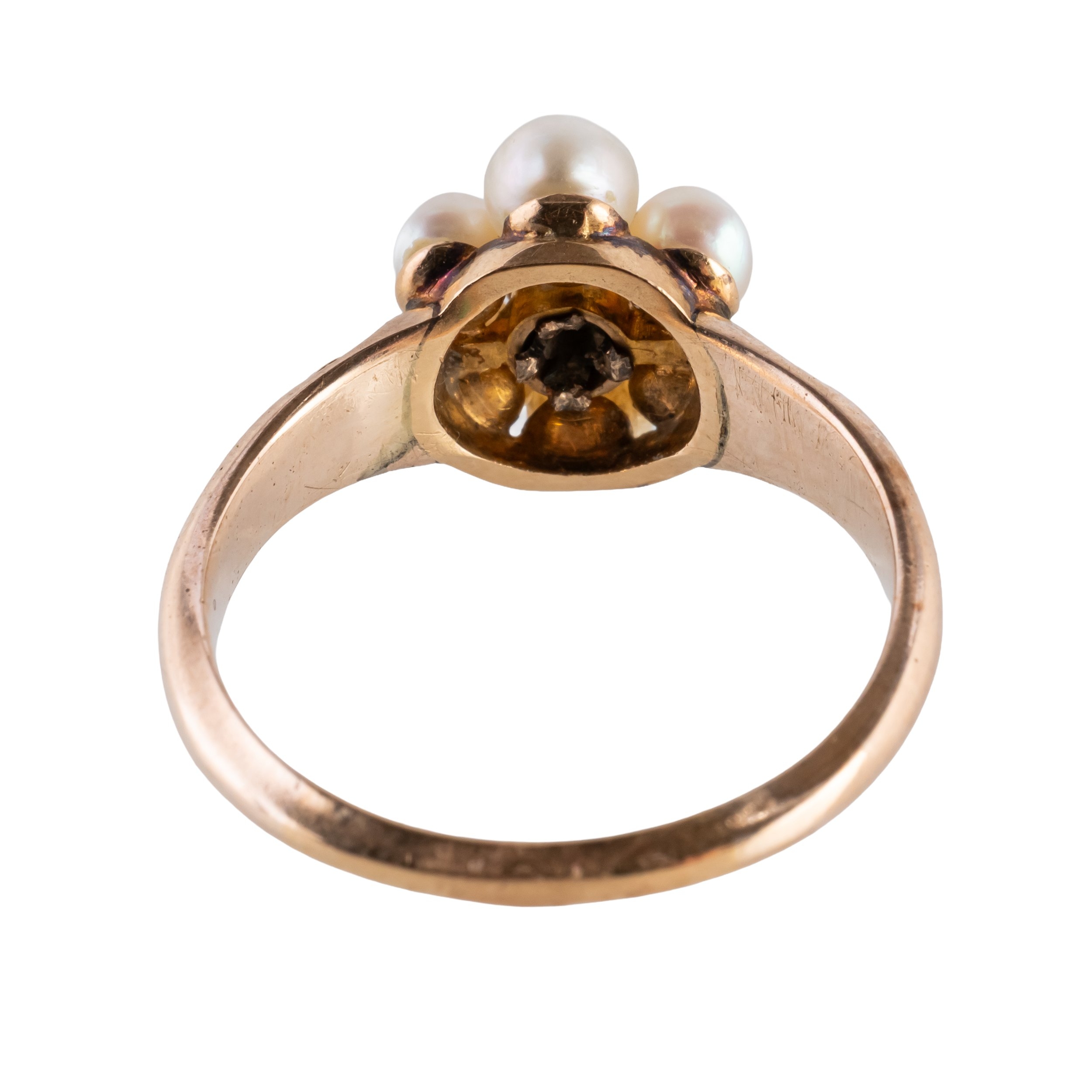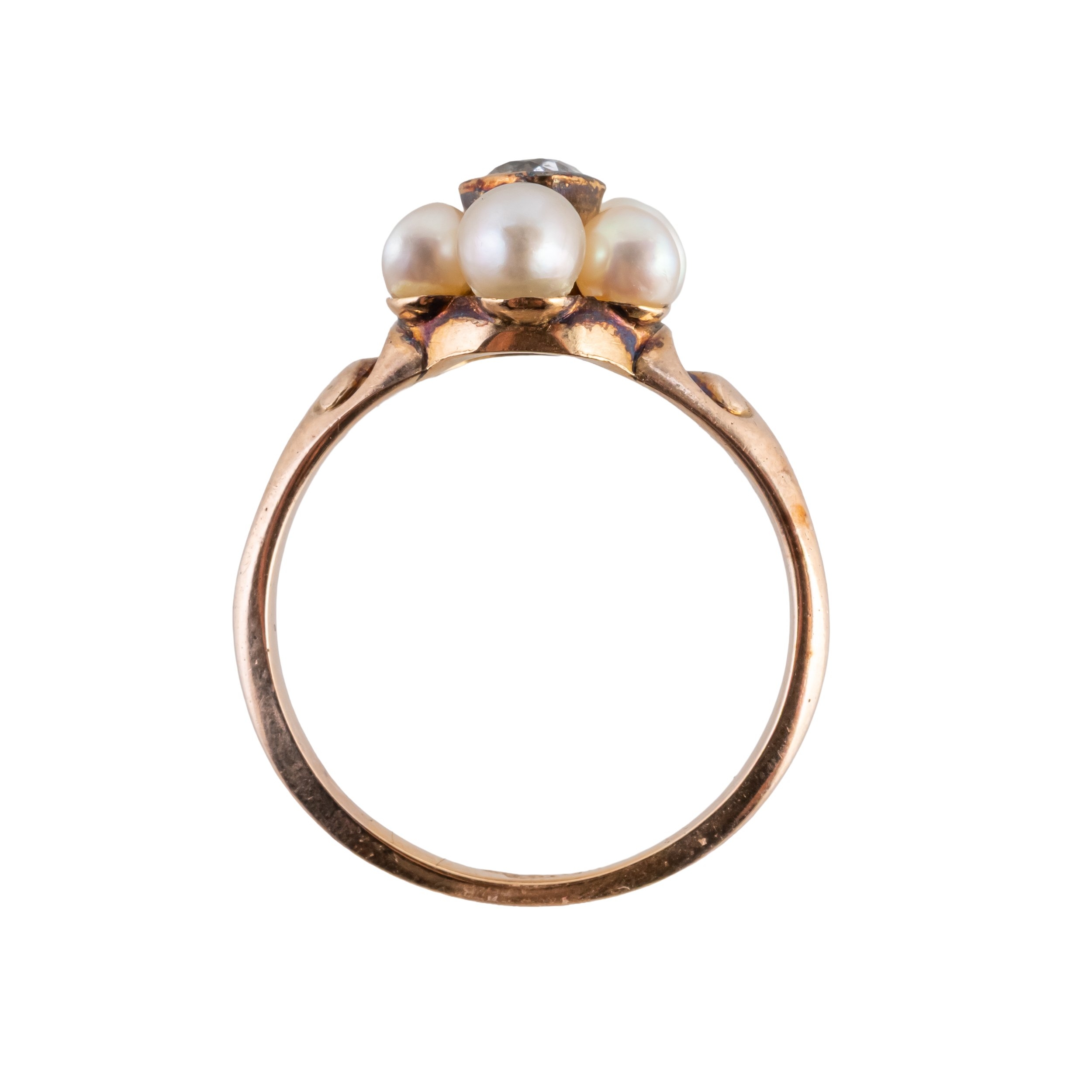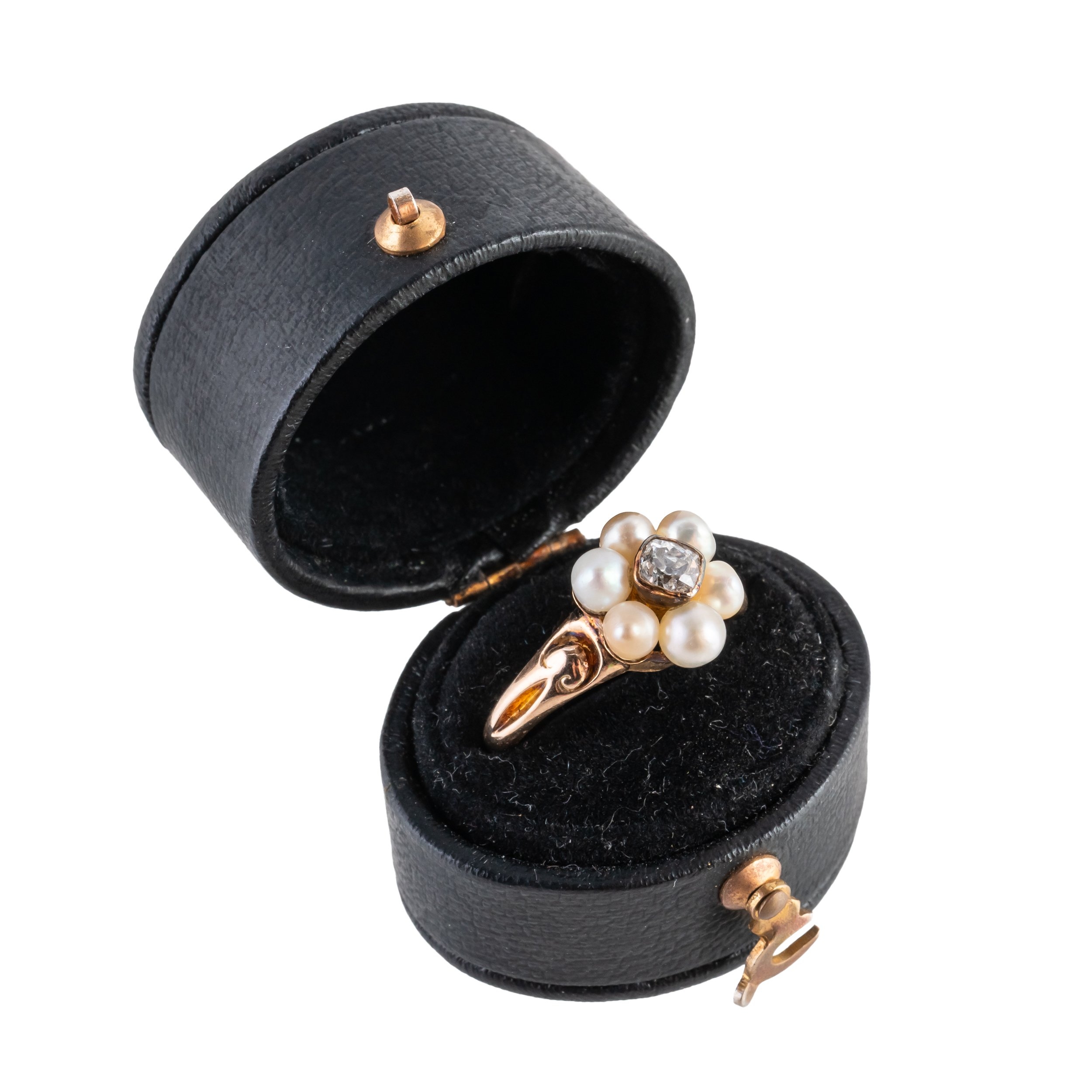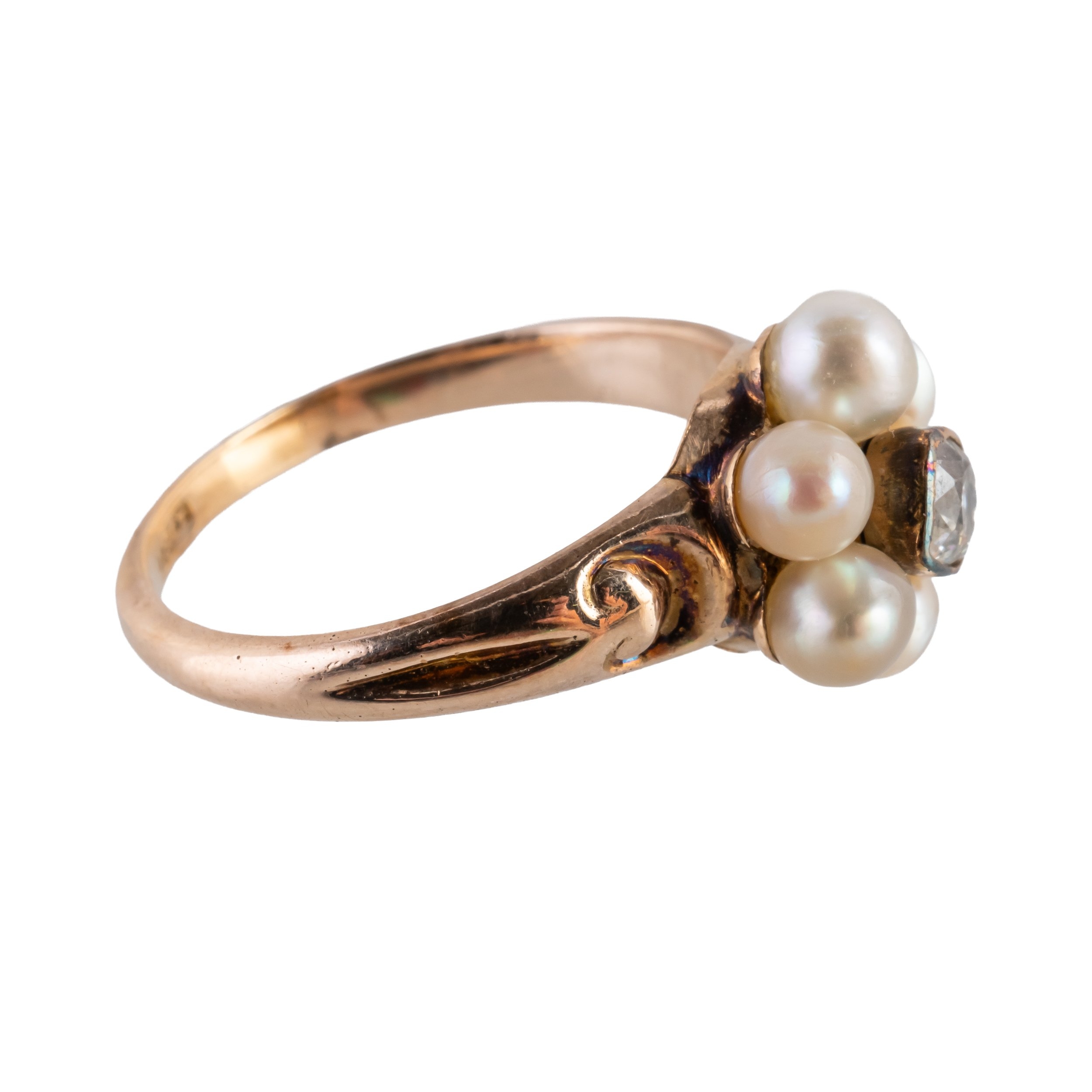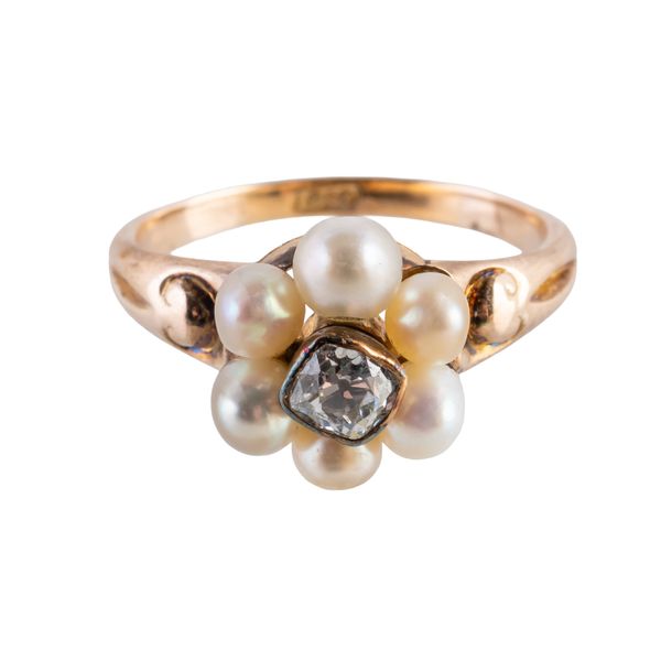 With a central bezel set old cut diamond with a surround of pearls, mounted in 18ct yellow gold, size M, gross weight 3.3 grams, with a box