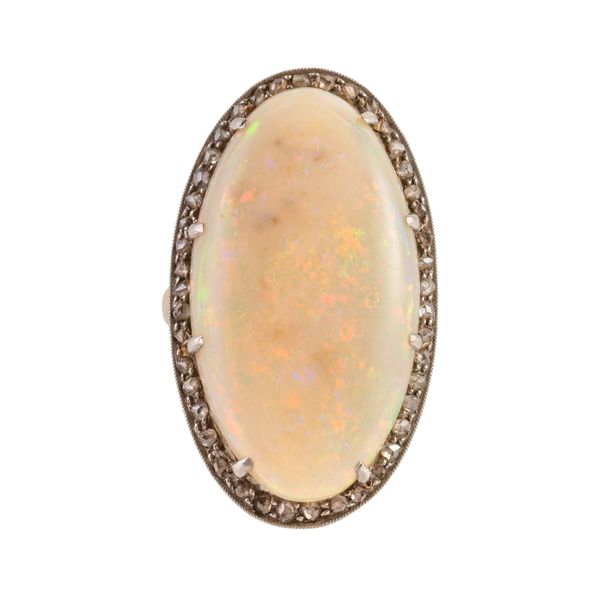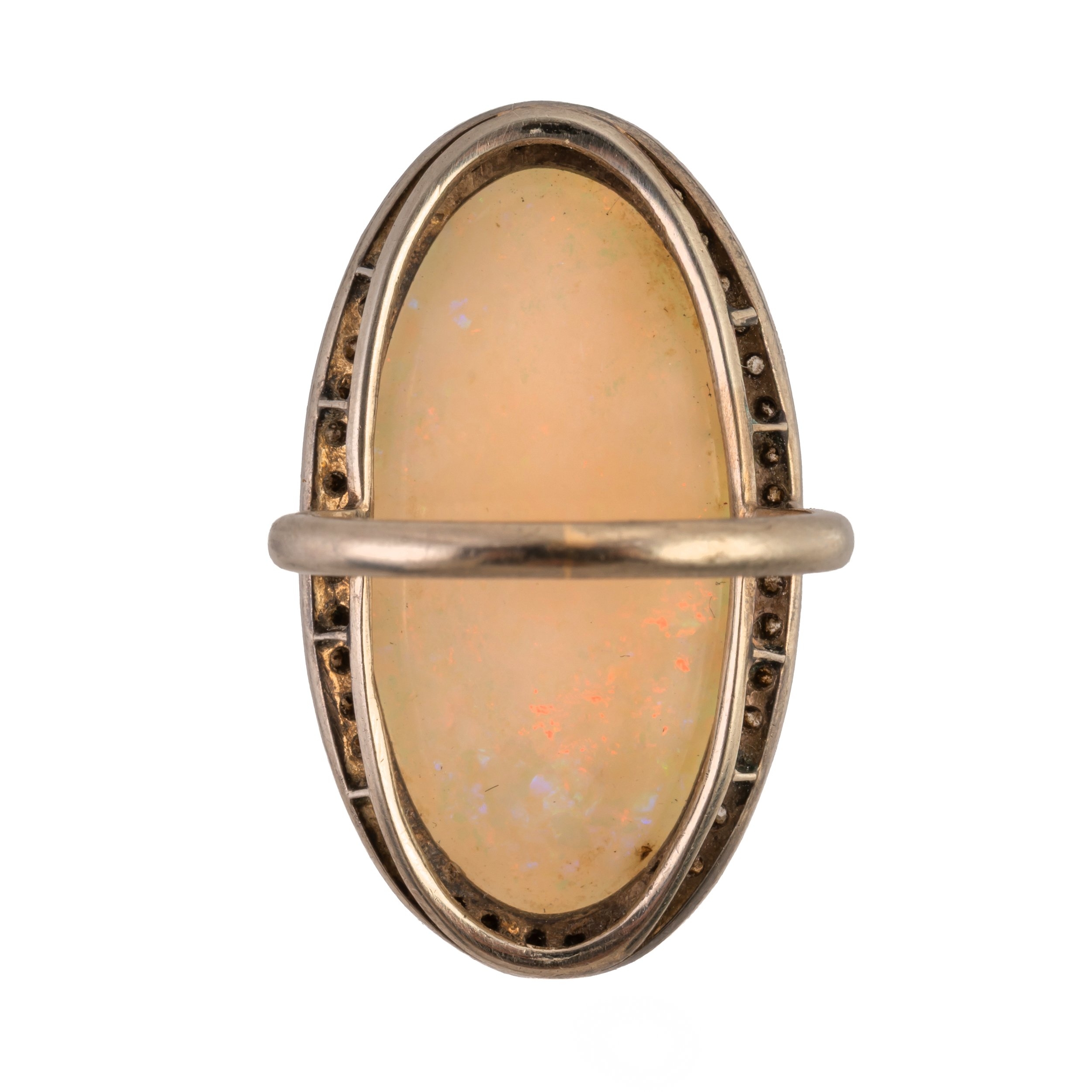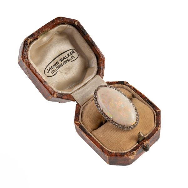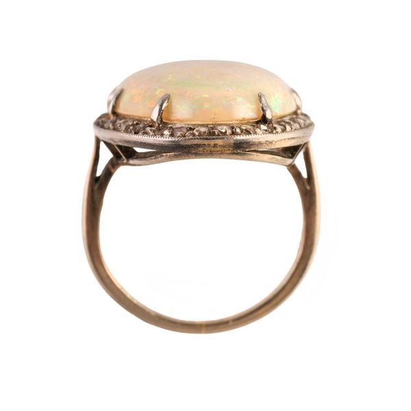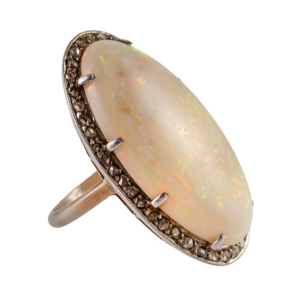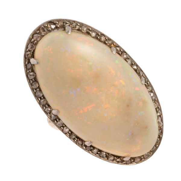 With a central oval cabochon opal, measuring 26.8mm x 14.5mm, surrounded by a row of rose cut diamonds, in unmarked white gold and platinum, size H-I as band is oval in shape, gross weight 5.7 grams, with a box