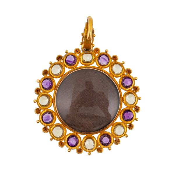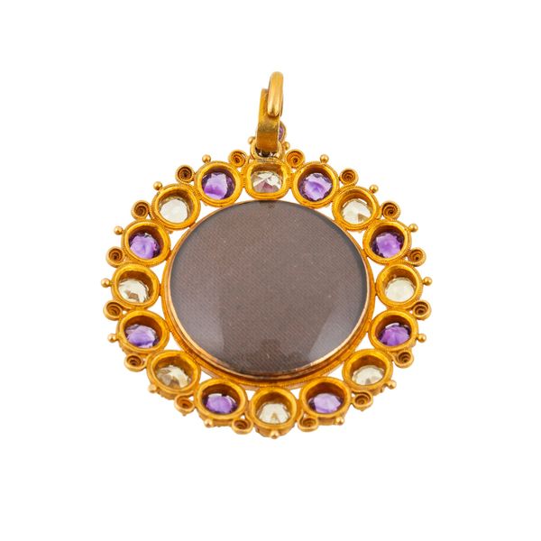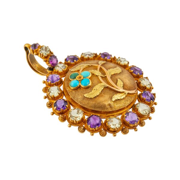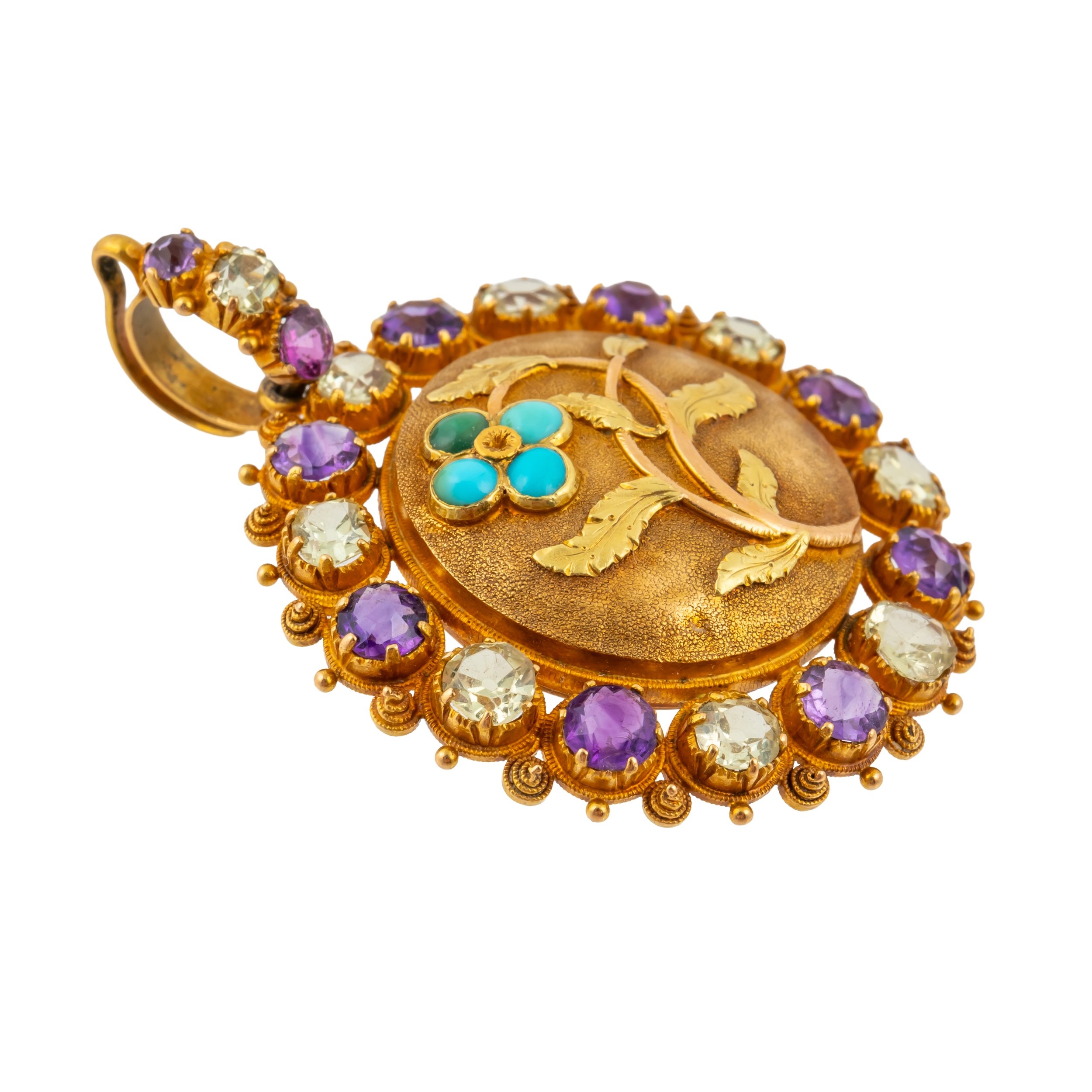 With a centra floral motif set with turquoise cabochons in two colour gold, with a filigree surround of alternating amethysts and chrysoberyls, with a gemset bale, the reverse with a glazed panel, in unmarked gold, measuring 33.5mm in diameter, gross weight 10.3 grams