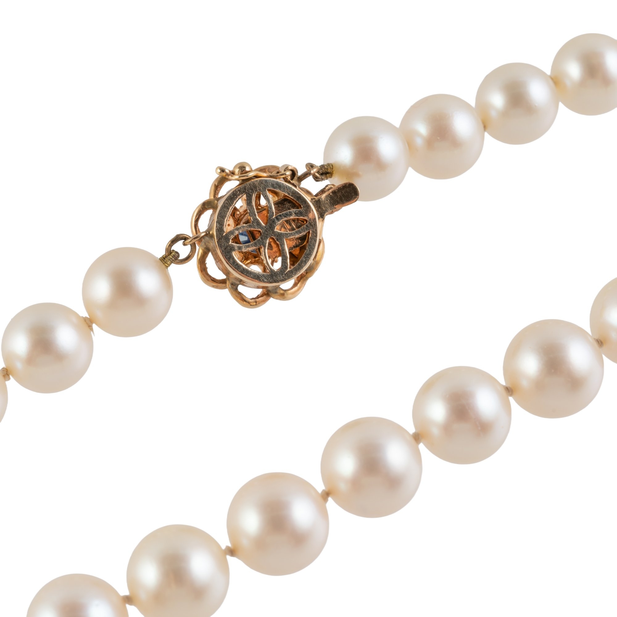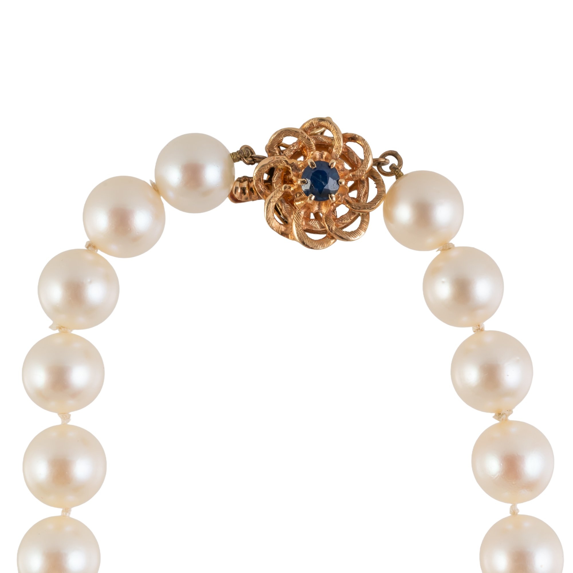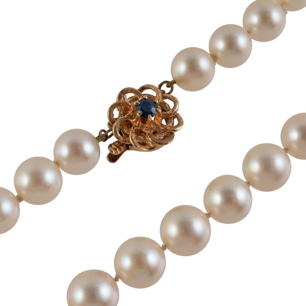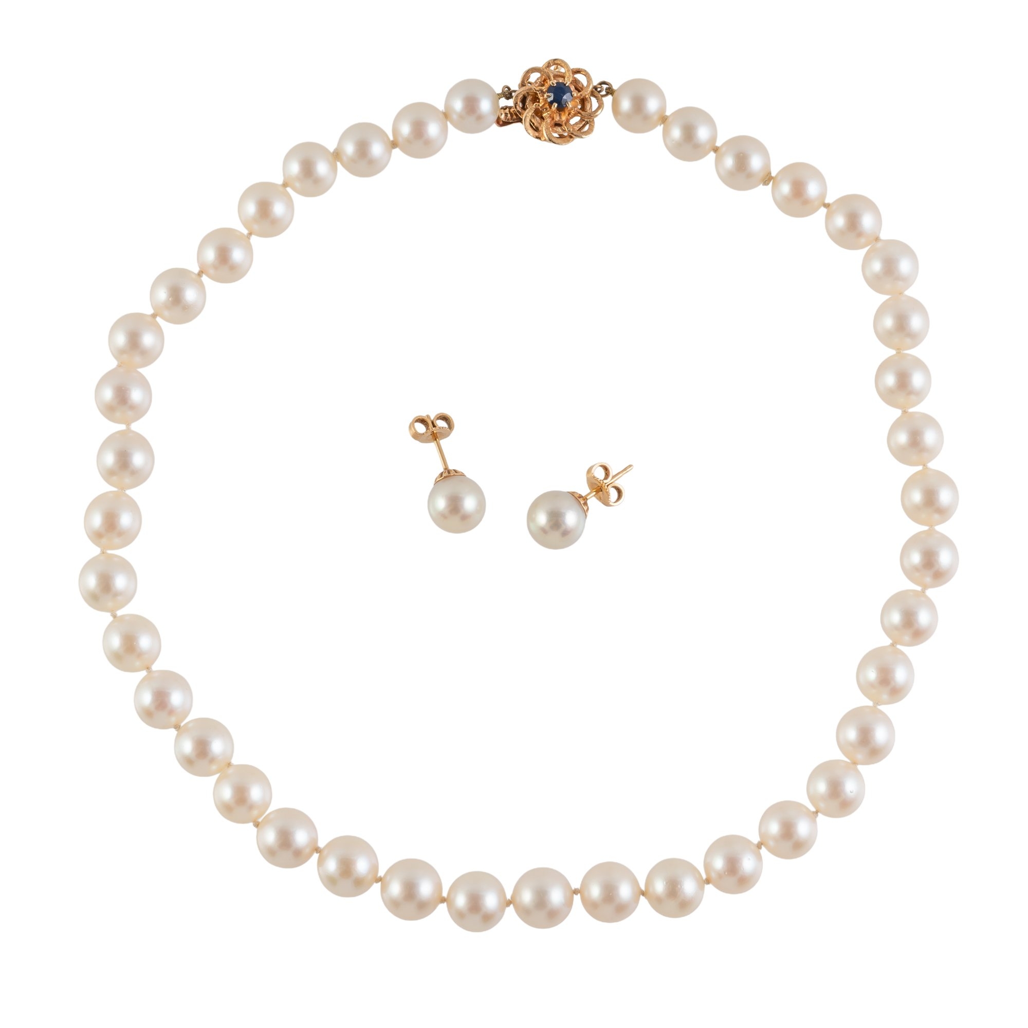 The 8.5mm pearls strung with knots to a 14ct gold clasp set with a sapphire, measuring approximately 40cm in length, together with a matching pair of ear studs with 14ct post and butterfly fittings for pierced ears, gross weight 42.5 grams