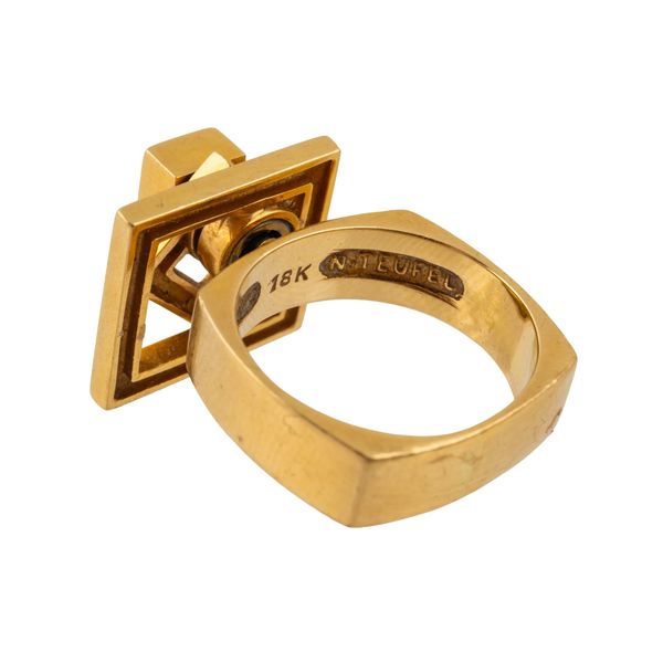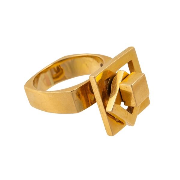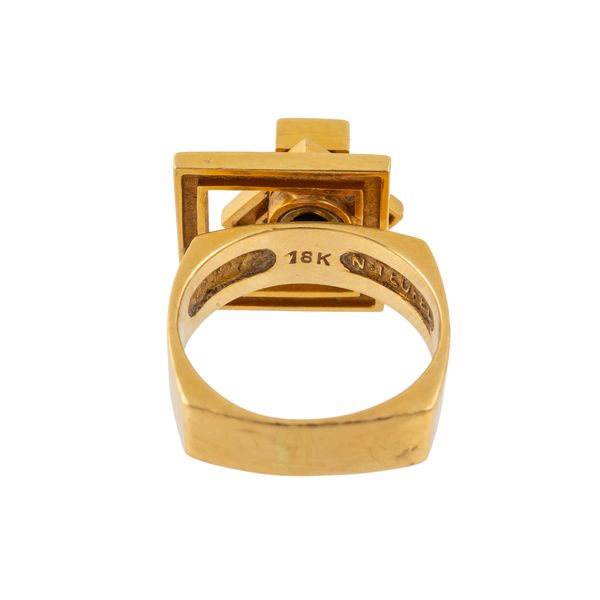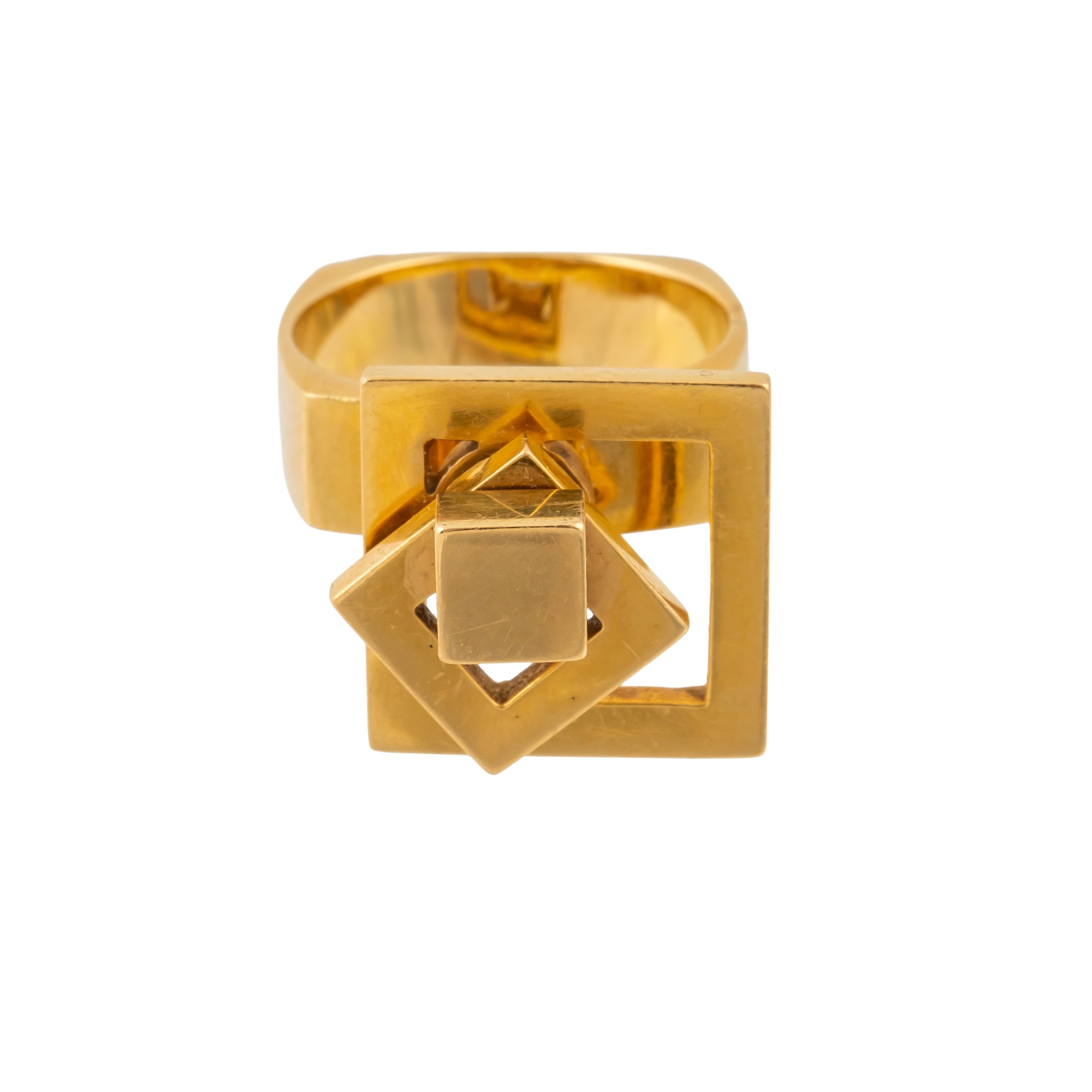 With two rotating square sections mounted to an 18ct gold ring, size K, by Norman Teufel and marked 1972, gross weight 10.8 grams