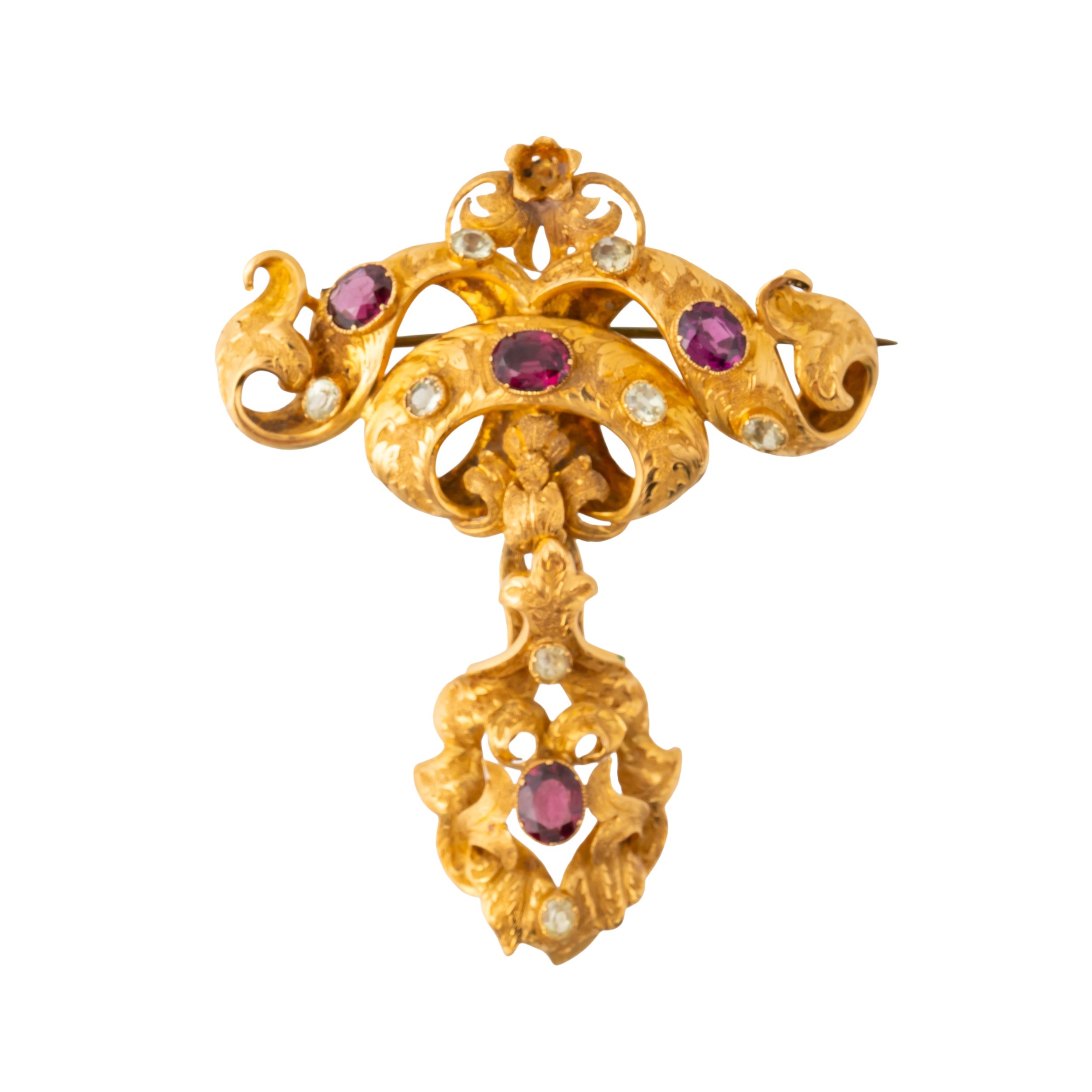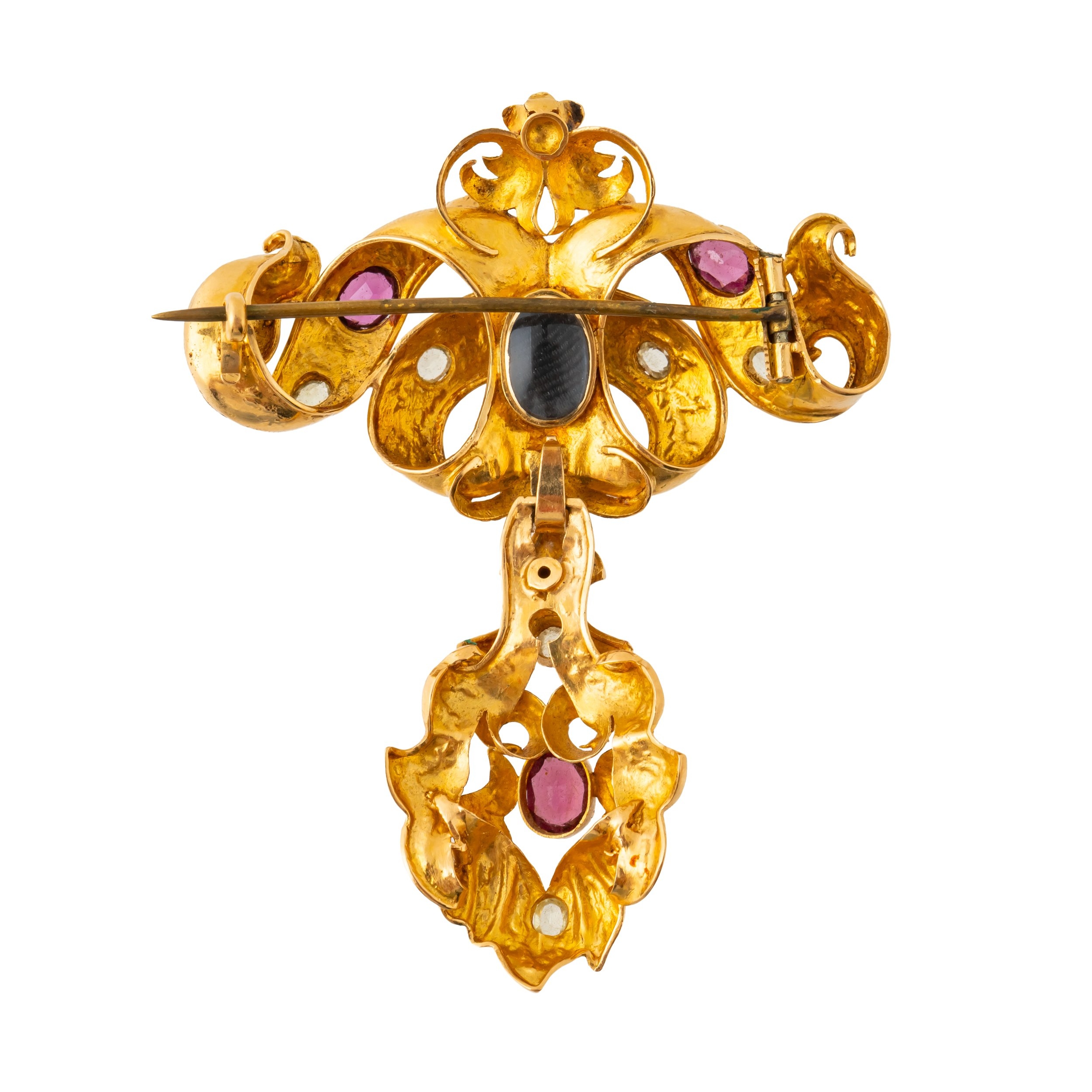 Mounted with oval cut chrysoberyls and garnets in an engraved swirling mount, the reverse with glazed panel, with a base metal pin and hook suspending a further detachable drop, measuring 58.2mm x 74.3mm, gross weight 17.3 grams