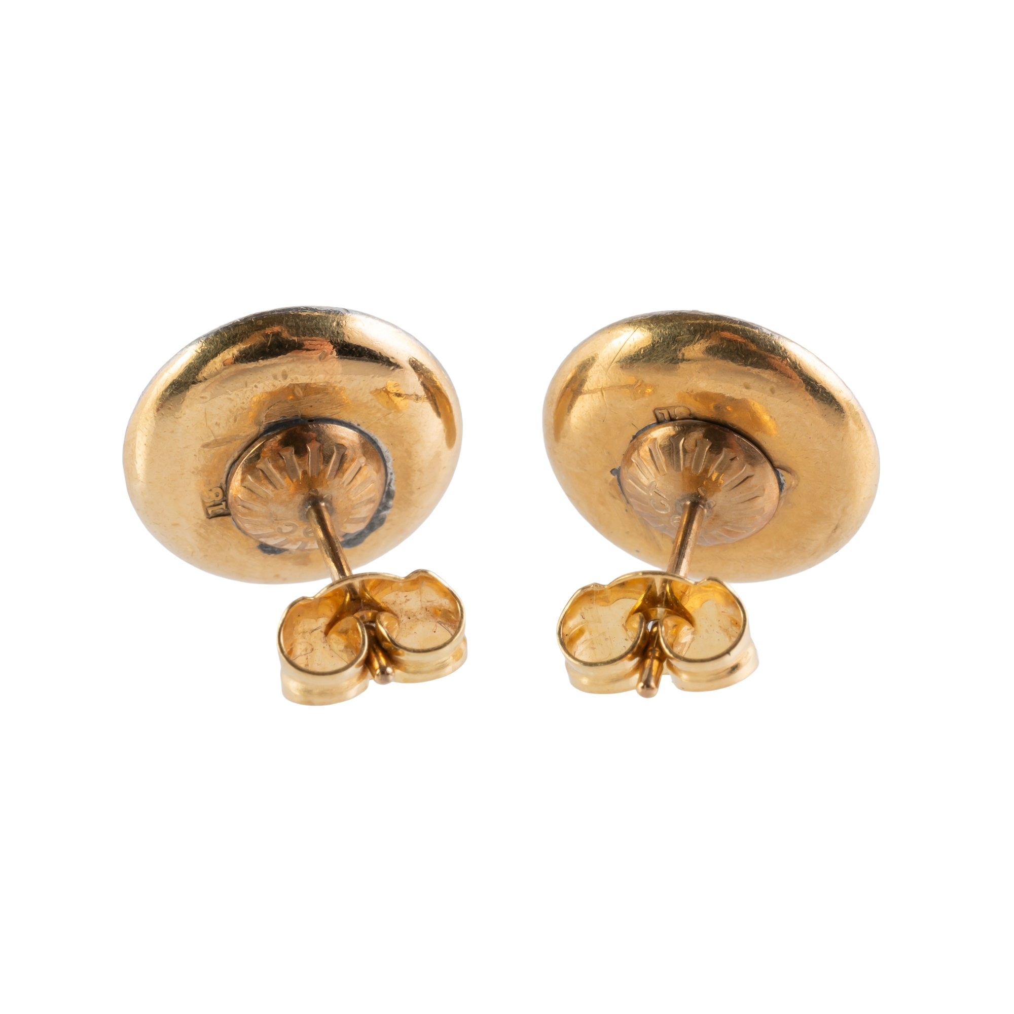 Of disc form, mounted with a central cabochon sapphire to a mother of pearl ground, with a platinum border, measuring 13mm in diameter, on 18ct gold, with post and butterfly fittings for pierced ears, gross weight 4.4 grams