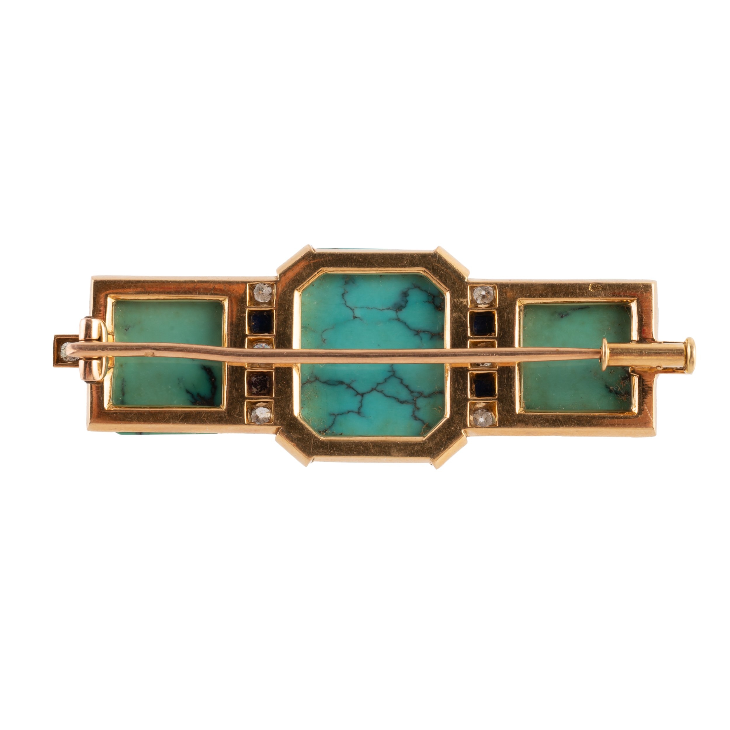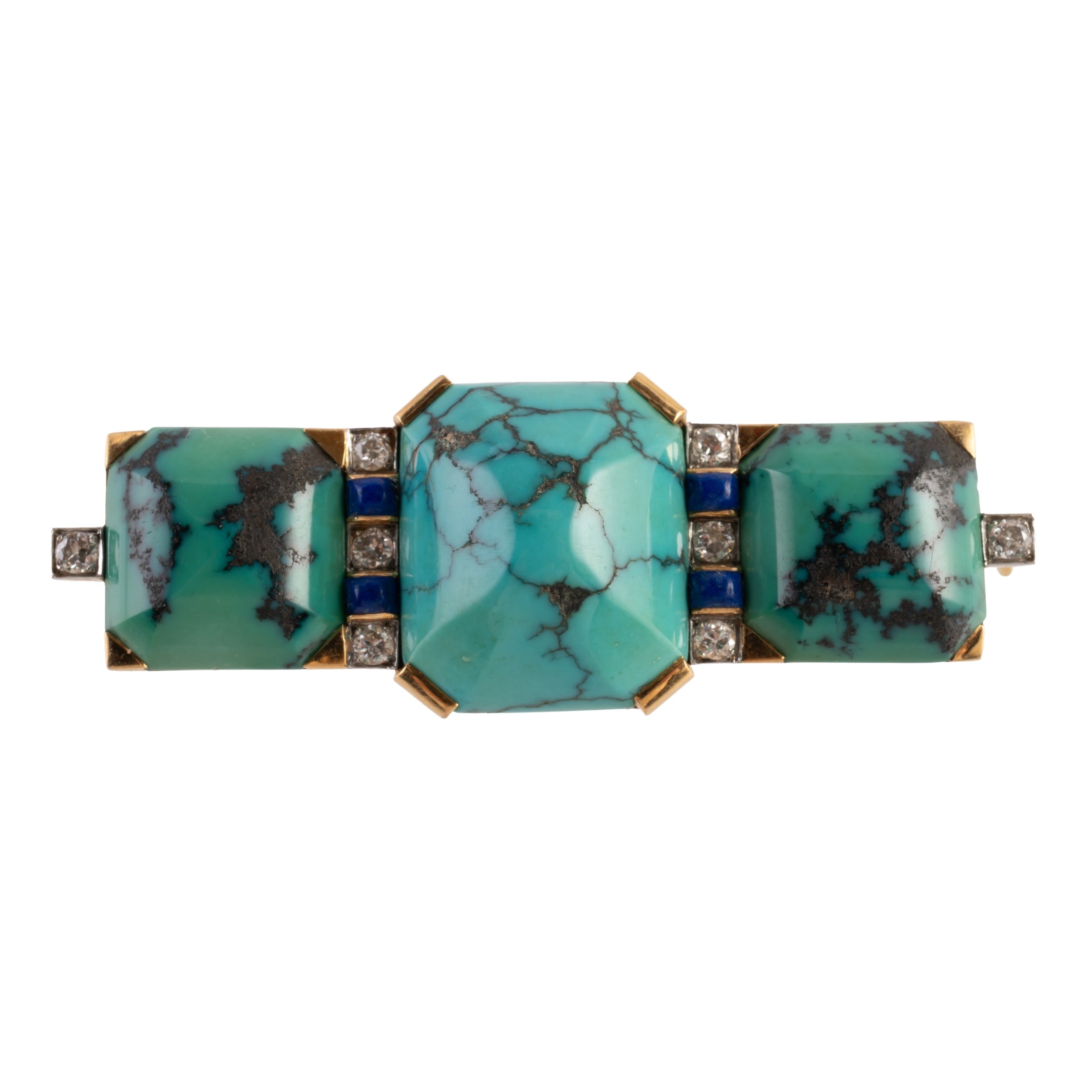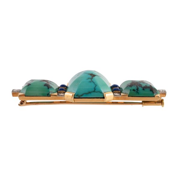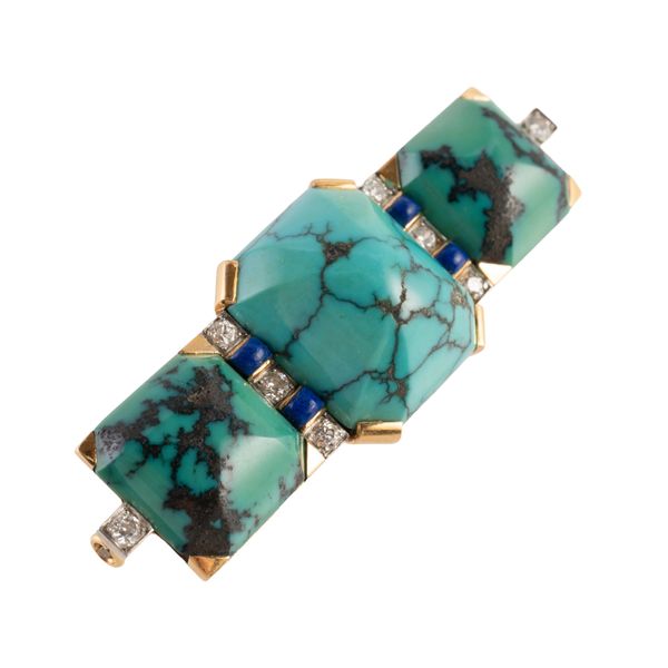 Mounted with three turquoise stones and set with diamonds and lapis lazuli, marked with the French eagles head mark for 18ct gold, measuring 5.5cm x 2cm, gross weight 18.4 grams