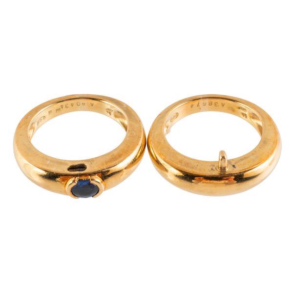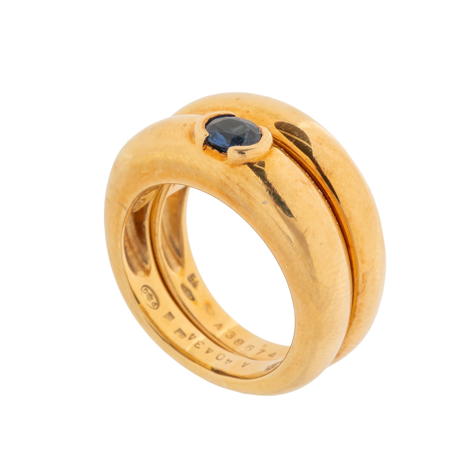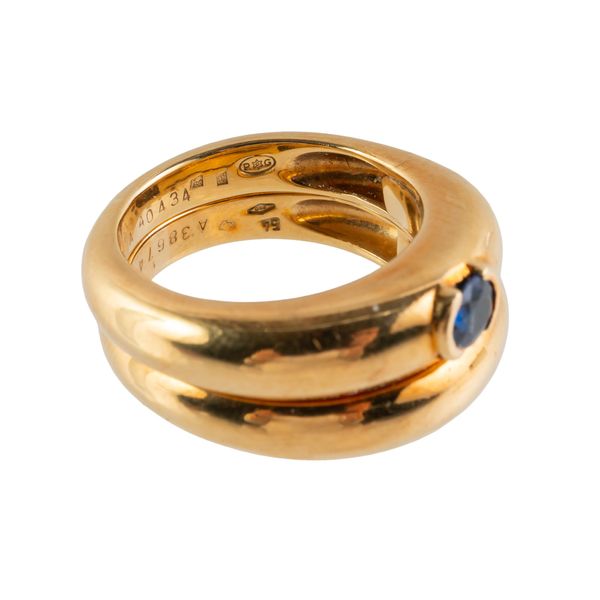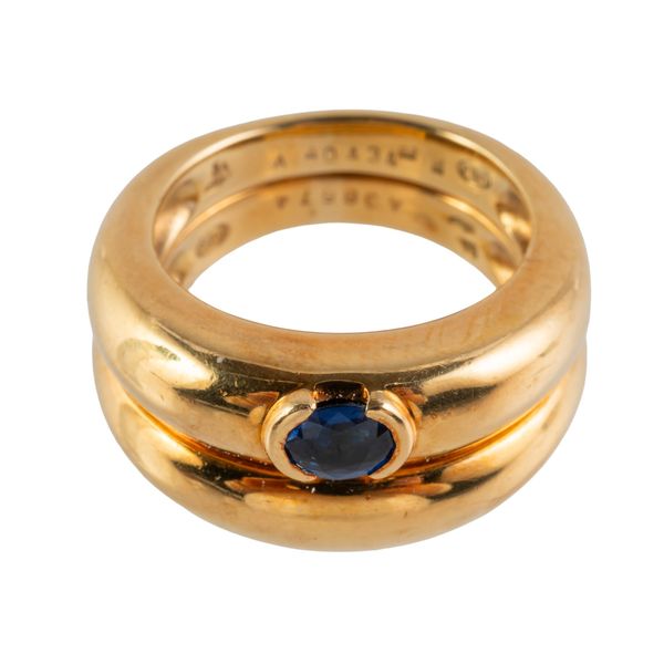 The ring in a two band design, one band mounted with a oval cut sapphire in a semi bezel setting, the other plain, in 18ct gold with Piaget makers marks, size O, gross weight 18.7 grams, with a box