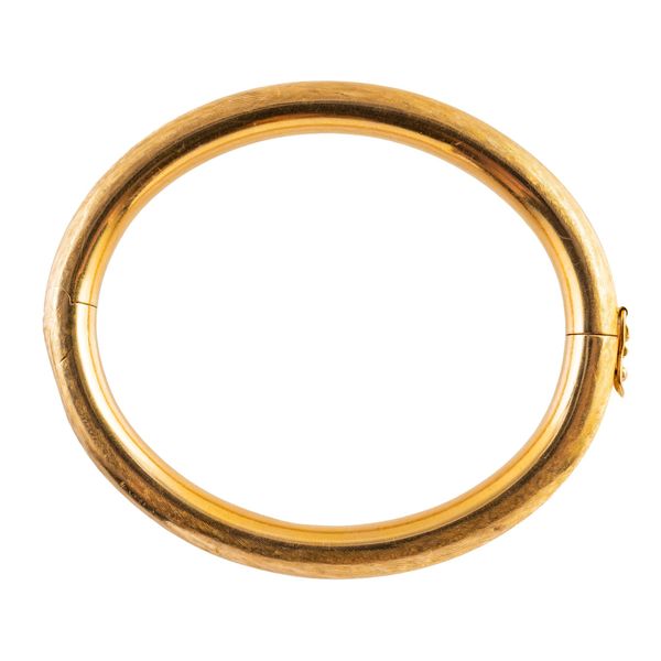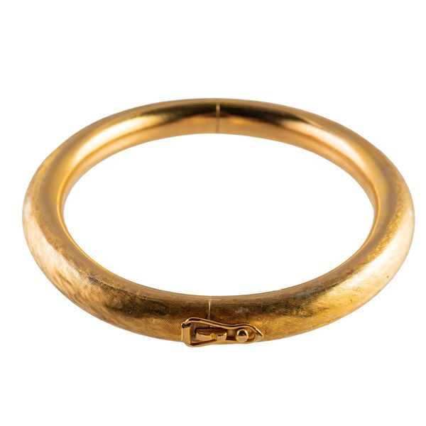 With textured surface, in 18ct gold with box clasp and safety clip, inside diameter 60mm x 50.5mm, gross weight 21.5 grams