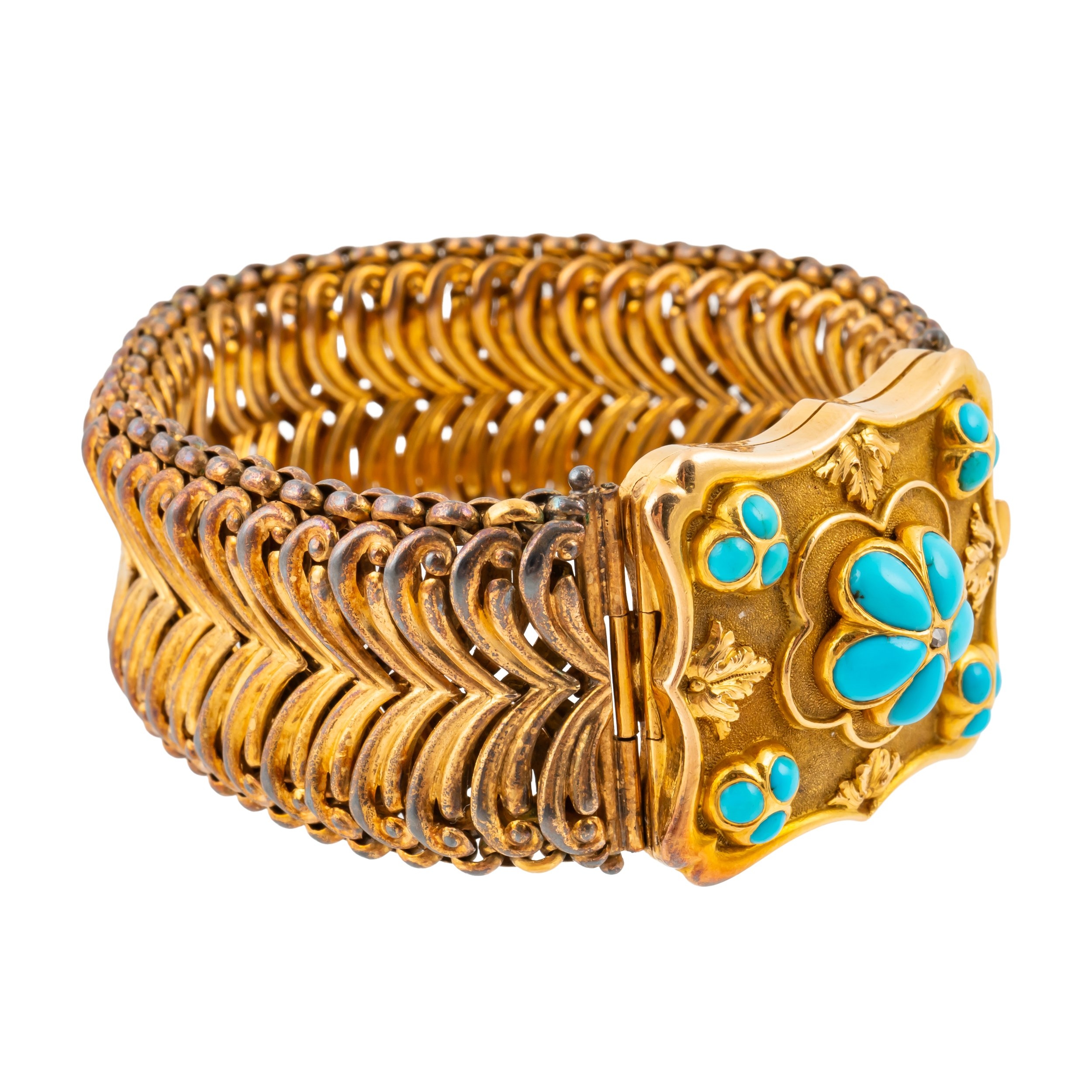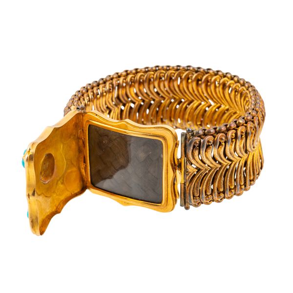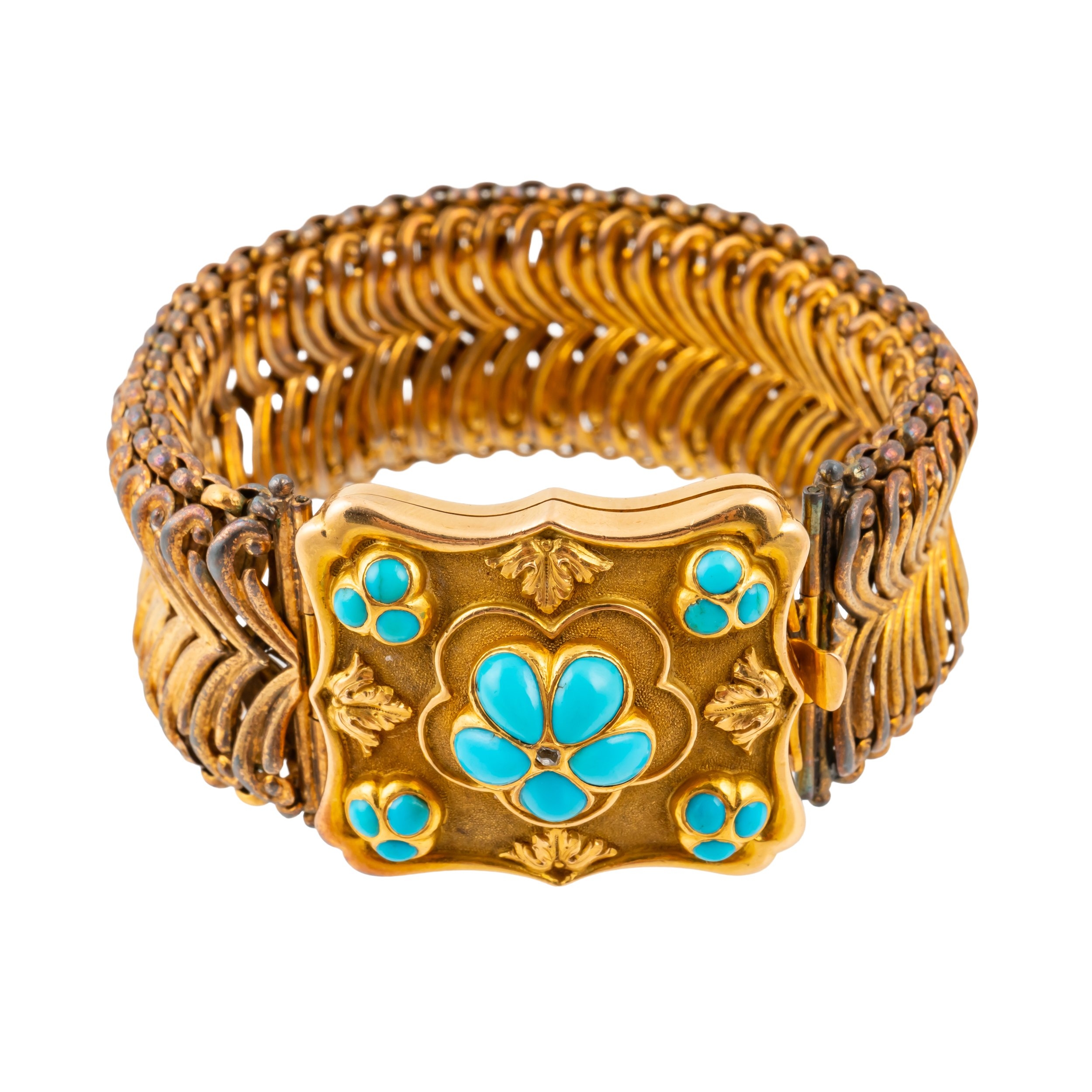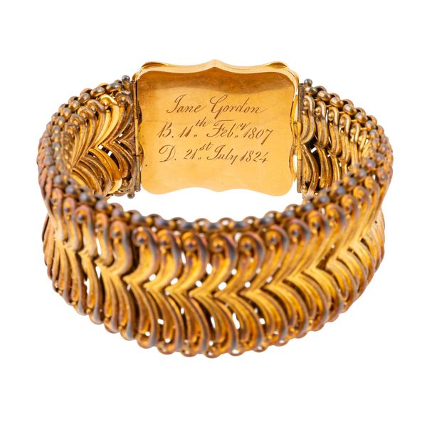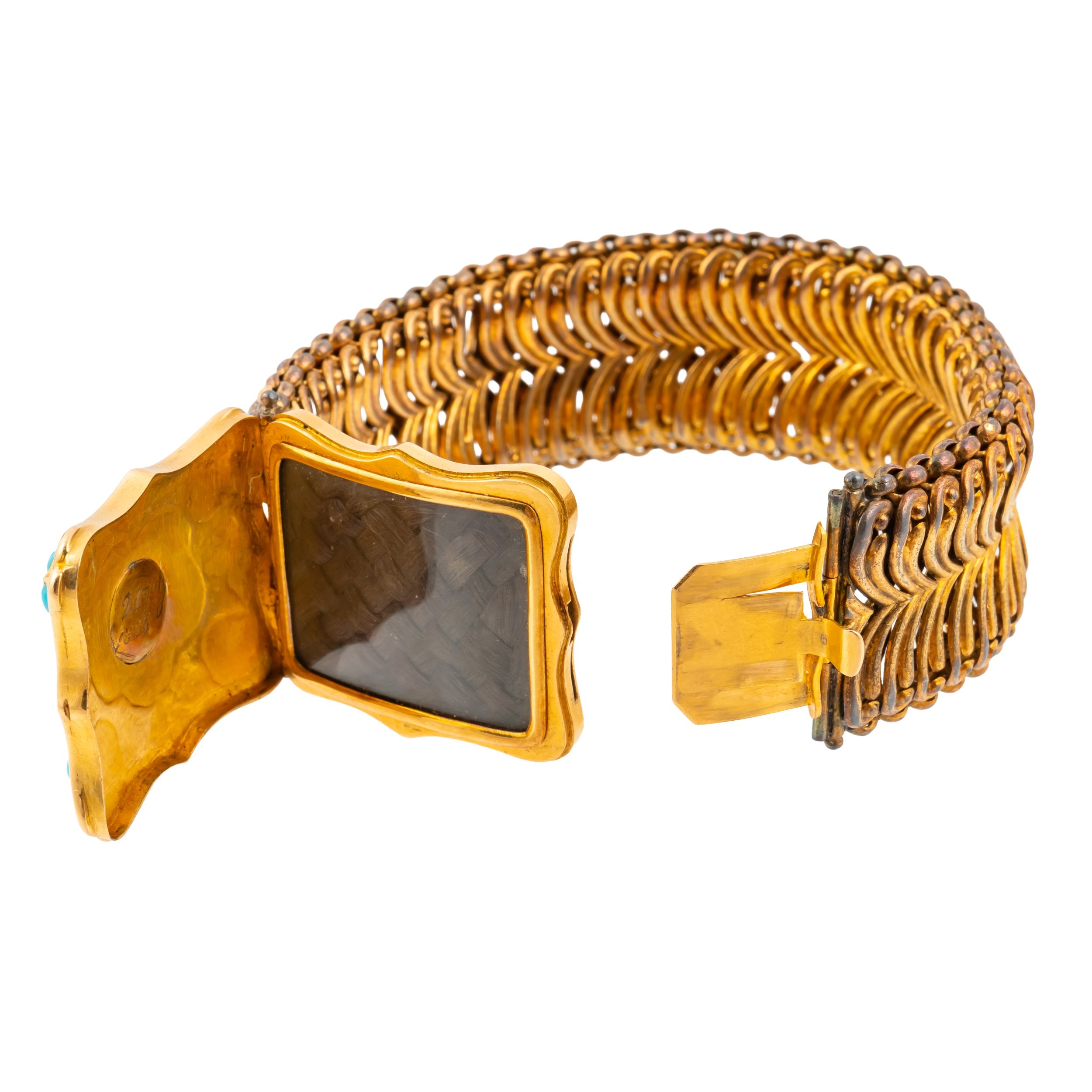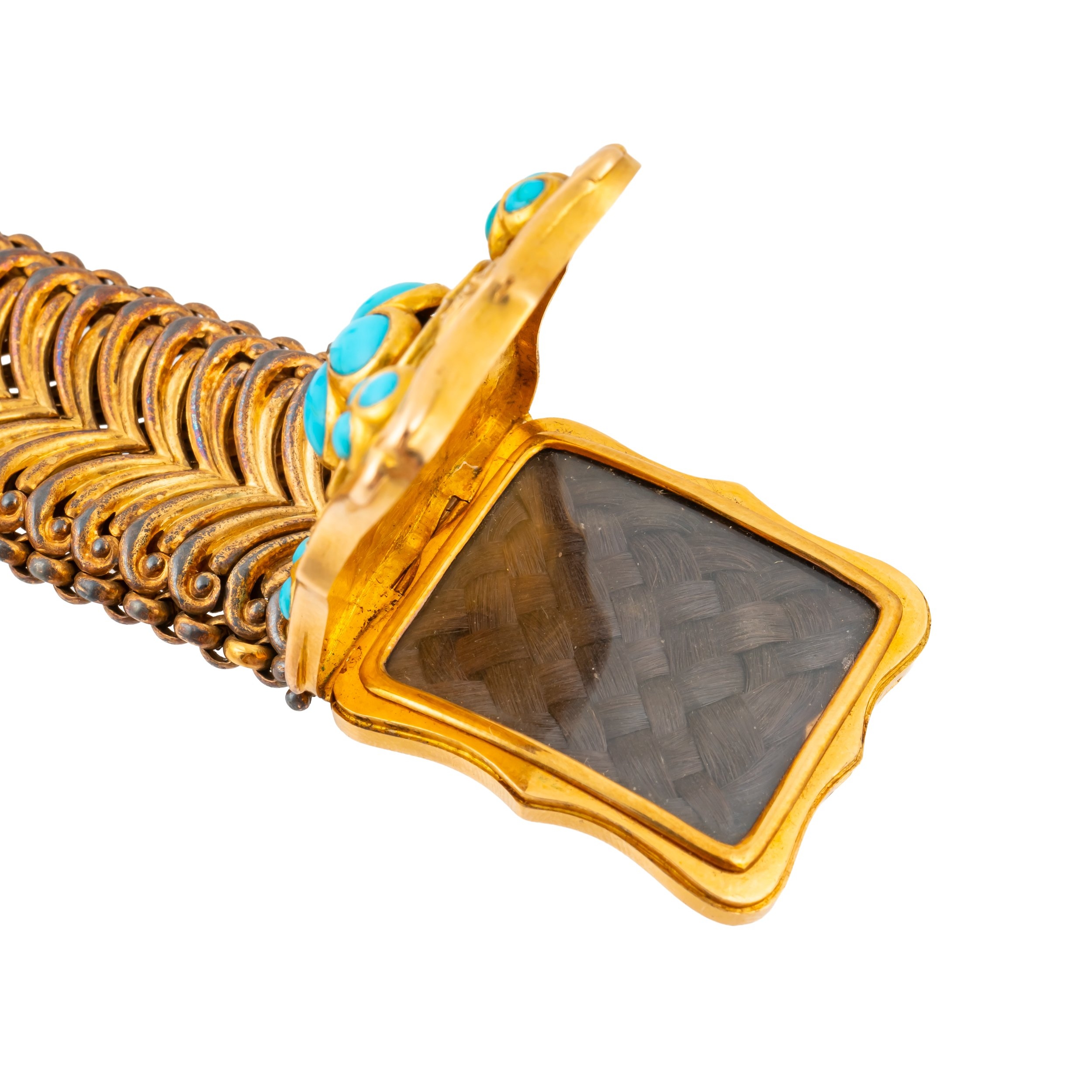 The top of the clasp set with turquoise cabochons and an old cut diamond, the reverse of the clasp signed 'Jane Gordon B 11th Feb 1807 D 21st July 1824", the clasp opening to reveal a hairwork panel, with date "21 July1824", on a fancy link bracelet, measuring 18cm in length, in unmarked gold, gross weight 65.8 grams