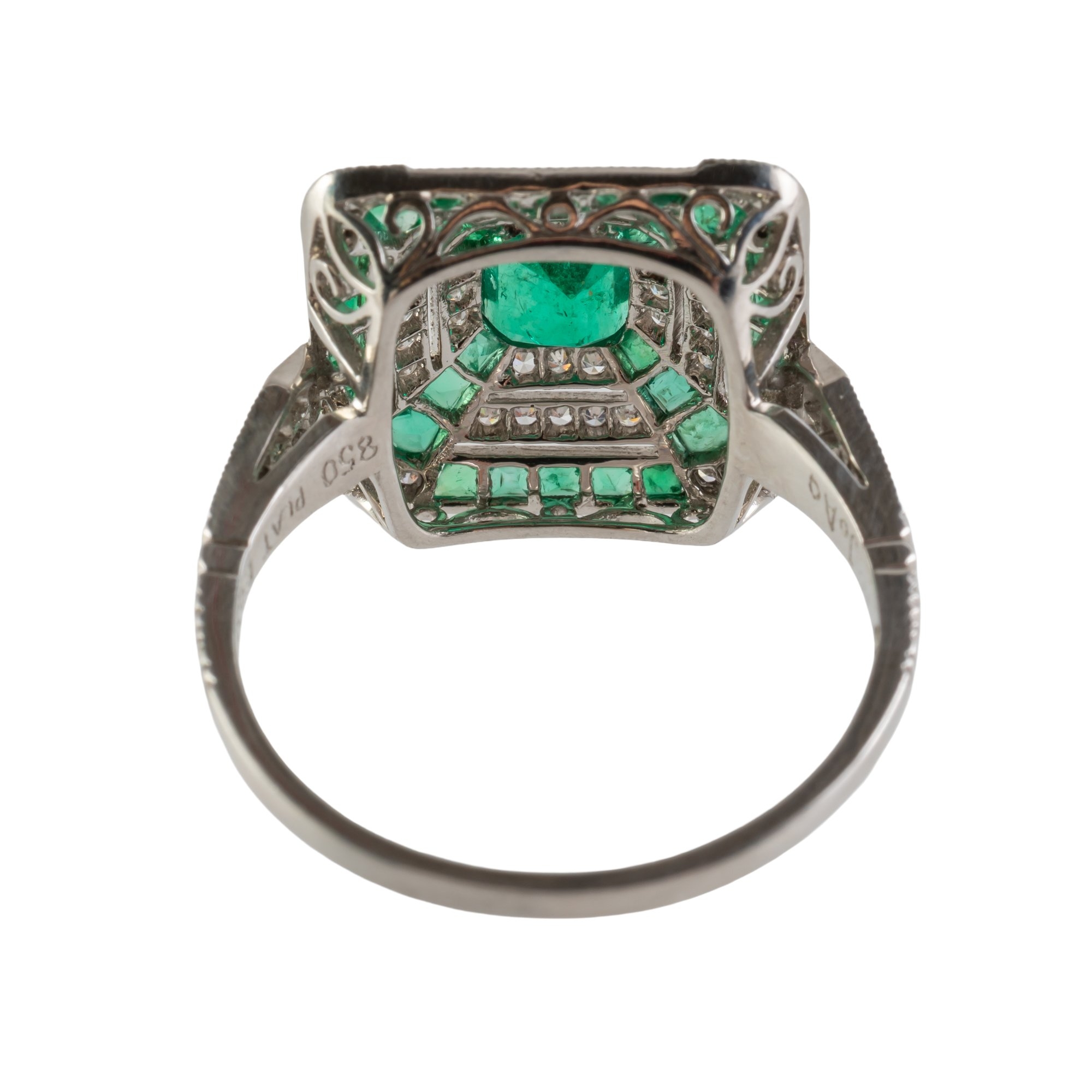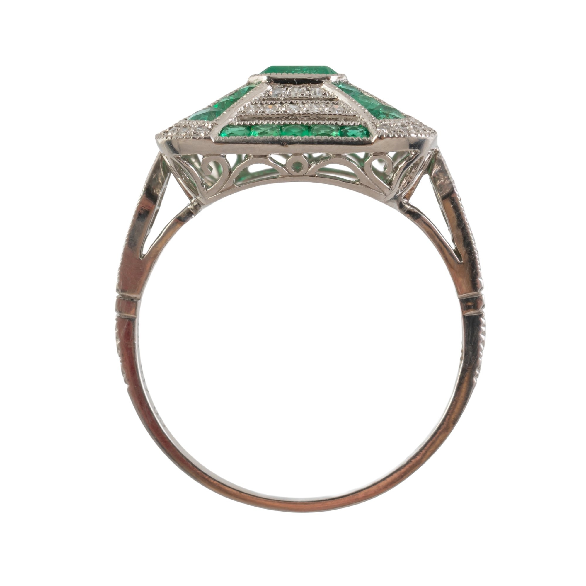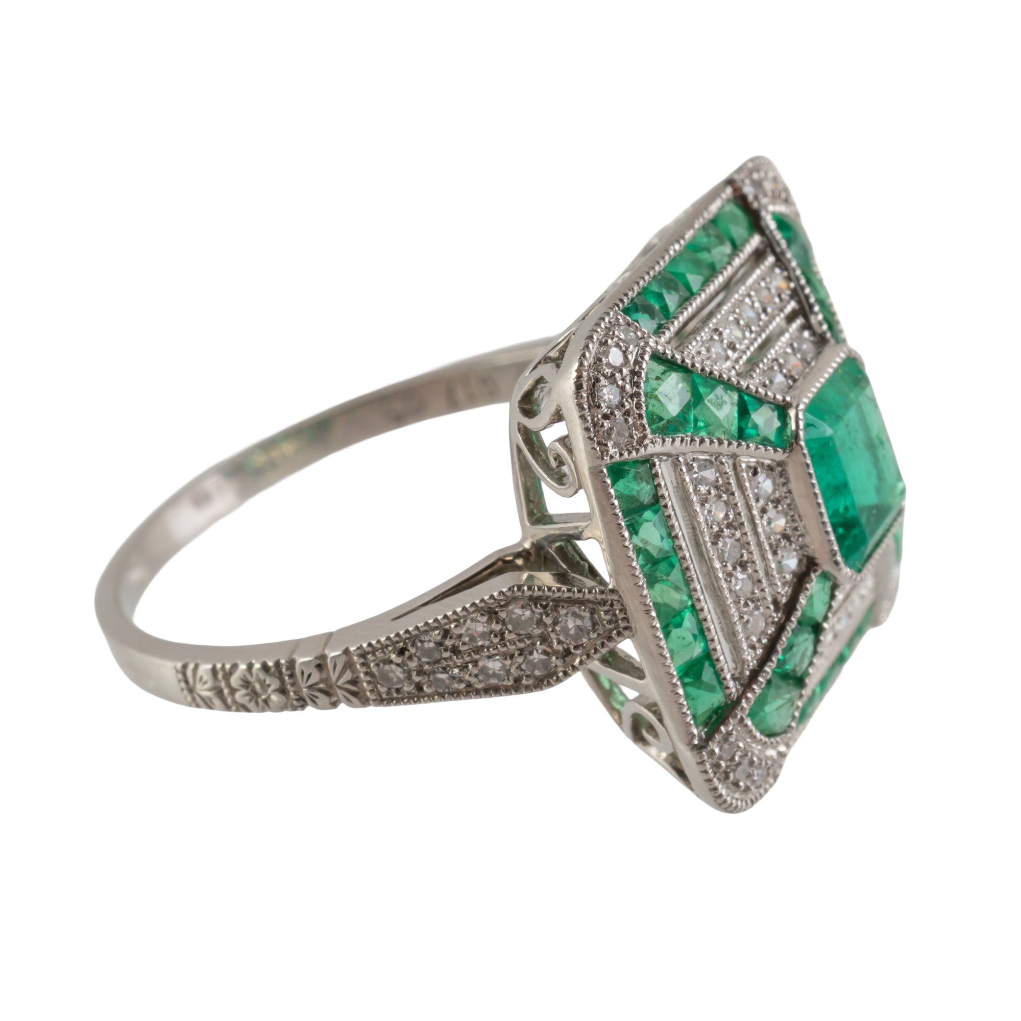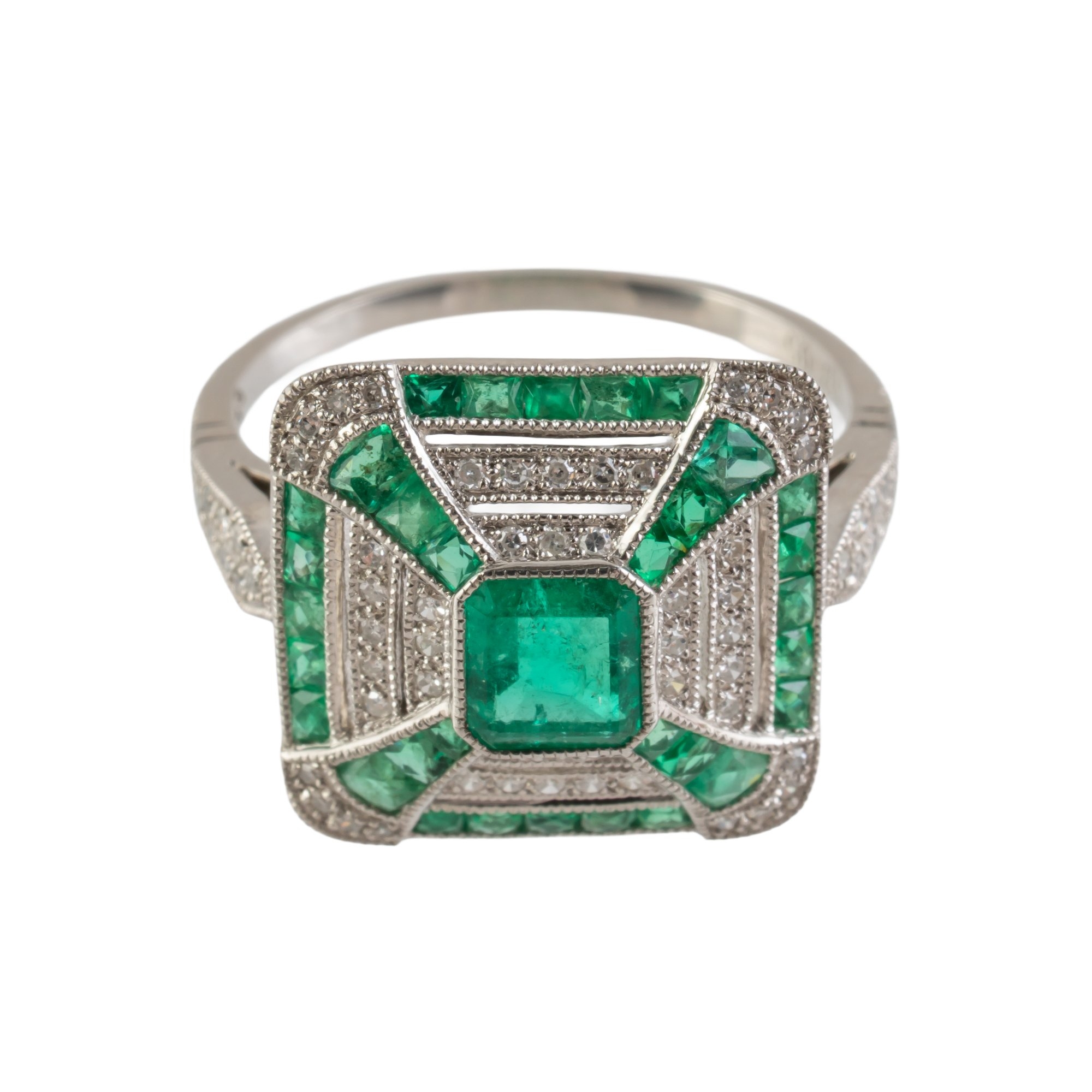 With a central emerald cut emerald weighing an estimated 0.55 carats, in a surround of diamonds and calibre cut emeralds, mounted in platinum, size N, gross weight 4.5 grams