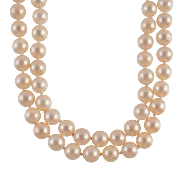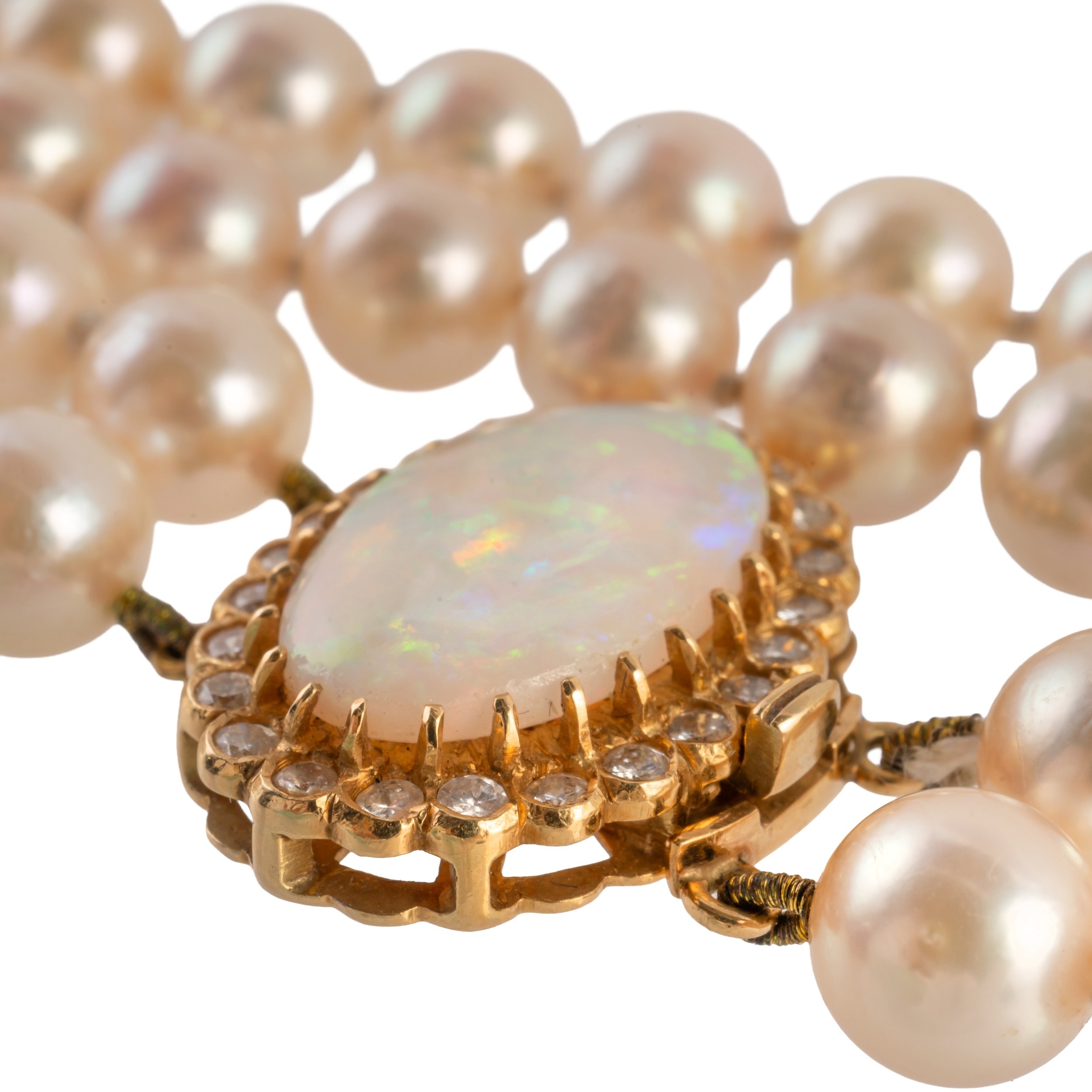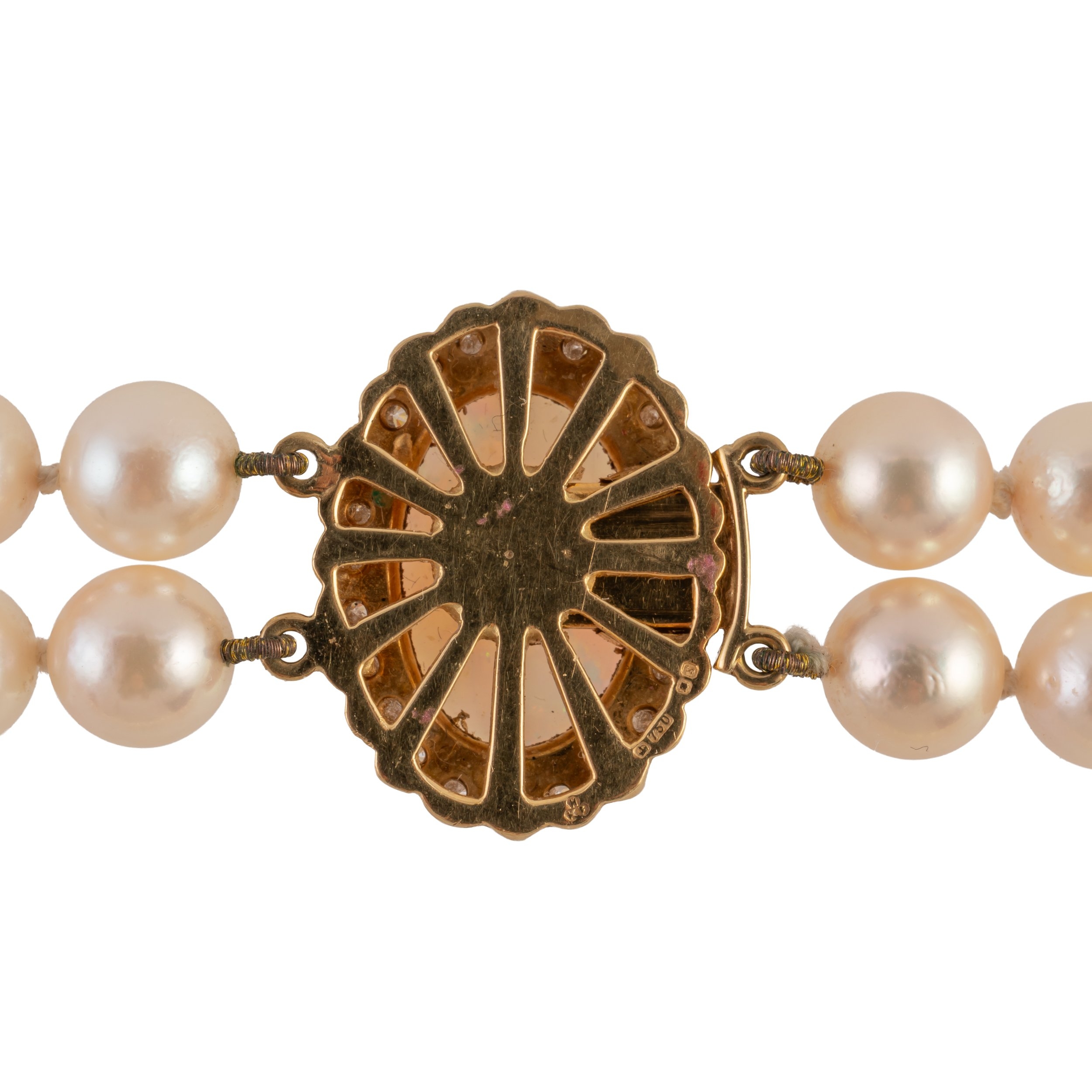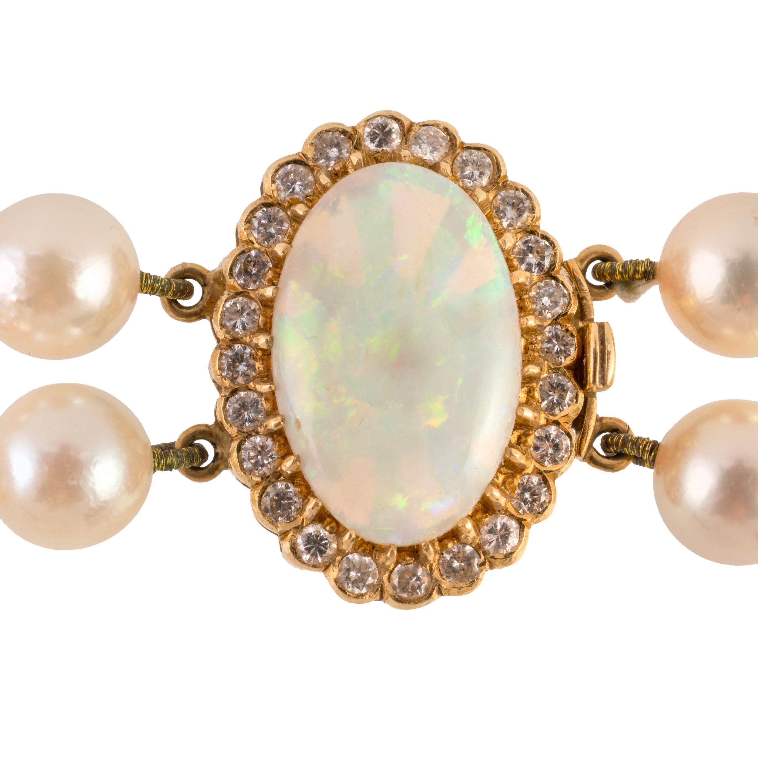 A TWO ROW PEARL NECKLACE WITH AN OPAL AND DIAMOND CLASP