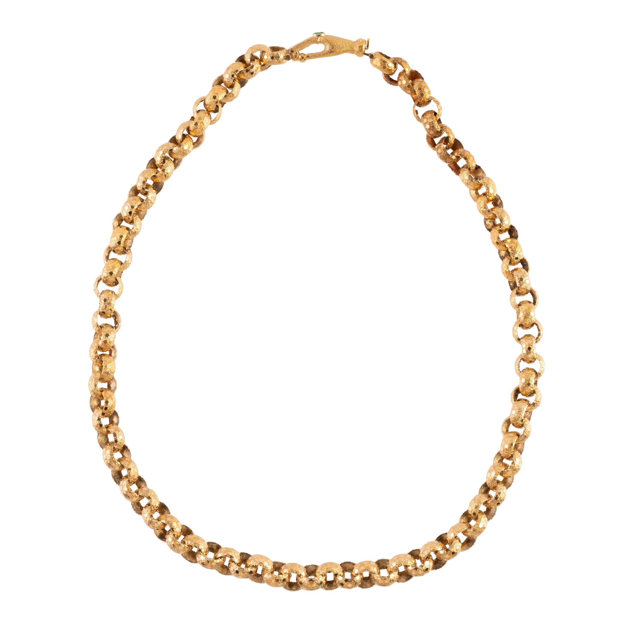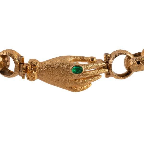 The belcher links textured with six point stars with a hand motif clasp set with an oval cut emerald to the pointer finger, measuring 45cm in length, in unmarked gold, gross weight 29 grams