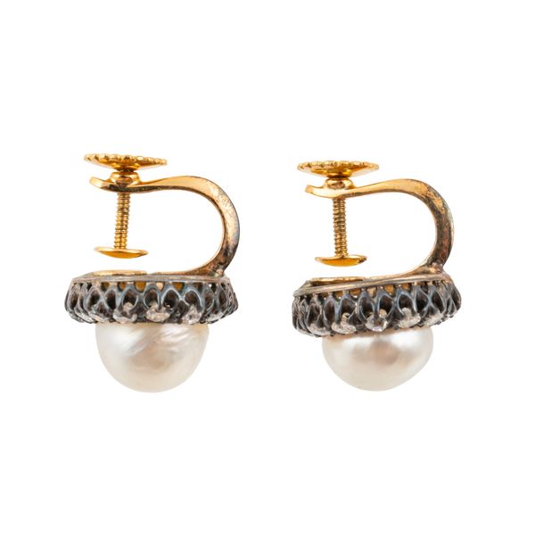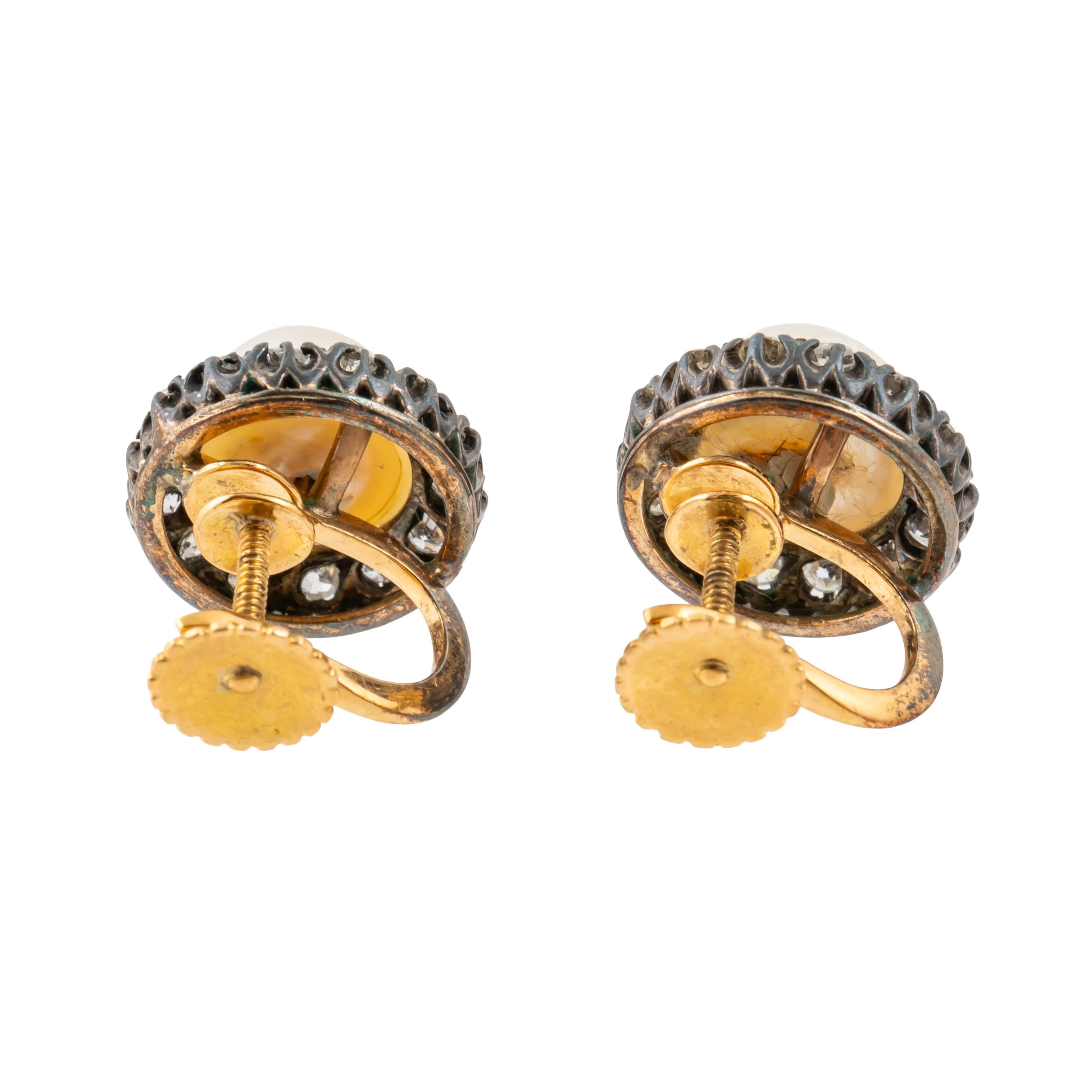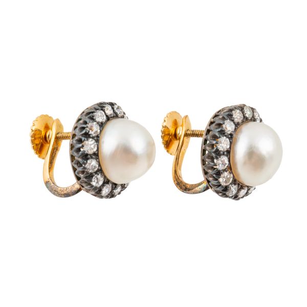 Each set with a central mabe pearl measuring 9.3mm in diameter, with a surround of old cut diamonds, in silver on gold screw back fittings for pierced ears, gross weight 7.9 grams
