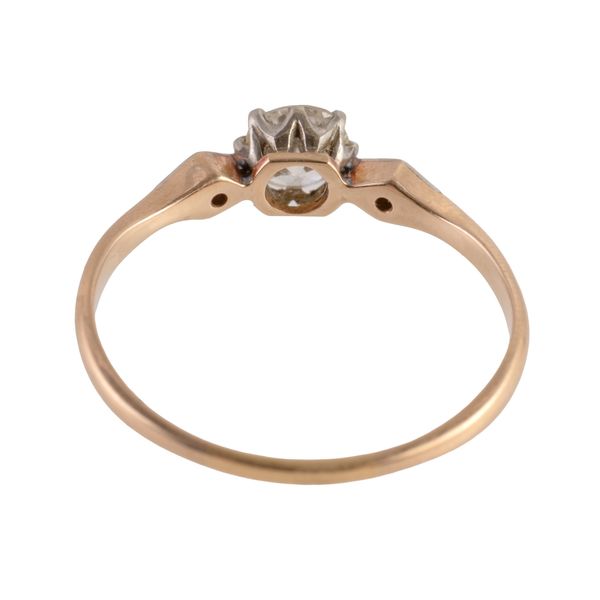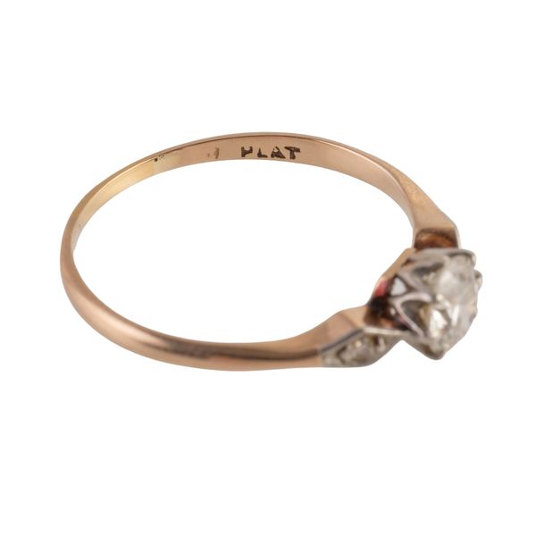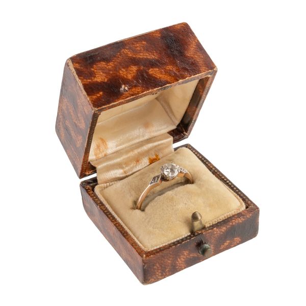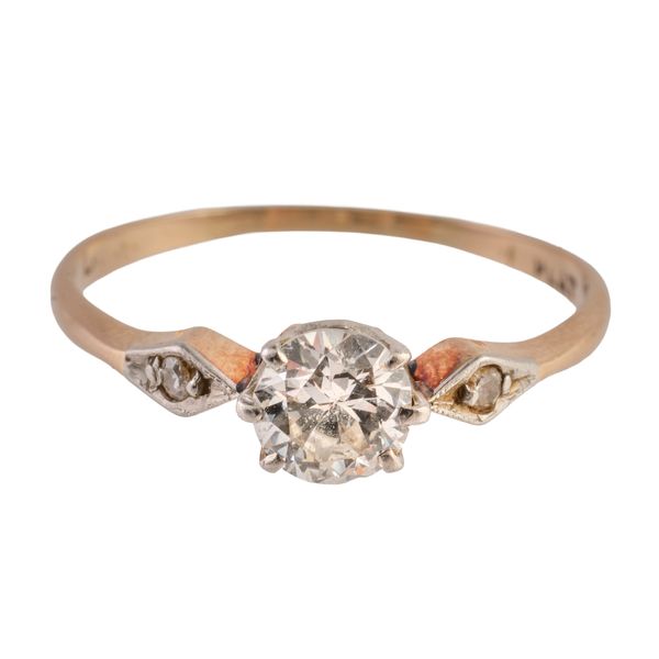 Mounted with a central round brilliant cut diamond weighing an estimated 0.47 carats, flanked either side by a single cut diamond, mounted in unmarked gold and platinum, size N, gross weight 1.5 grams, with a box