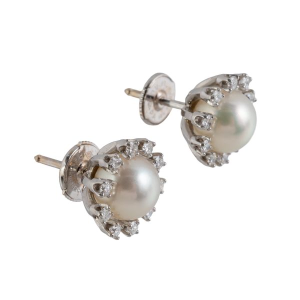 A PAIR OF PEARL AND DIAMOND EARRINGS