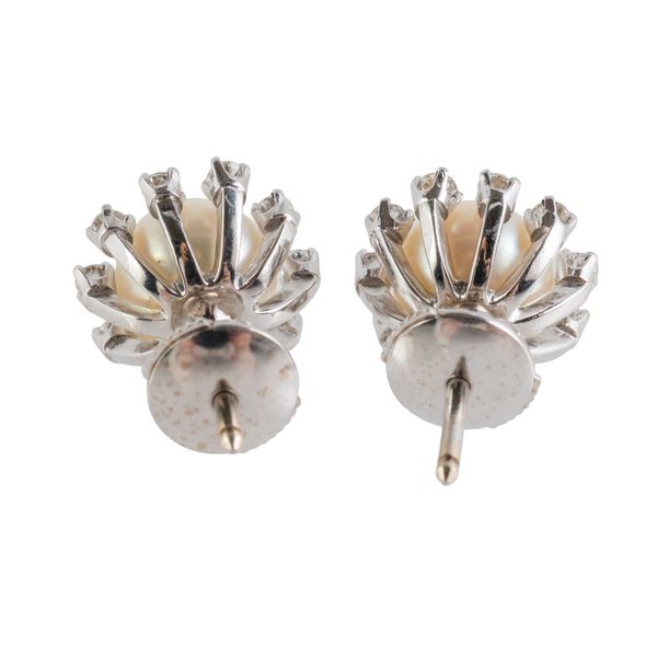 Each set with a central 8mm pearl with a surround of round brilliant cut diamonds, in 18ct white gold with post and butterfly fittings for pierced ears, gross weight 6.5 grams