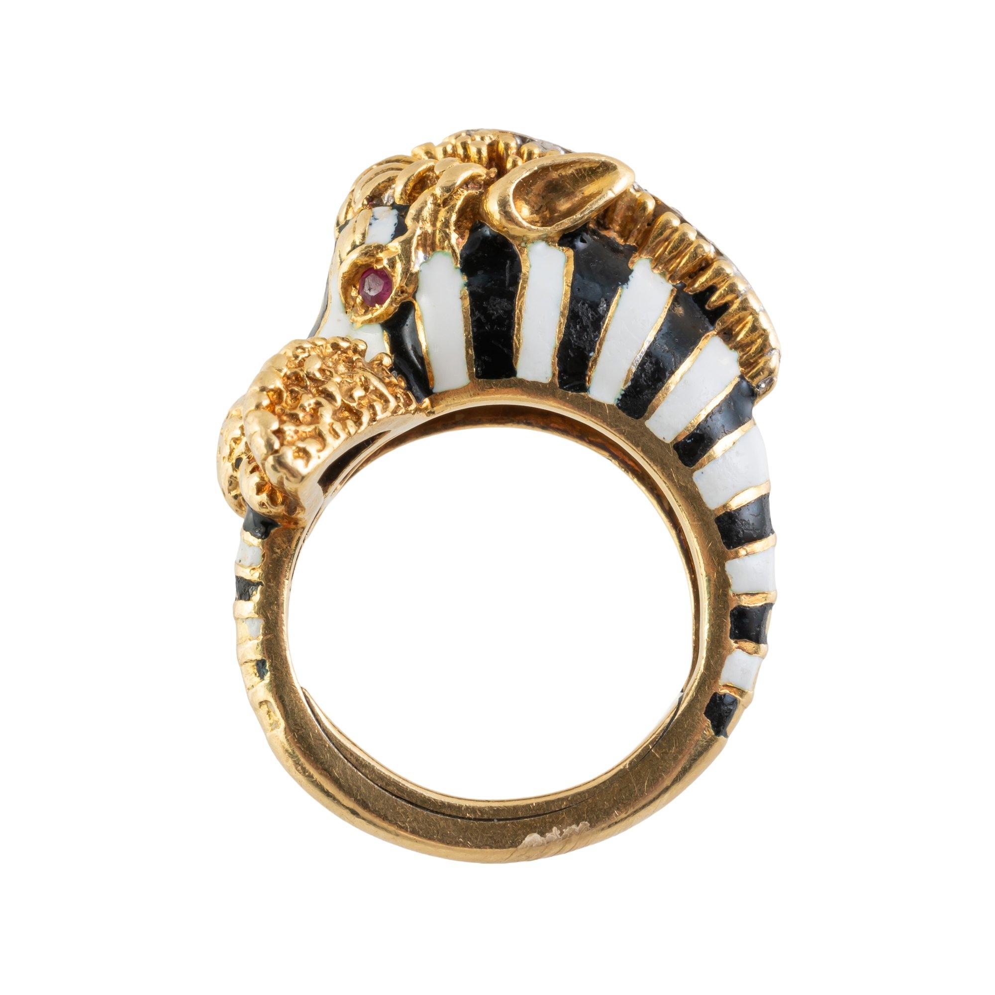 With black and white enamel, diamonds set to the mane and ruby eyes, with makers plaque to the inside of the ring, in 18ct gold, size K, gross weight 15.5 grams
