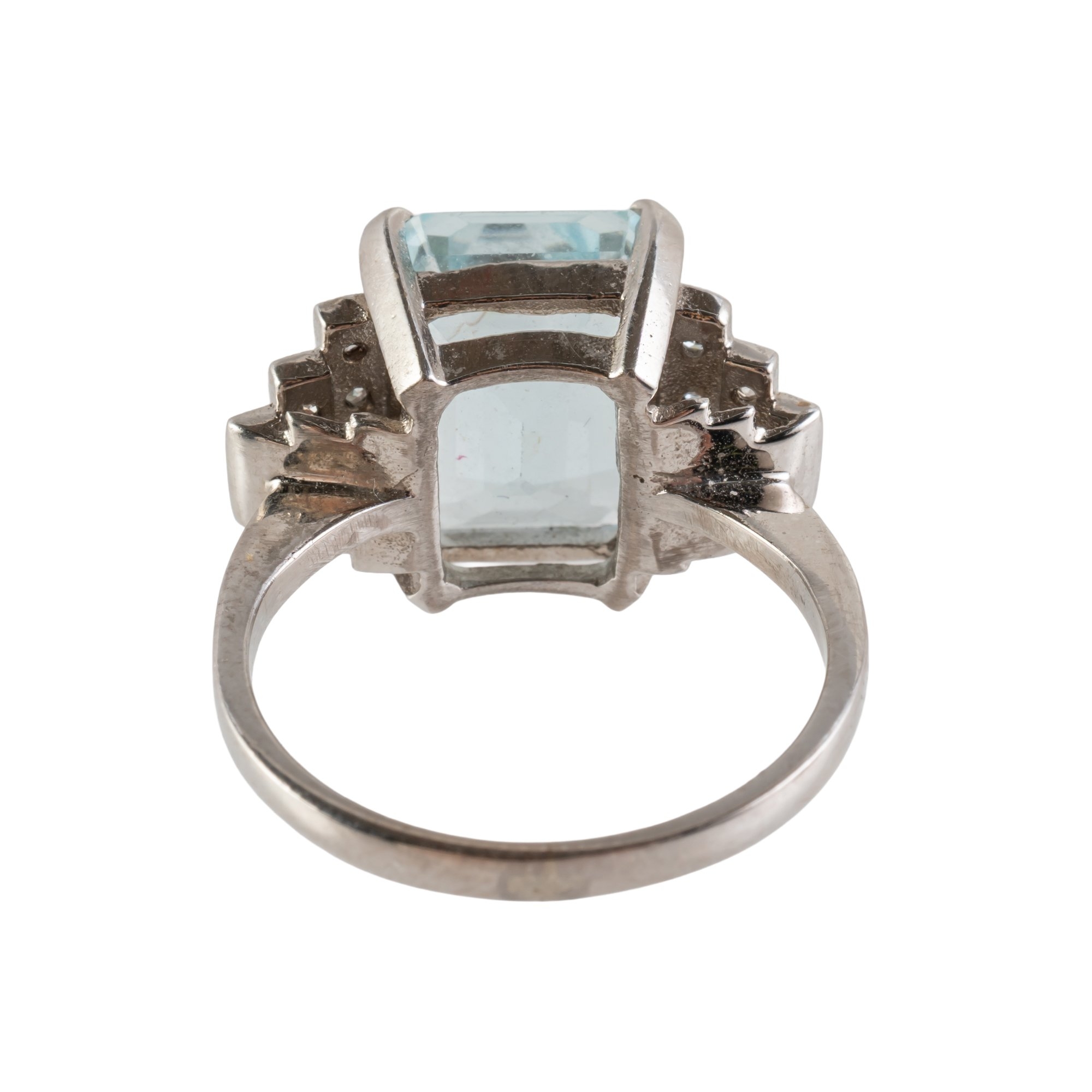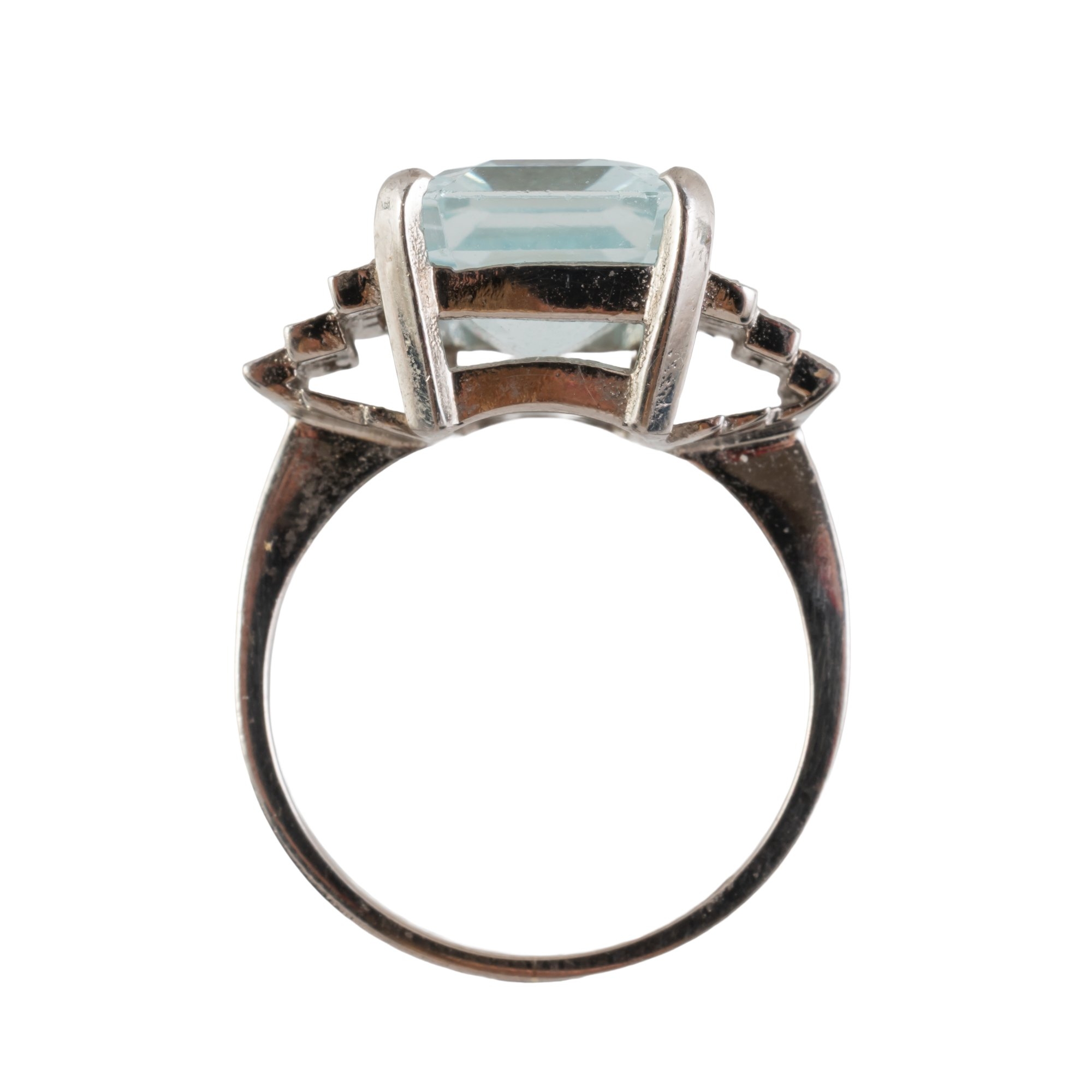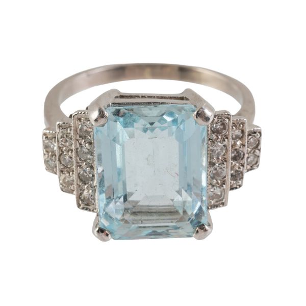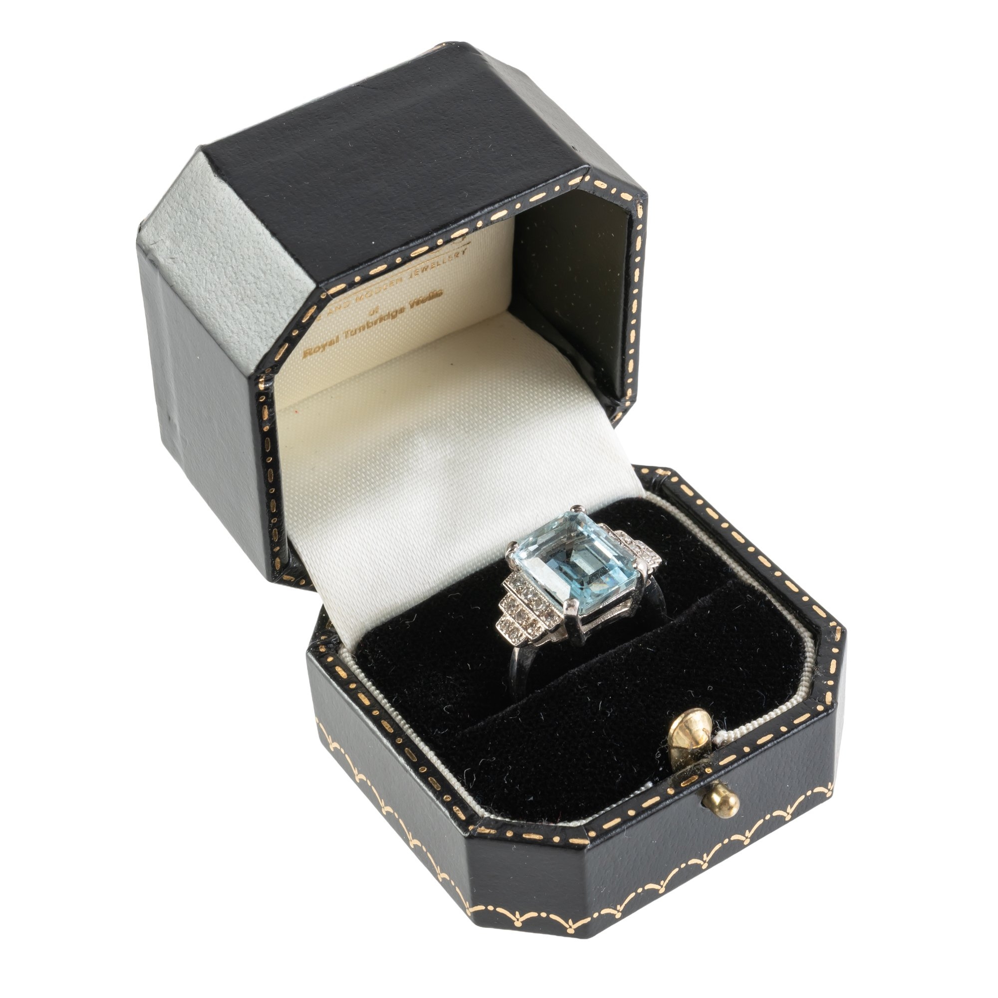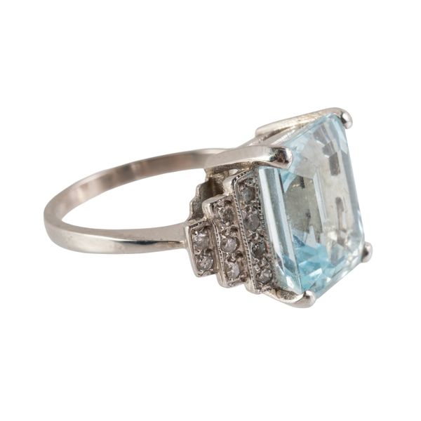 With a central emerald cut aquamarine measuring 12.31mm x 9.25mm x 6.18mm, with an estimated weight of 5.17 carats, claw set, and flanked either side by three graduating rows of single cut diamonds, in unmarked white metal tested as 18ct white gold, size M½, gross weight 6.5 grams, with box and outer box